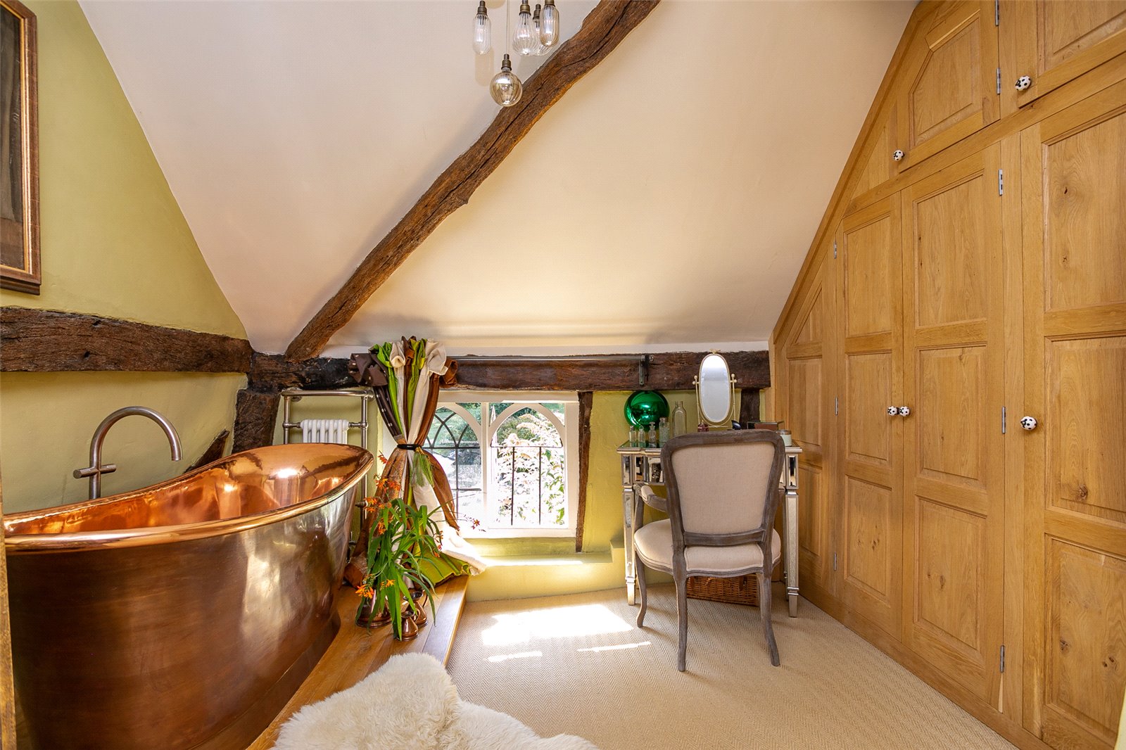 The house itself is a harmonious blend of two sides, each offering its own unique charm. On one side, you'll find a beautifully extended kitchen with British Stone flooring, a dining room with low ceilings, and a master suite boasting a copper bath and a walk-in dressing room that can also serve as a fourth bedroom. The ensuite bathroom features underfloor heating and a dual shower, adding a touch of luxury.
