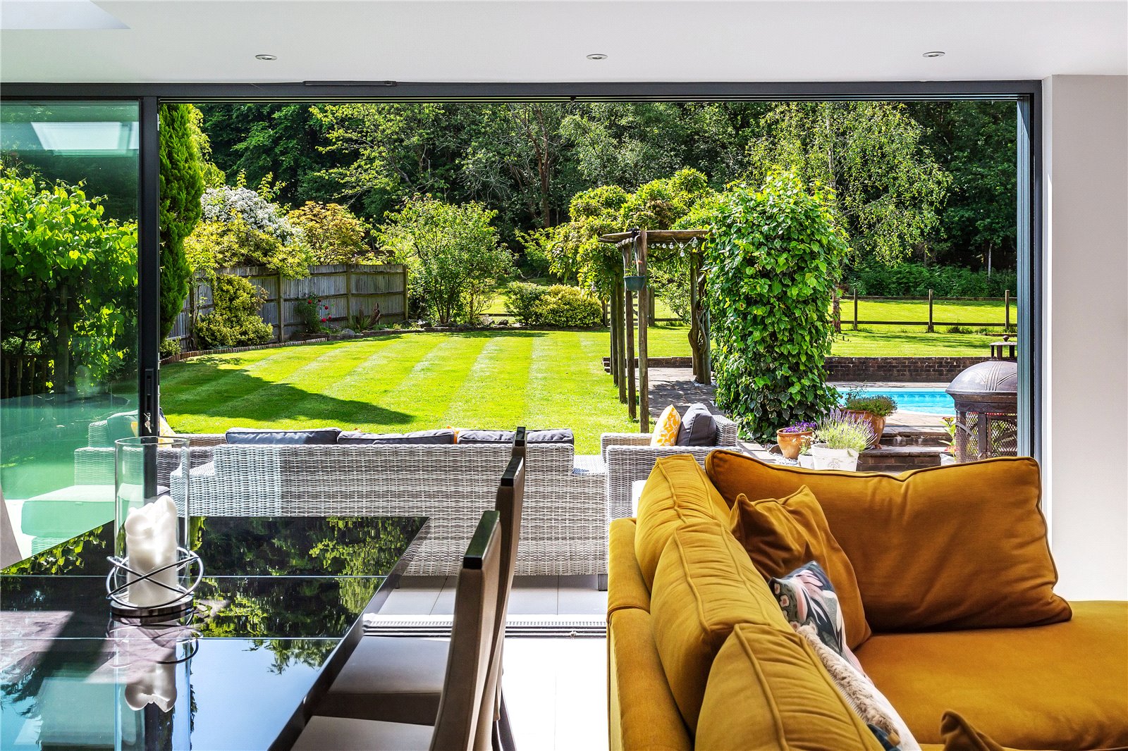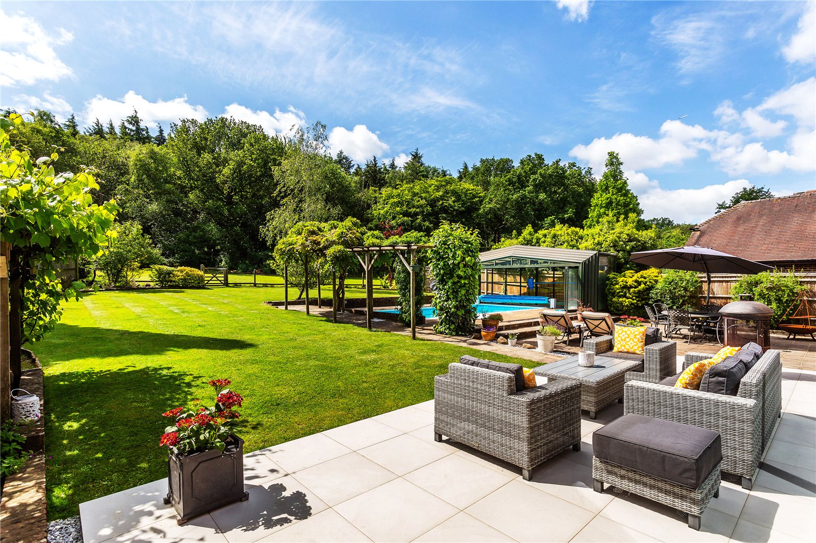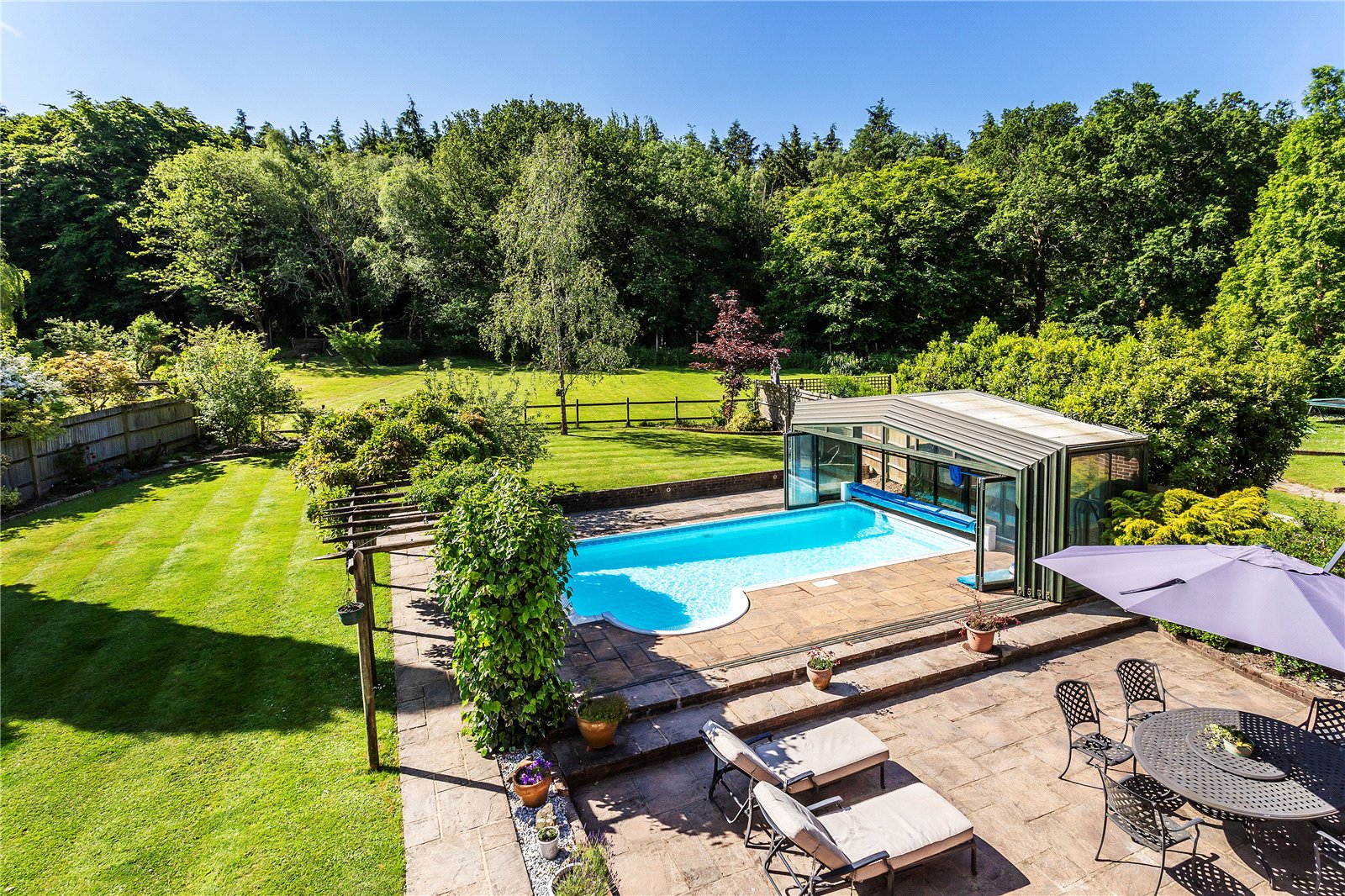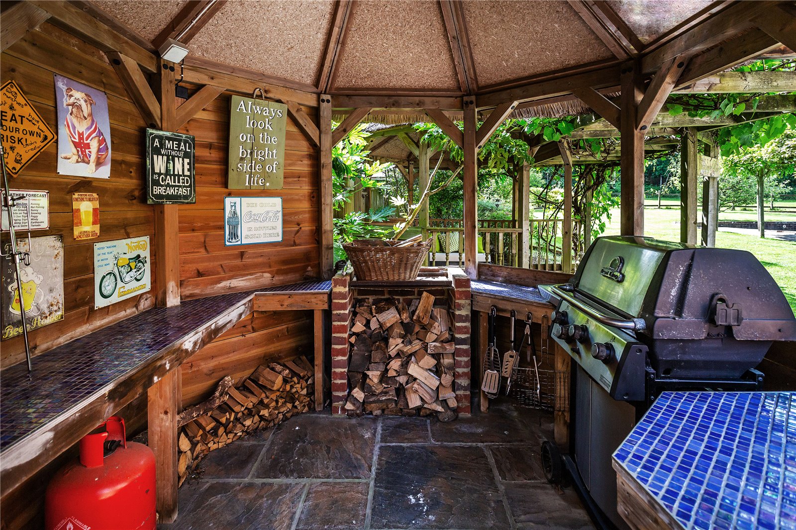 The south-facing back garden is designed with summer entertaining in mind, from stepping out onto the patio to the thatched BBQ area and pergola draped with an established vine, and from the heated swimming pool to the meadow at the end of the garden, which can be opened up to be more garden, should you wish. It is a magical place with a fabulous blend of space and tranquillity surrounded by woodland.