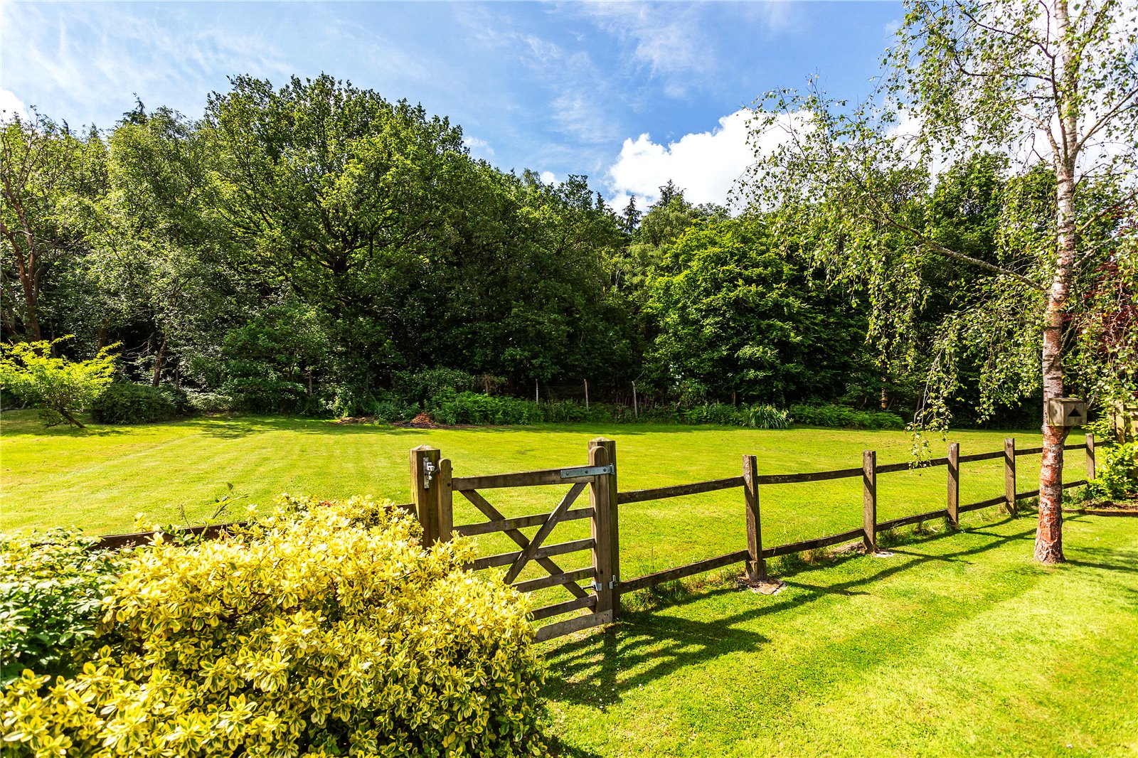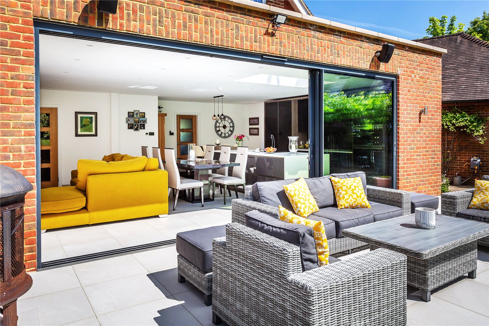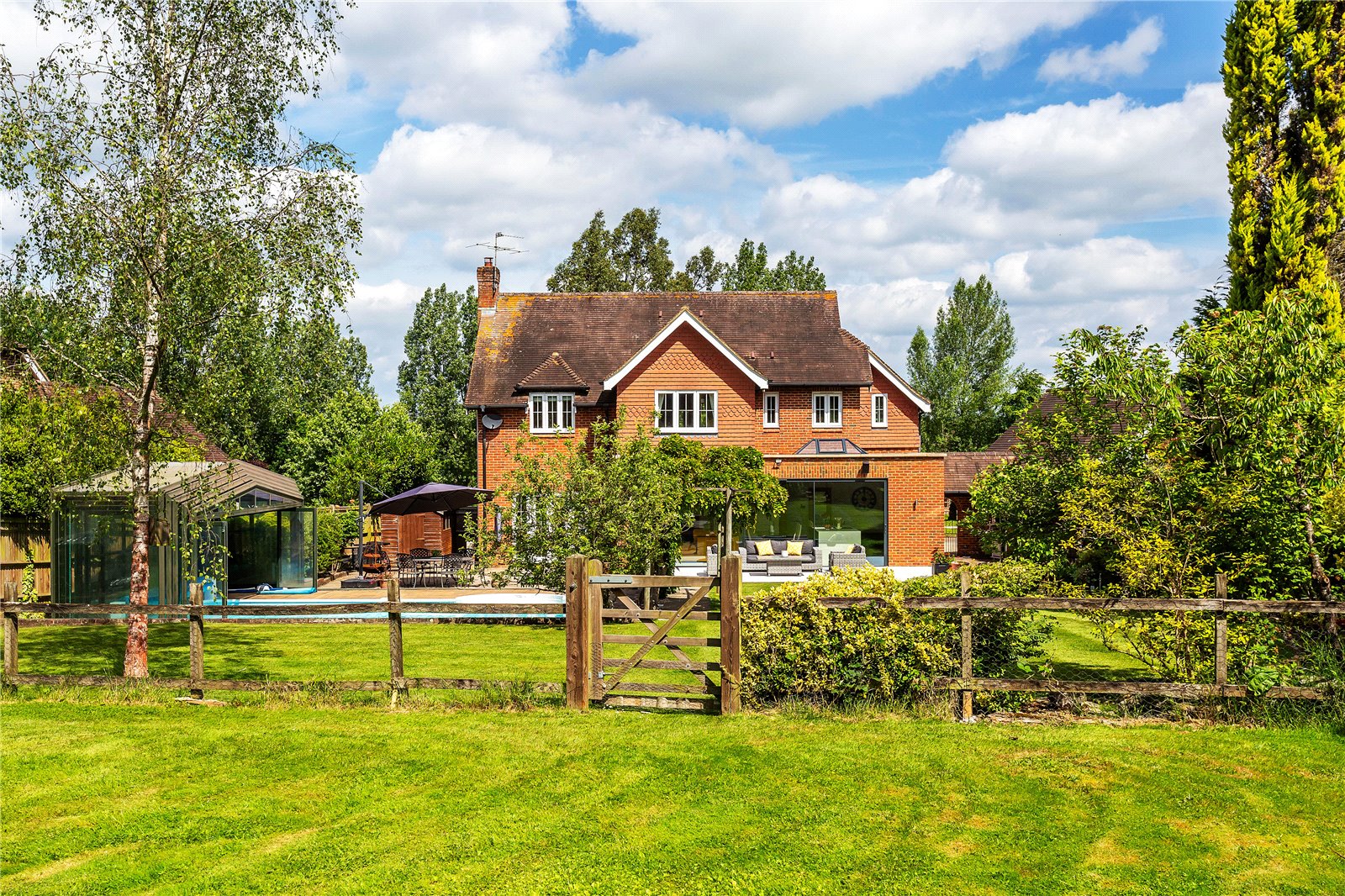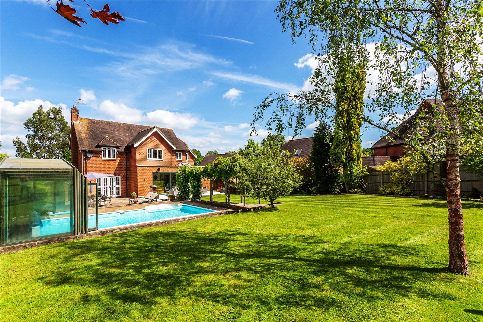 The south-facing back garden is designed with summer entertaining in mind, from stepping out onto the patio to the thatched BBQ area and pergola draped with an established vine, and from the heated swimming pool to the meadow at the end of the garden, which can be opened up to be more garden, should you wish. It is a magical place with a fabulous blend of space and tranquillity surrounded by woodland.