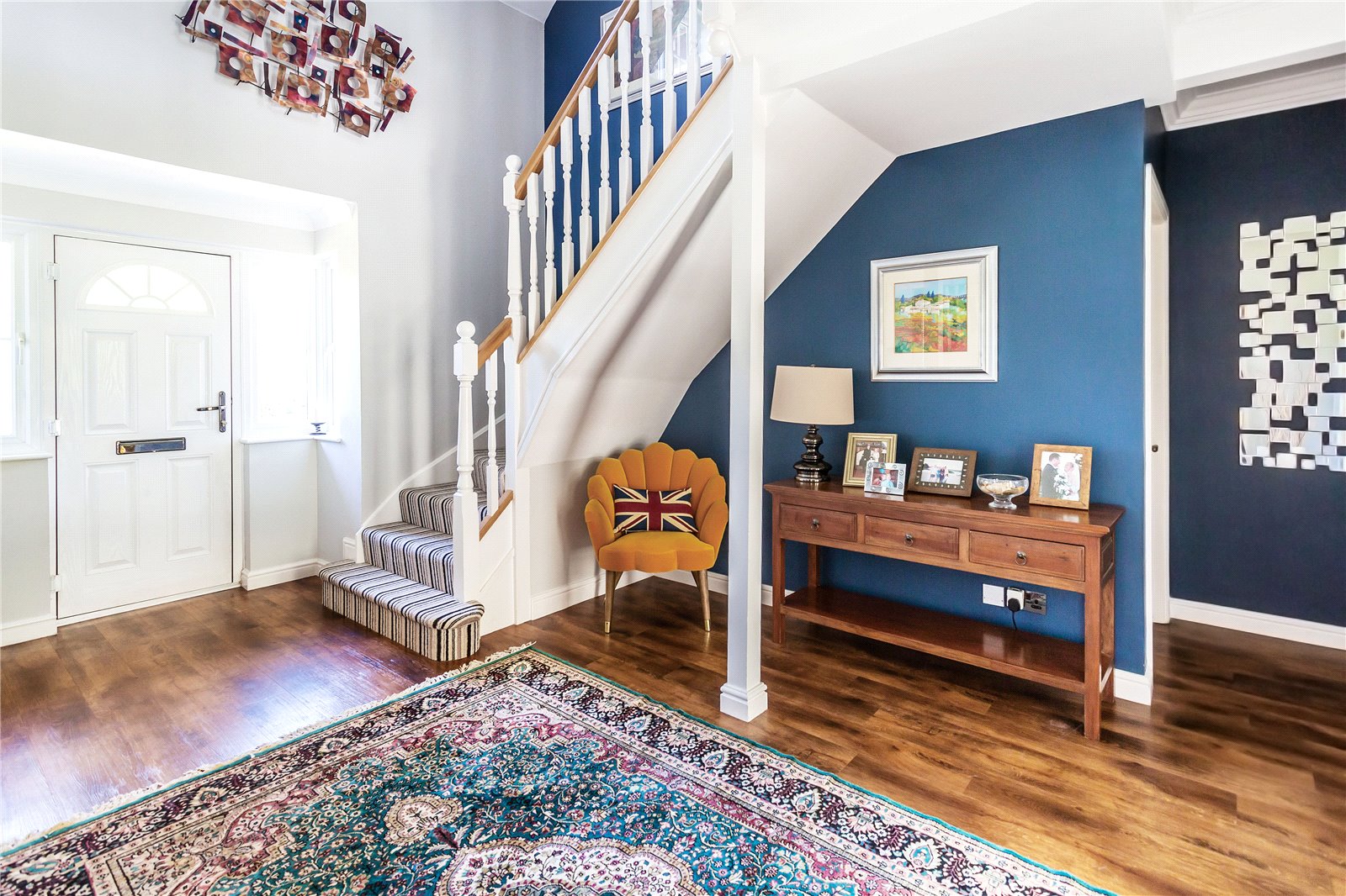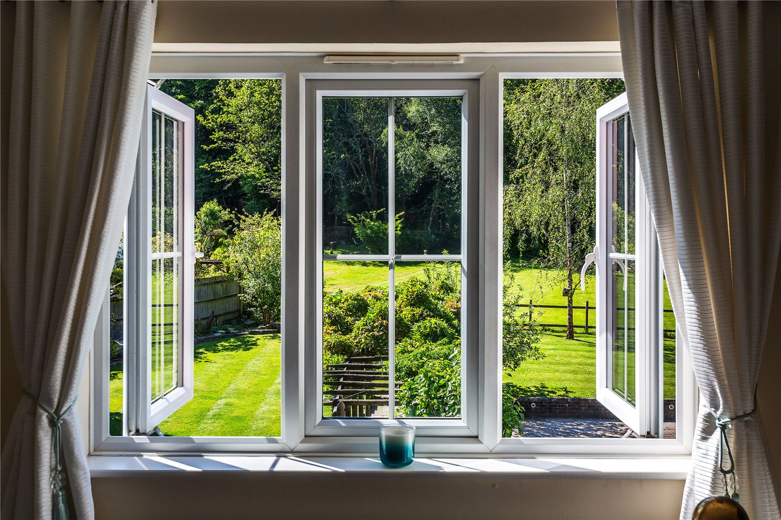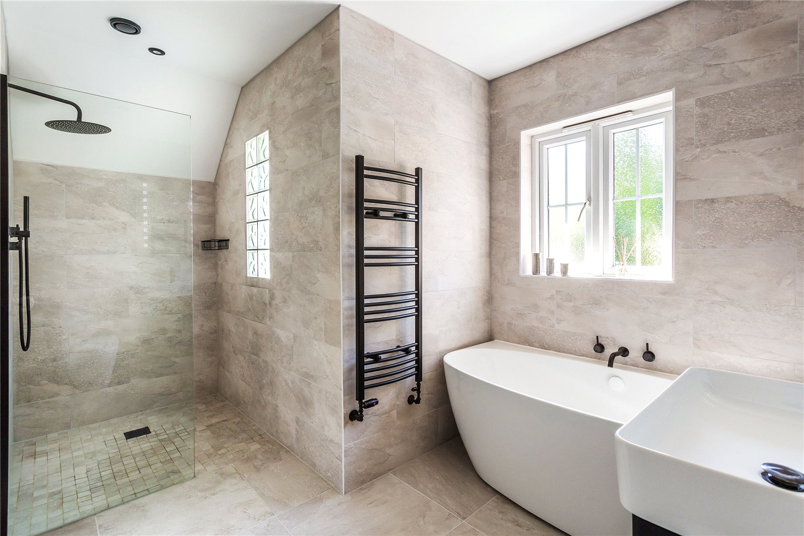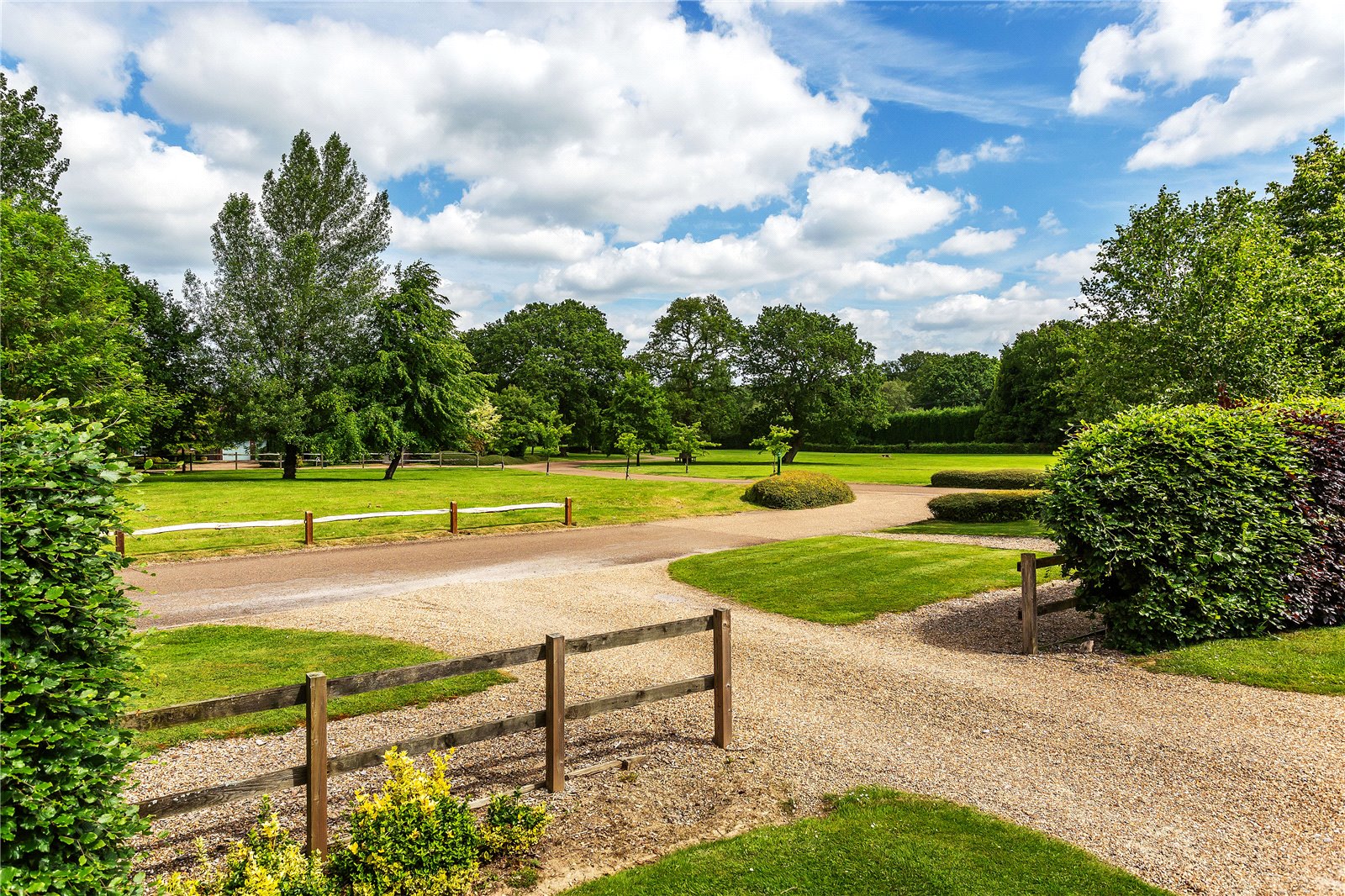The south-facing back garden is designed with summer entertaining in mind, from stepping out onto the patio to the thatched BBQ area and pergola draped with an established vine, and from the heated swimming pool to the meadow at the end of the garden, which can be opened up to be more garden, should you wish. It is a magical place with a fabulous blend of space and tranquillity surrounded by woodland.