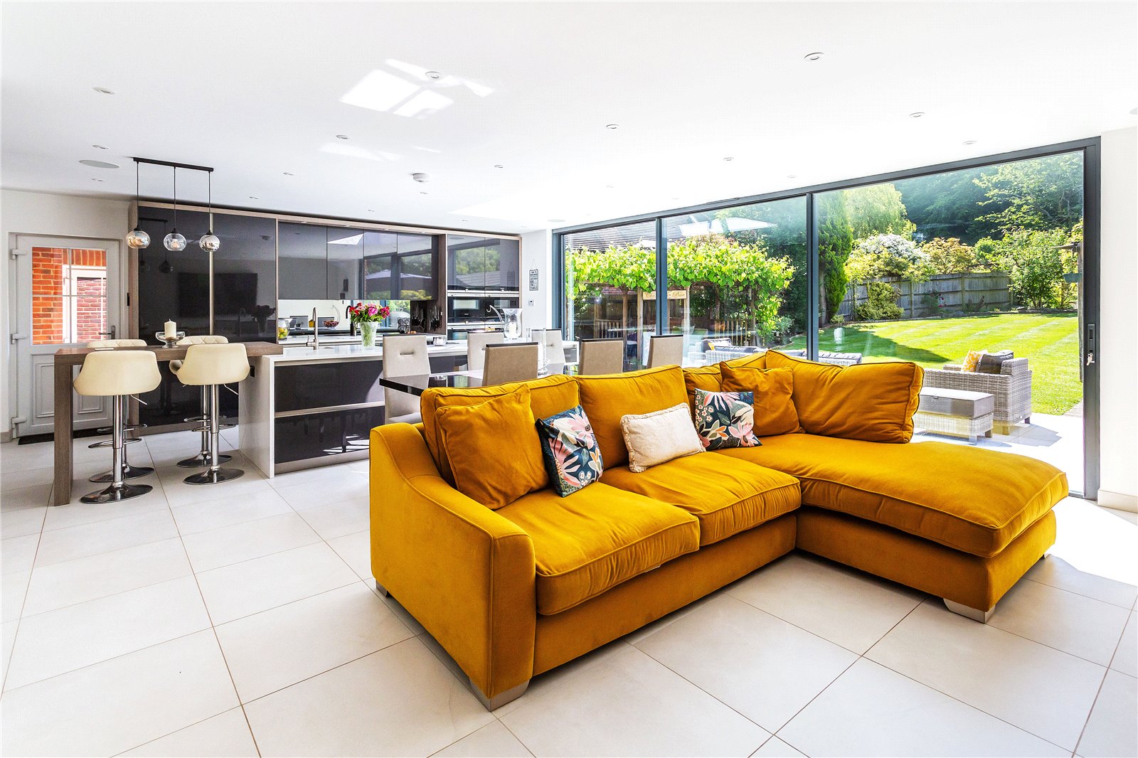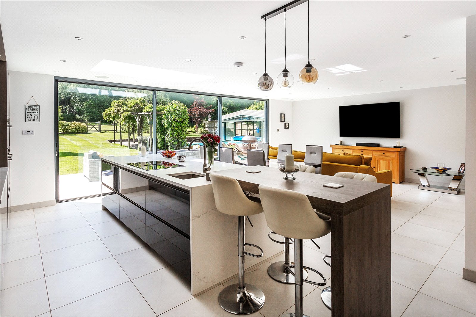 Step inside to discover a perfectly extended space designed by the current owners, which is now a stunning south-facing kitchen/diner/family room ideal for family life and entertaining. With underfloor heating, surround sound, and sleek sliding doors that seamlessly blend indoor and outdoor living.