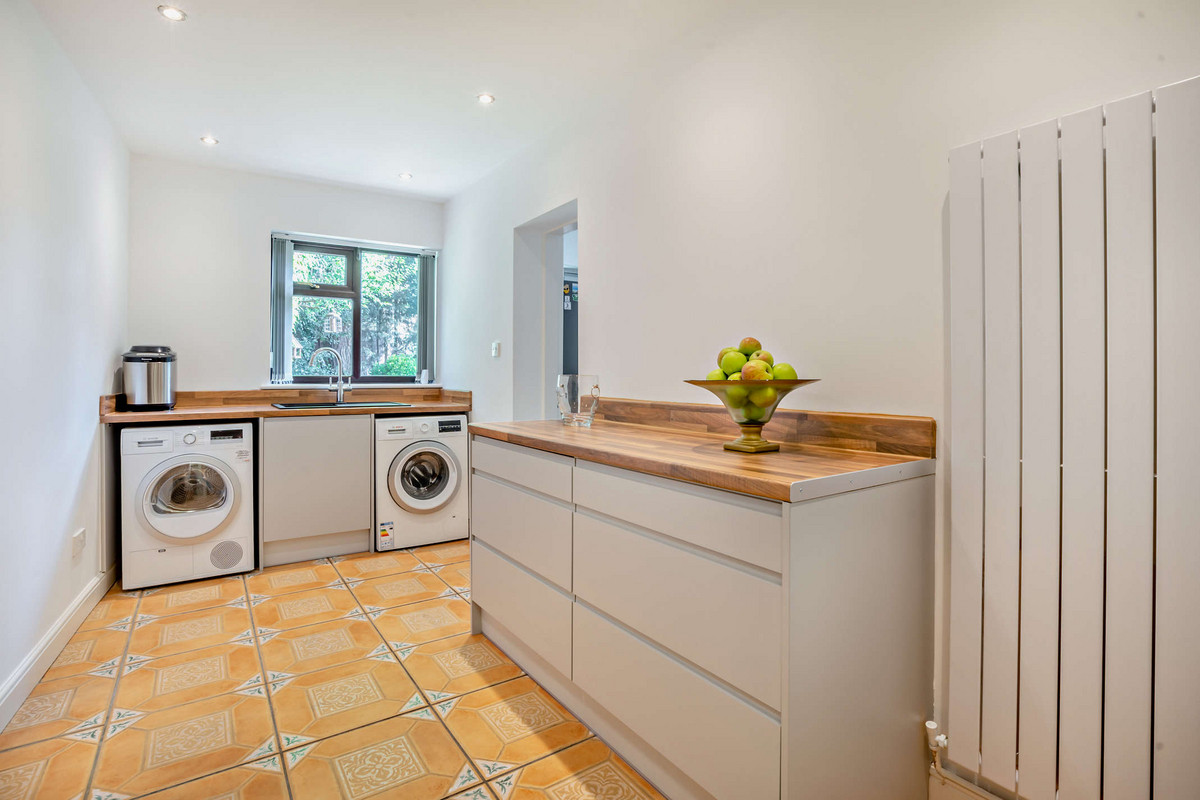 This area leads to a sizable utility room, providing space for a washer and dryer beneath a work surface with a granite sink. A large storage unit complements a cloakroom and boot storage area. Off the utility room is a WC and a boiler room, which includes a broom cupboard and access to the garage.