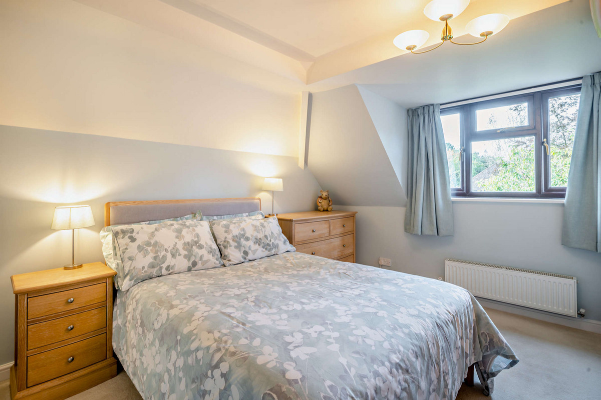 The principal bedroom, a warm and welcoming space, offers views of the rear garden and includes an en-suite bathroom. The roof eaves are fitted with lighting and provide ample storage space.