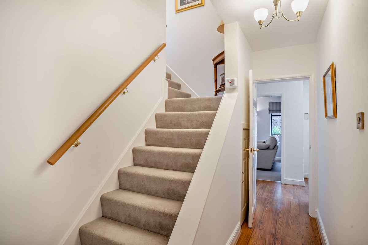 The sheltered main entrance opens into an inviting reception hall. From here, doorways branch off to the living room, the kitchen/dining area, and a second hallway that accesses the two ground-floor bedrooms, the family bathroom, and the staircase to the upper level.