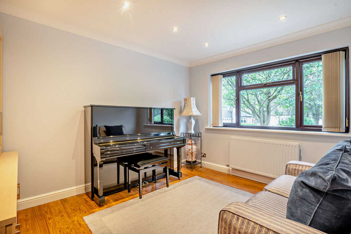 Located off the second hallway, bedroom three, presently used as a music room, benefits from abundant natural light and views of the front garden through a large window.