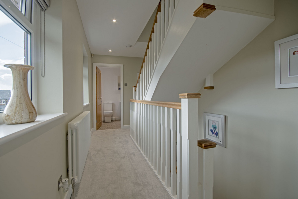 The upper level is arranged around a skylit mezzanine landing and provides two additional double bedrooms, both with dual-aspect views. A sleek shower room with rainfall shower completes this floor, making it ideal for young adults or extended family.