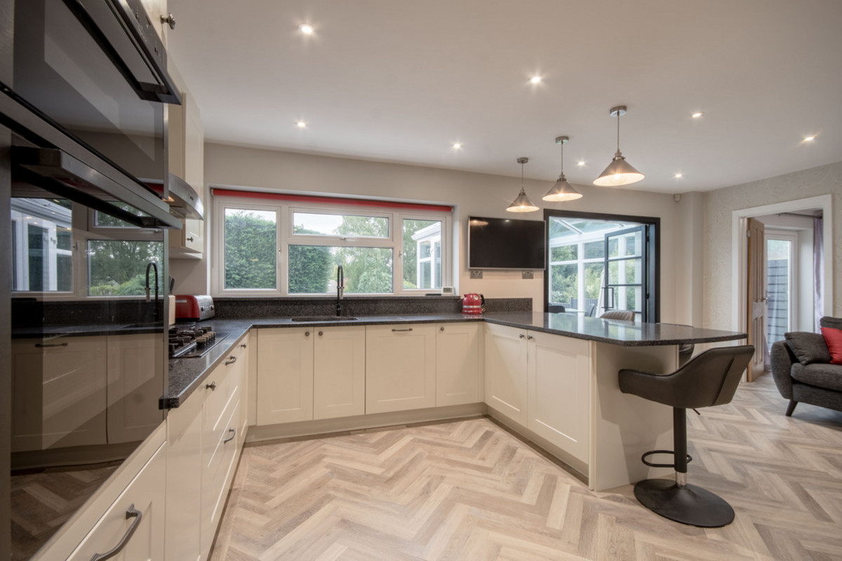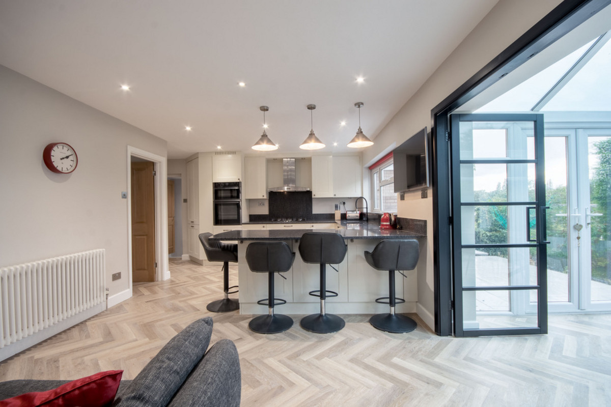 The heart of the home is a bespoke open-plan kitchen and living area, fitted with an extensive range of high-quality cabinetry, soft-close storage, and granite work surfaces. Premium NEFF appliances, including a double oven and dishwasher are all integrated, while a breakfast bar provides a casual dining spot. Beyond, sleek Crittall doors lead into a stunning garden room, where floor-to-ceiling glazing floods the space with natural light and offers uninterrupted garden views—a perfect space for year-round dining or relaxation.