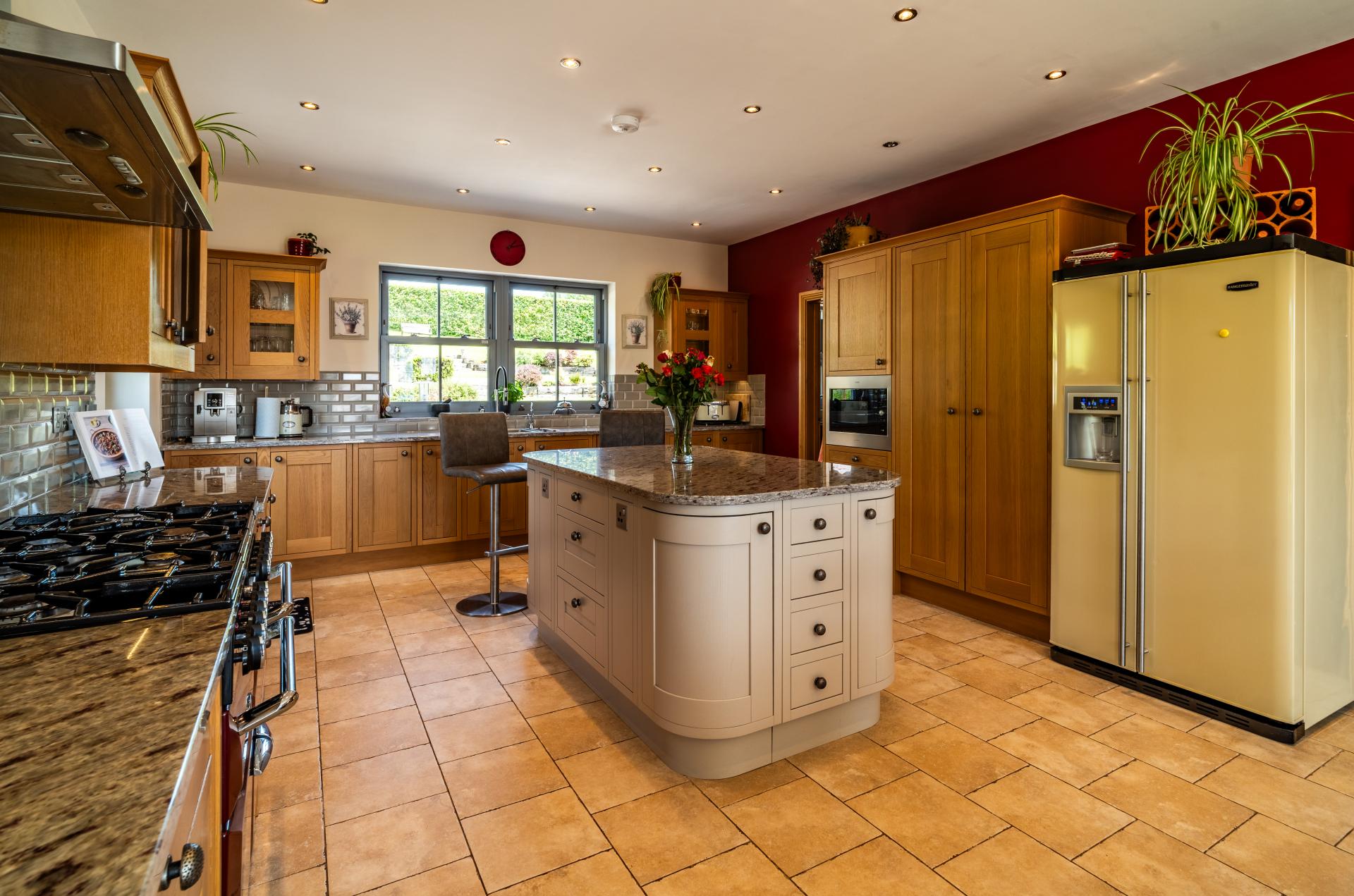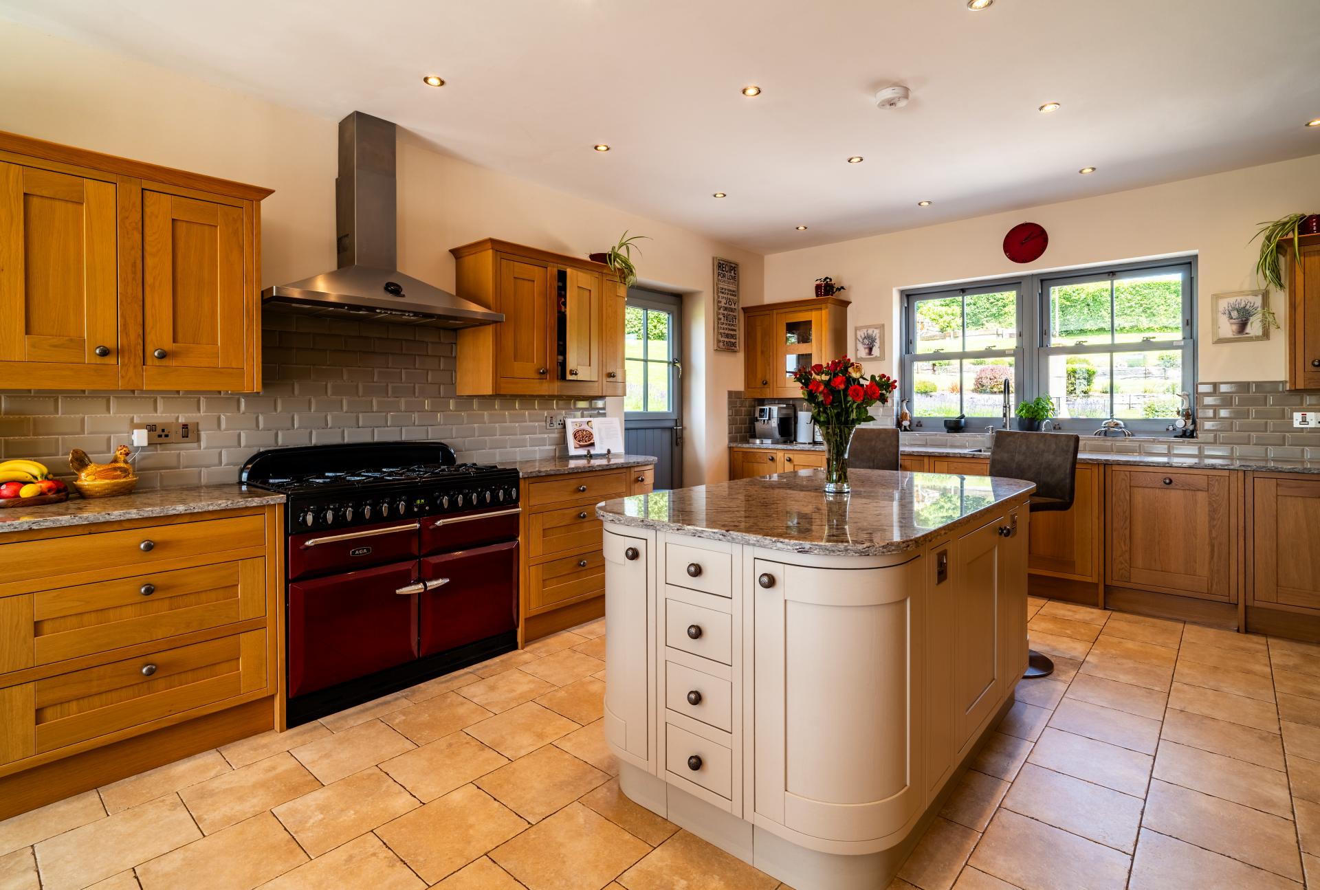 1 1/2 bowl stainless steel sink unit with chrome mixer tap (the little tap is a near boiling hot tap and filtered cold) set in granite work surface with tiled surround. Fitted oak base and wall cupboards. Integrated AEG microwave; Bosch dishwasher; Aga dual fuel gas range with extractor hood above. Larder cupboards. Central island with granite breakfast bar. French doors on two elevations to the patio. Ceiling downlighting. Stable style door to side elevation. Limestone tiled floor with underfloor heating.
