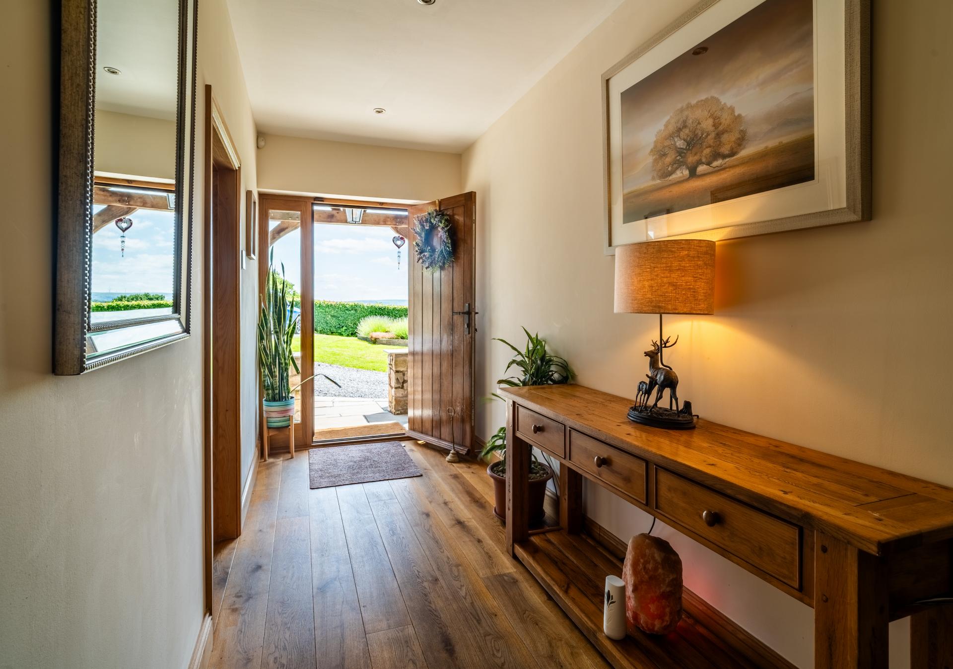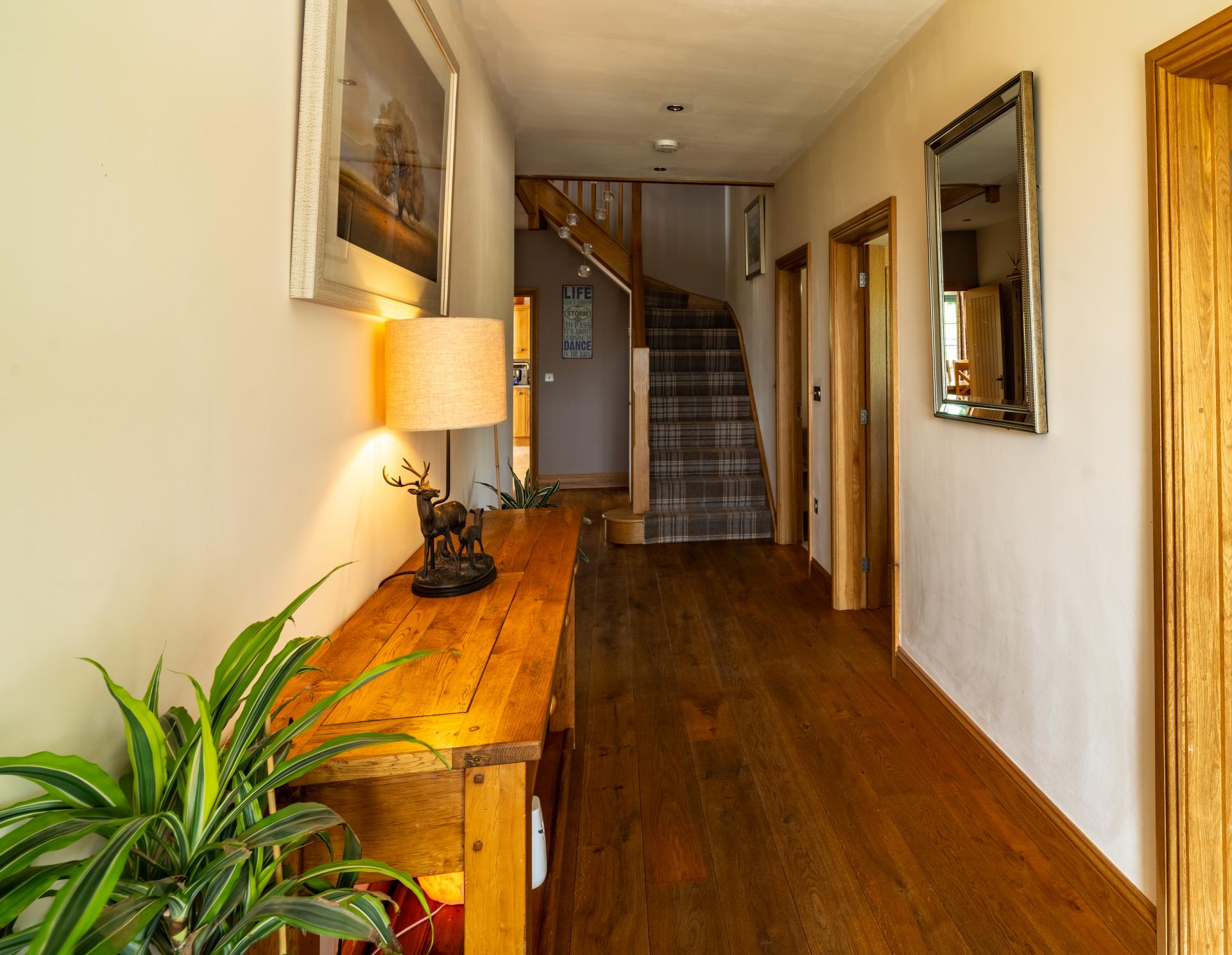 Impressive oak stairs to the first floor. Access to the stairs cupboard. Oak floor with underfloor heating. Ceiling downlighting.