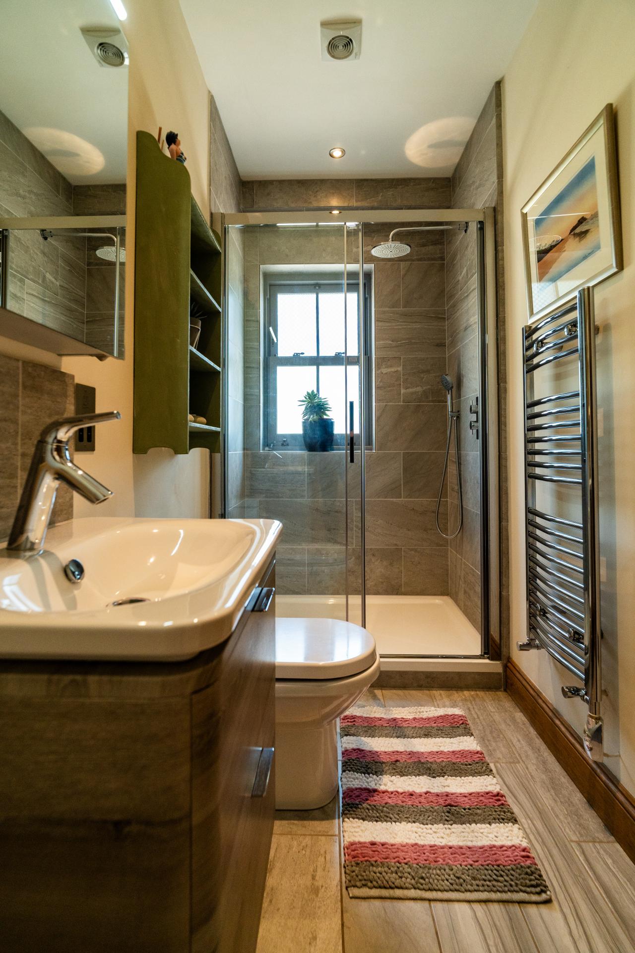 Fitted with a storage cupboard with shelves and radiator. Pedestal basin, shower cubicle and toilet.