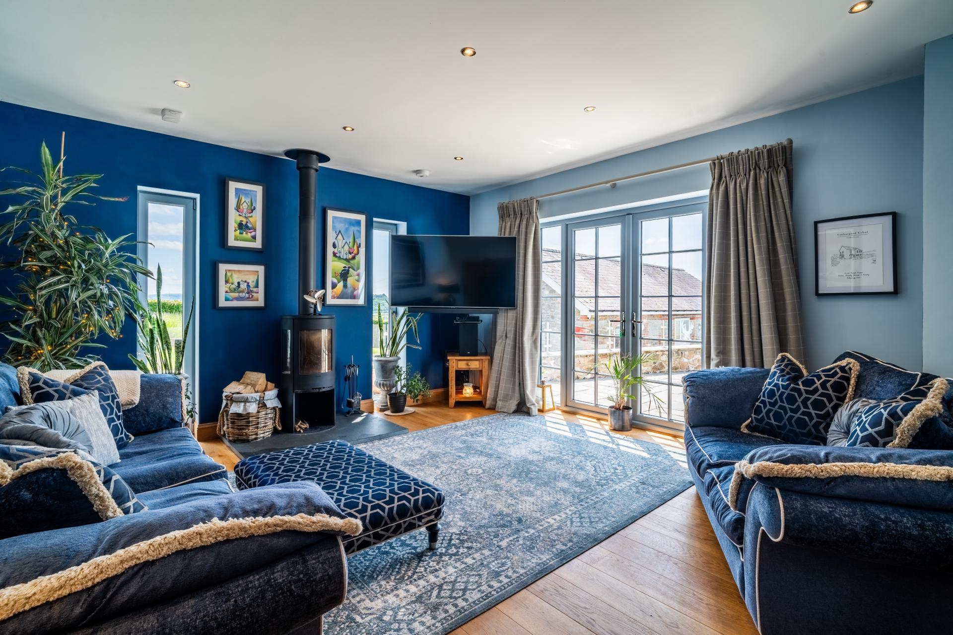 Contura multifuel stove on slate hearth. French doors to a large paved patio. Oak floor with underfloor heating.