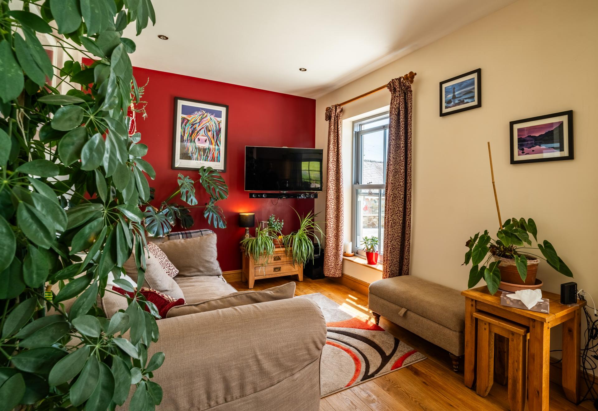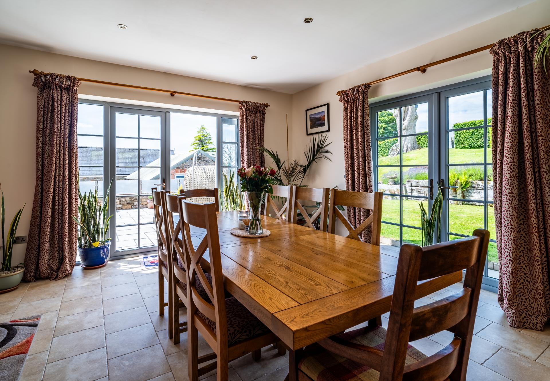 Patio door with fabulous views. Attractive area pointed stone wall. Ceiling downlighting. Stairs to first floor. Oak floor. Radiator.