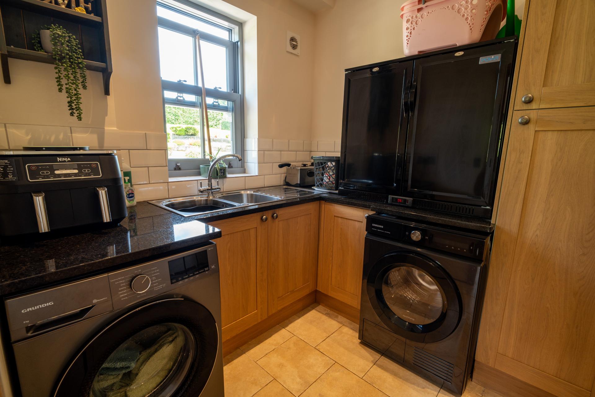1 1/2 bowl stainless steel sink unit with mixer tap set in granite work surface. Hotpoint ceramic hob and oven with extractor hood above. Integrated fridge, freezer and dishwasher. Stone-effect tiled floor. Stable style door to front elevation. Radiator.