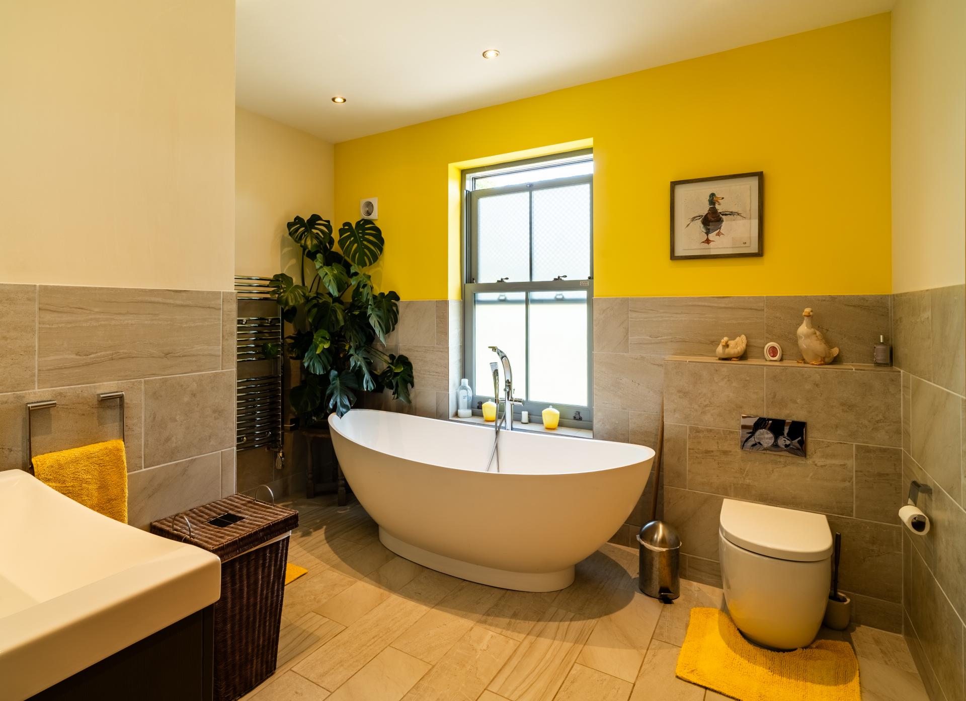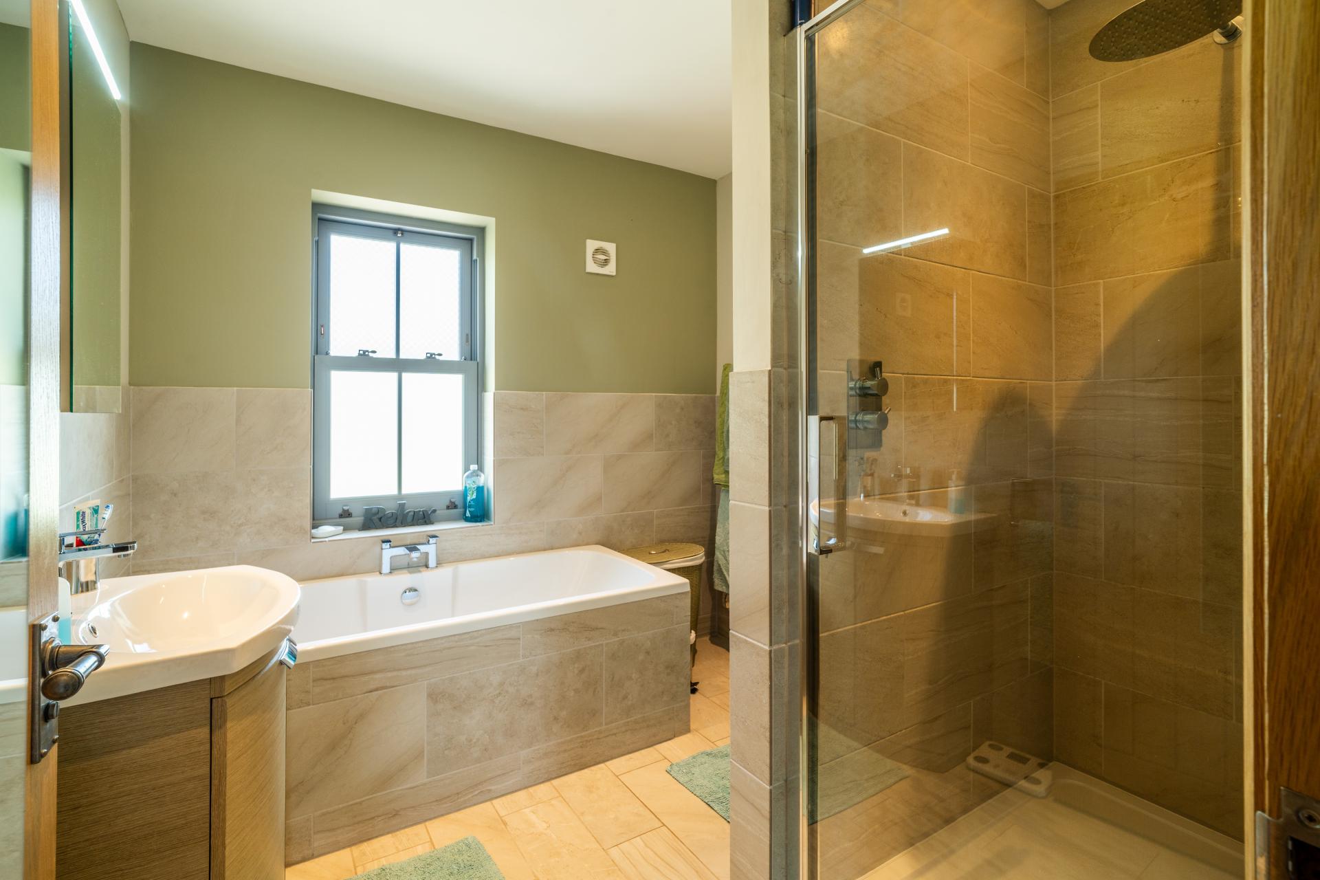 Free-standing slipper-style bath with a shower mixer tap. Basin with mixer tap on vanity. Shower in a tiled and glazed cubicle. Illuminated mirror and vanity socket. Ceramic part-tiled walls and floor with underfloor heating. Ceiling downlighting. Chrome towel heater.