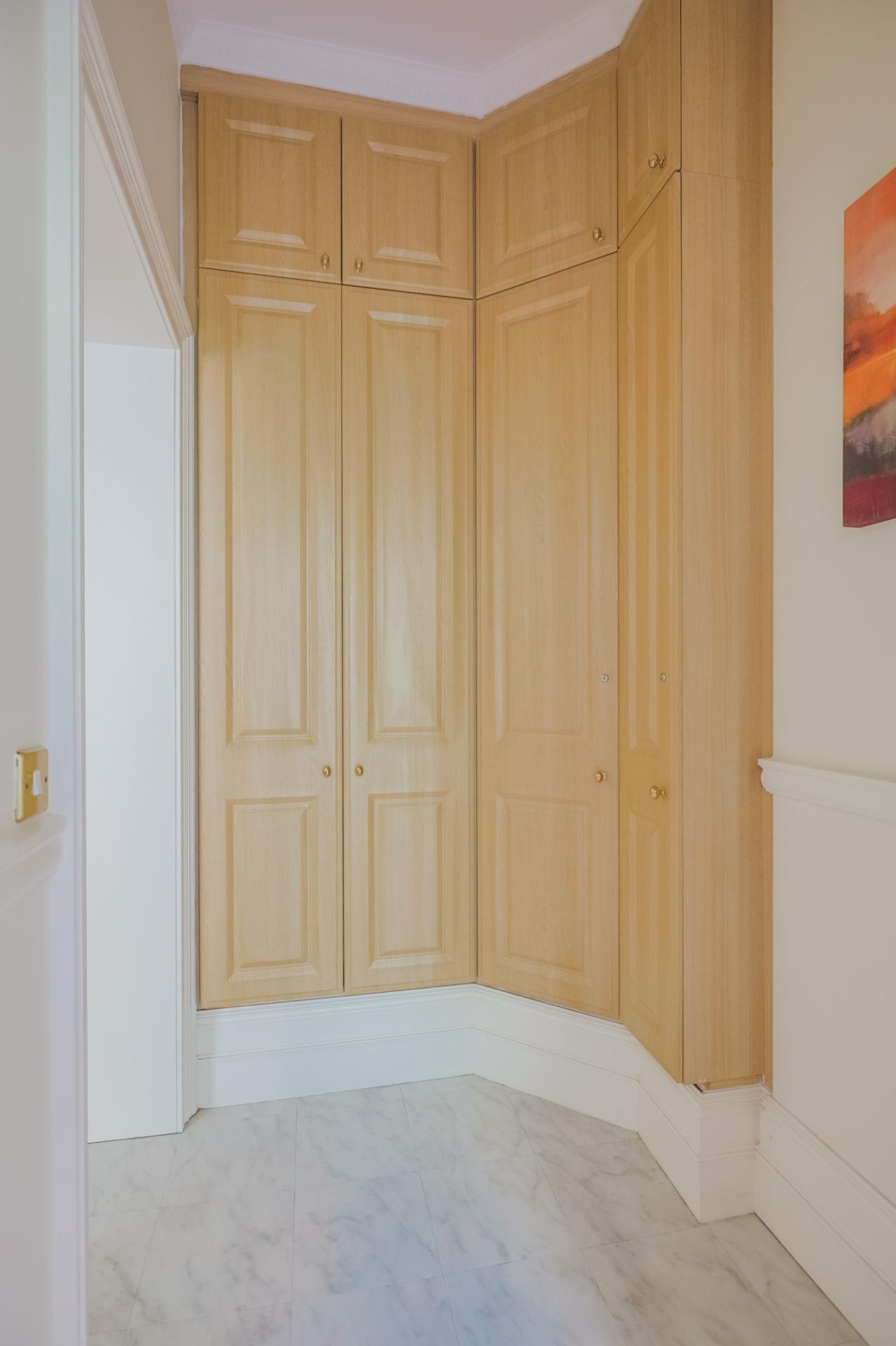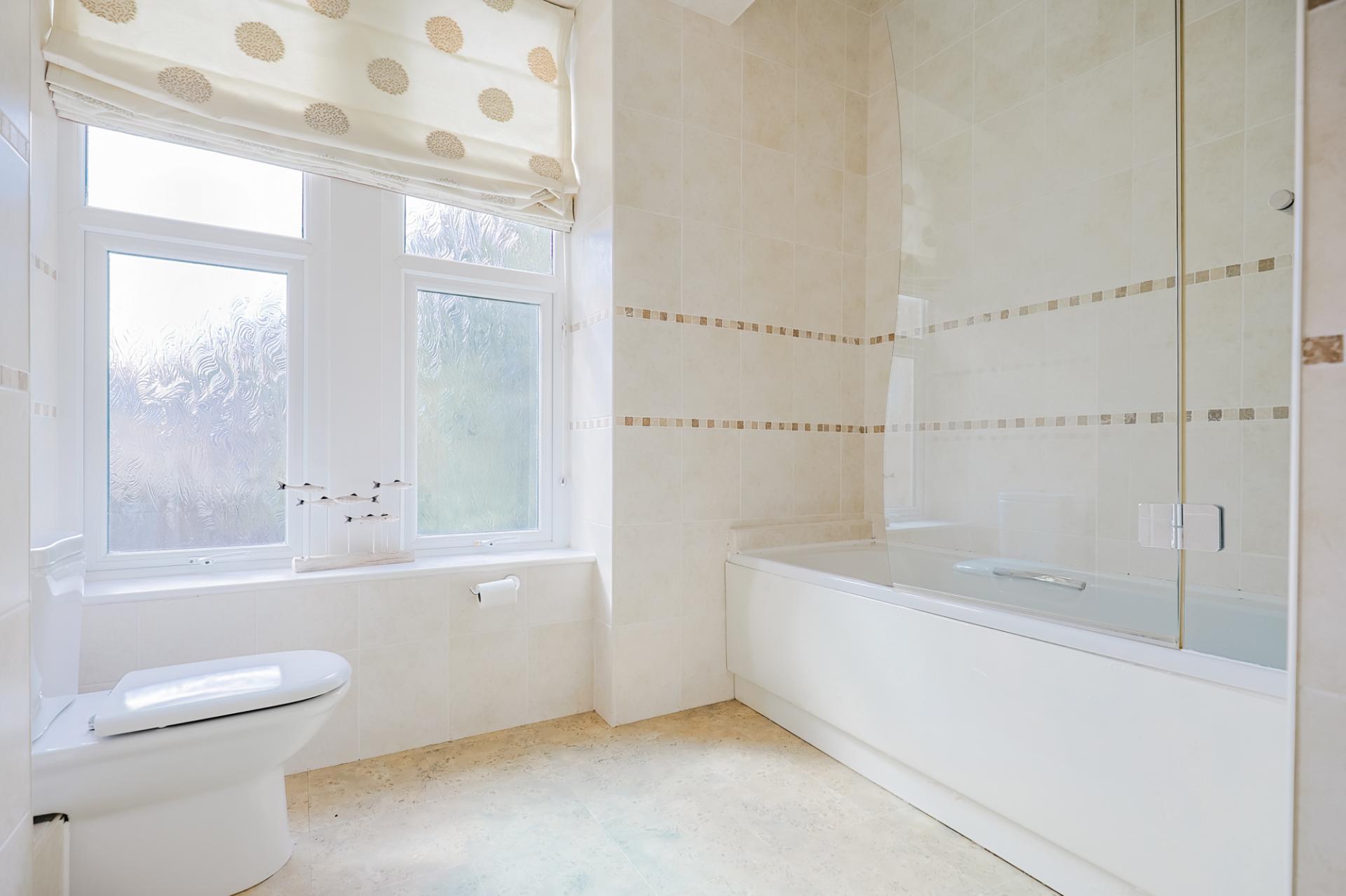 Bedroom two with en-suite is a beautiful, large space laid with carpet. Straight away, you will notice the huge double sash window to the rear, allowing natural light and overlooking mature trees. This large bedroom also has the pleasure of a dado rail and built-in wardrobes with pull-down hanging rails, drawers, and storage cupboards. The en-suite, a private addition to the room, houses a WC, wash basin, walk-in shower, heated towel rail, two shaving points, shaving light with an additional shaving point, spotlighting, an extractor fan, tiled walls, and tiled flooring.