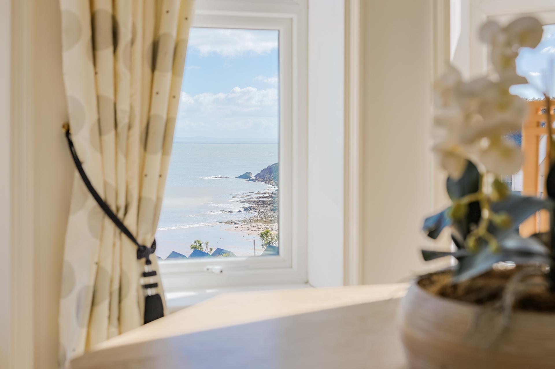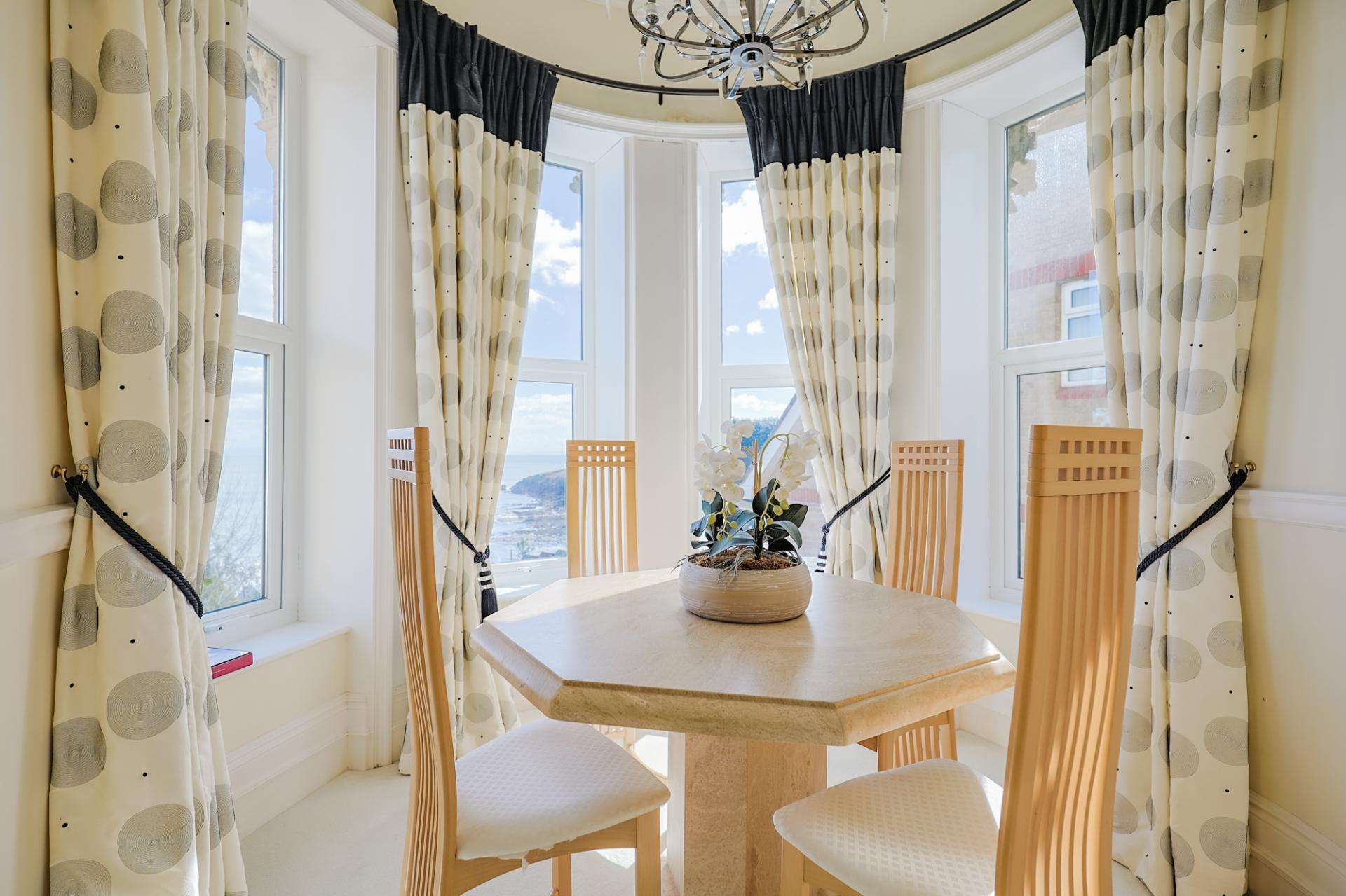 Let's begin by exploring the lounge/dining room. Immediately, you'll be struck by the abundance of natural light streaming in through the south-facing windows, framing captivating sea views. A variety of windows also encircle the turret area, establishing a serene atmosphere within the room. This expansive area offers plenty of space to accommodate large lounge furniture and a dining area, perfect for socialising or relaxing after a long day while enjoying the view. The room is carpeted and it also features two distinctive ceiling roses.