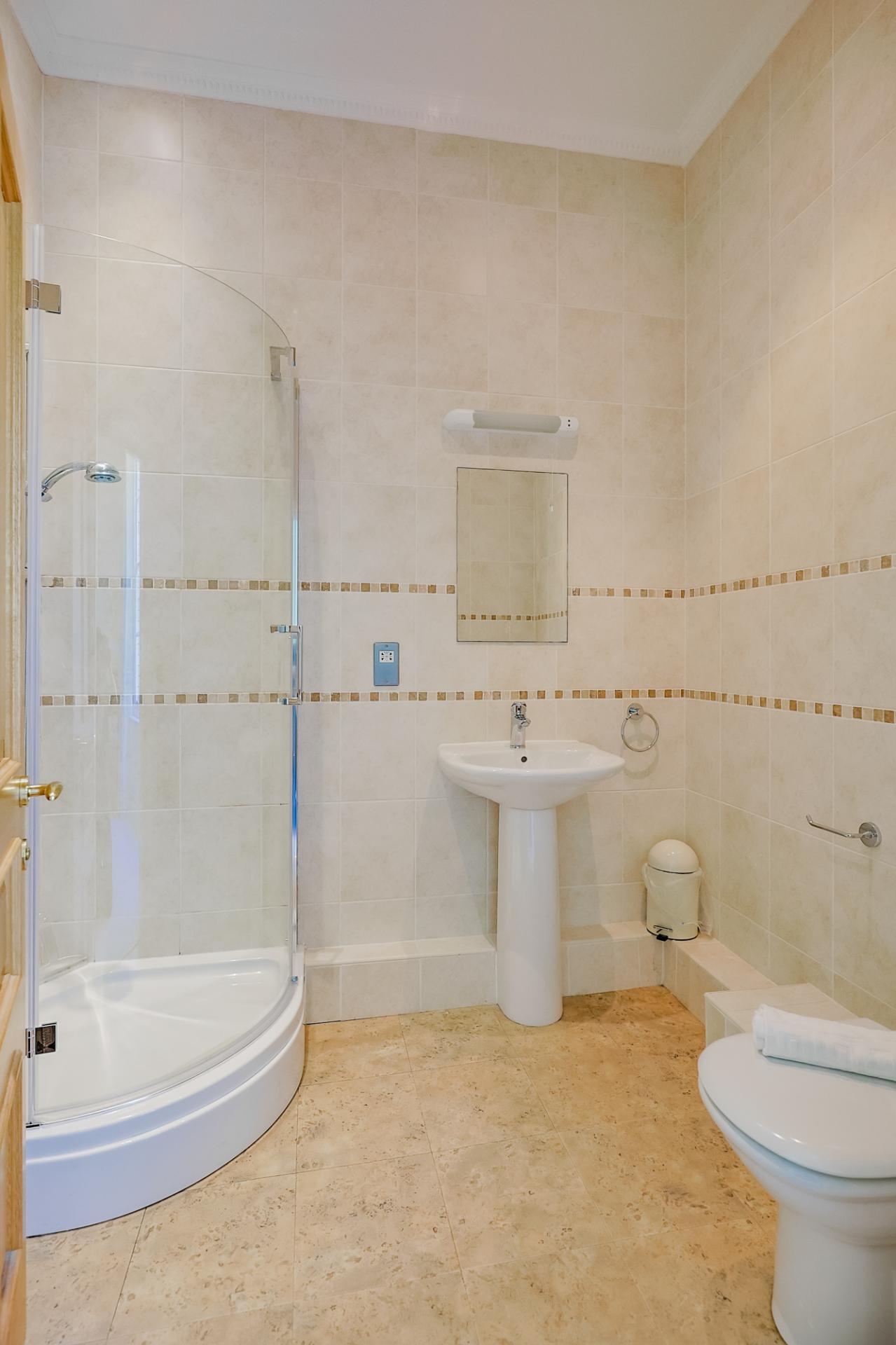 The family bathroom is fully furnished with a WC, wash basin, fitted bath with shower, heated towel rail, spotlighting, extractor fan, two shaving points, shaving light with additional shaving point, frosted window to the side, tiled walls, and tiled flooring.