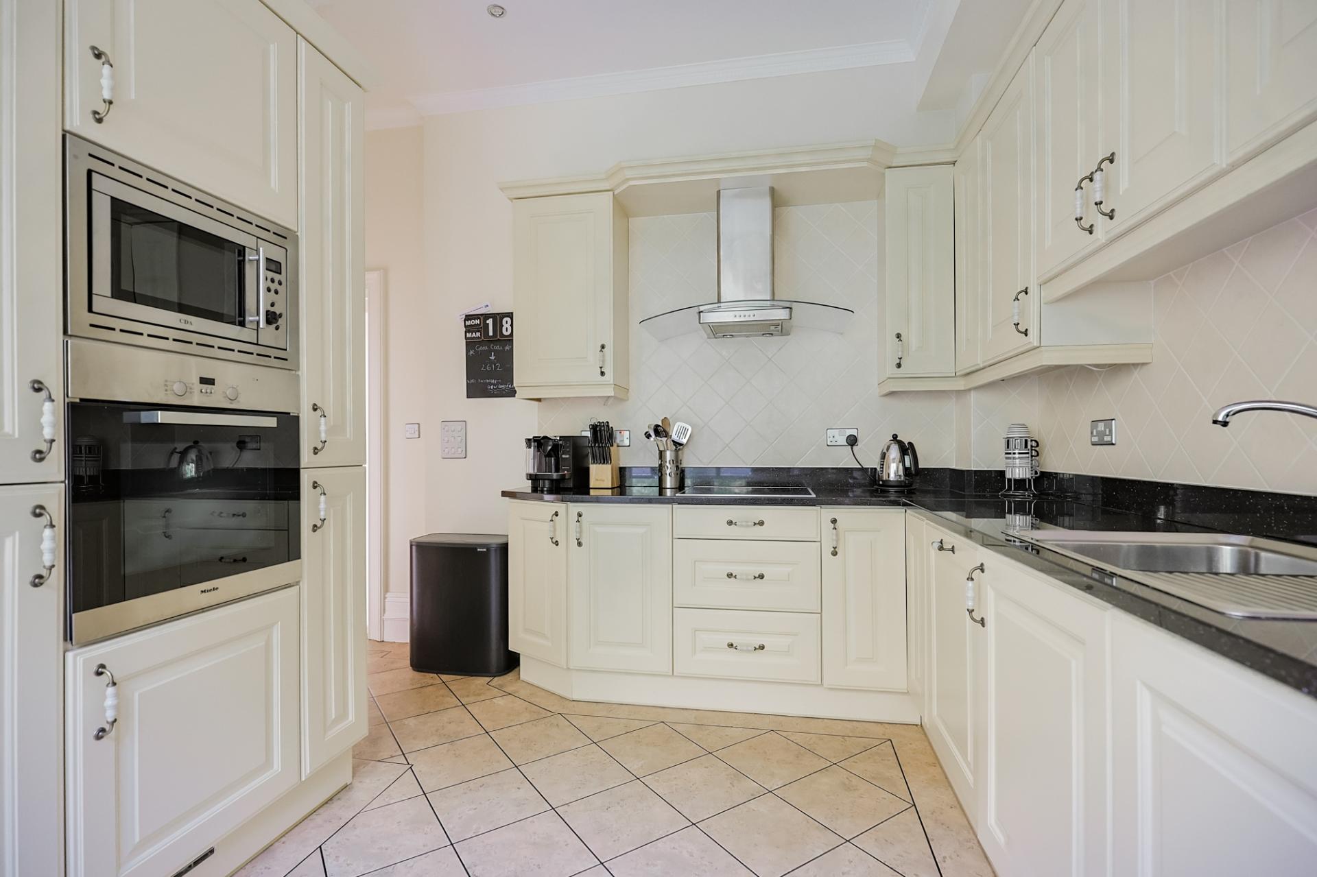 Next, let's explore the kitchen/breakfast room. This generous space features tiled flooring and is illuminated by spotlighting. The kitchen is equipped with an array of wall and base units topped with granite worktops. You'll find a range of integrated appliances, including a 4-ring electric Miele hob, an elevated extractor fan, a Miele dishwasher, a kick plinth vent, a single stainless-steel sink with drainage, a Siemens washing machine, a Miele oven/grill, a CDA microwave, a Siemens fridge/freezer, and a ceiling extractor. This bright room boasts a large double sash window to the rear and offers ample space for a breakfast table.