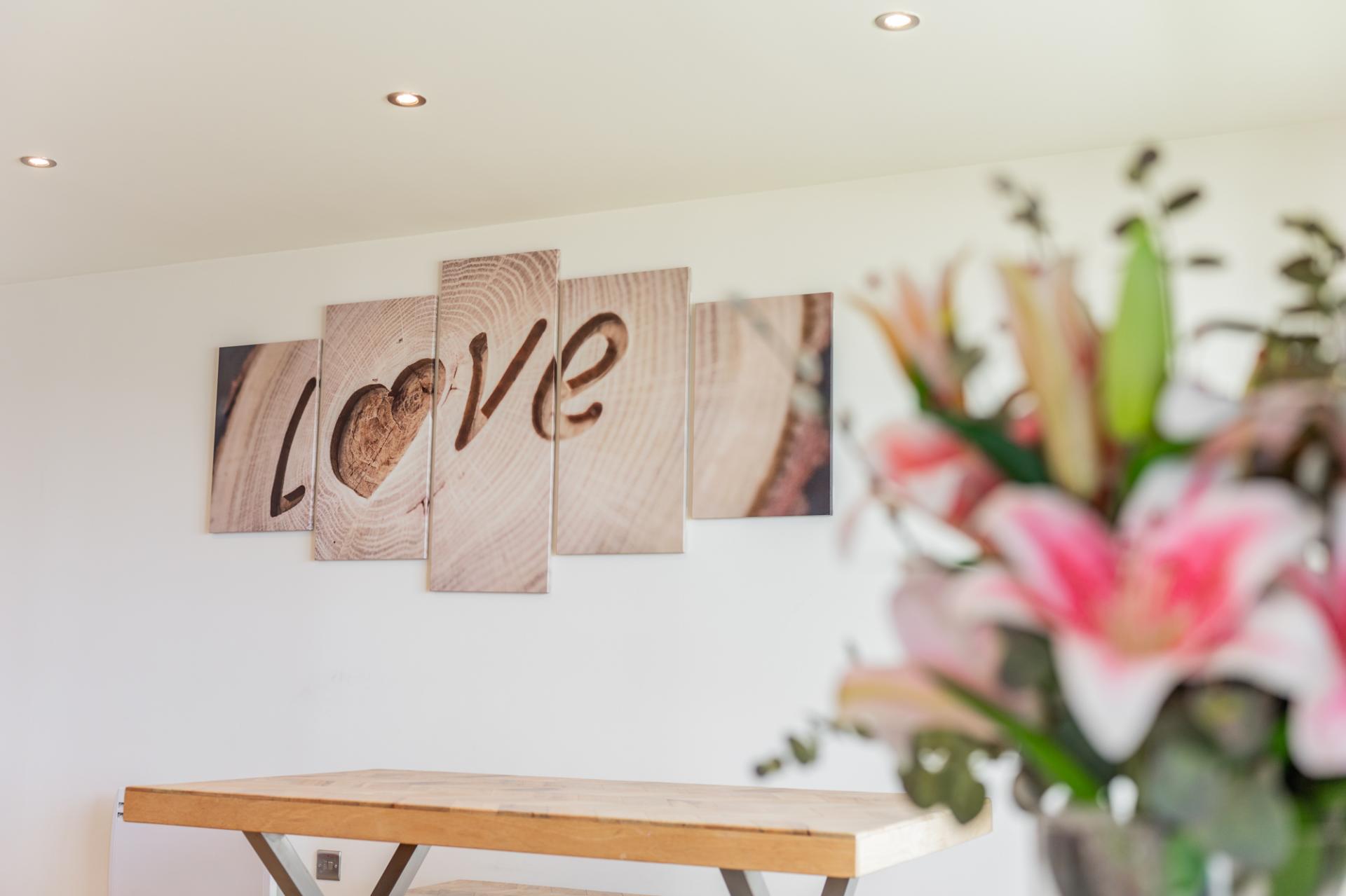 The entire space is tastefully lit by spotlighting and laid with wood effect tiles underfoot. The layout allows for ample space for both a comfortable seating area and a dedicated dining area, making it perfect for entertaining family and friends.