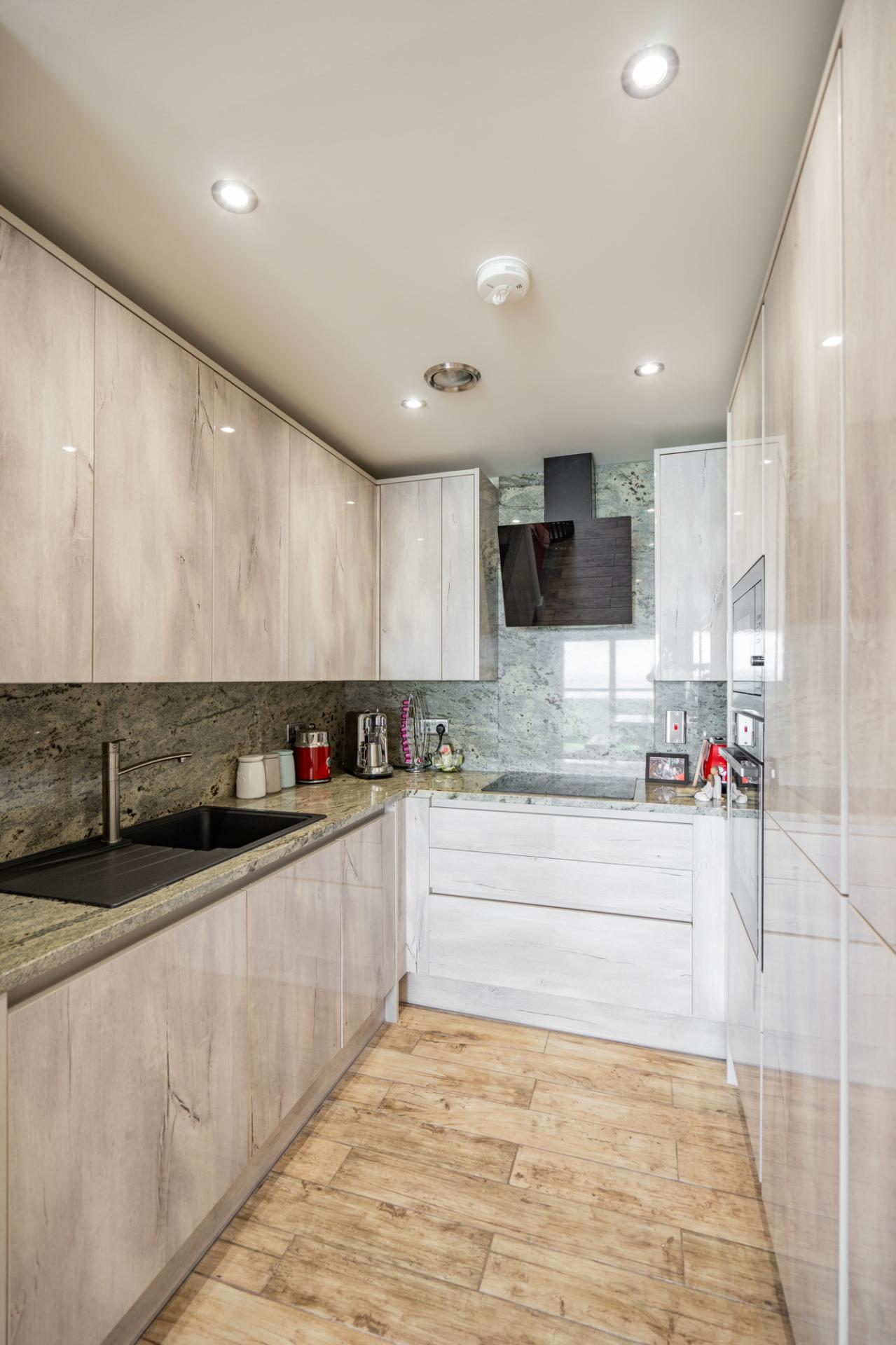 The kitchen area features wall and base units topped with elegant granite worktops, single sunken sink with drainage, Bosch 4-ring induction hob, elevated extractor fan, NEFF oven/grill, CDA microwave, CDA fridge/freezer, slimline CDA dishwasher, and Beko washer/dryer complete the array of high-quality appliances, ensuring that every culinary need is met.