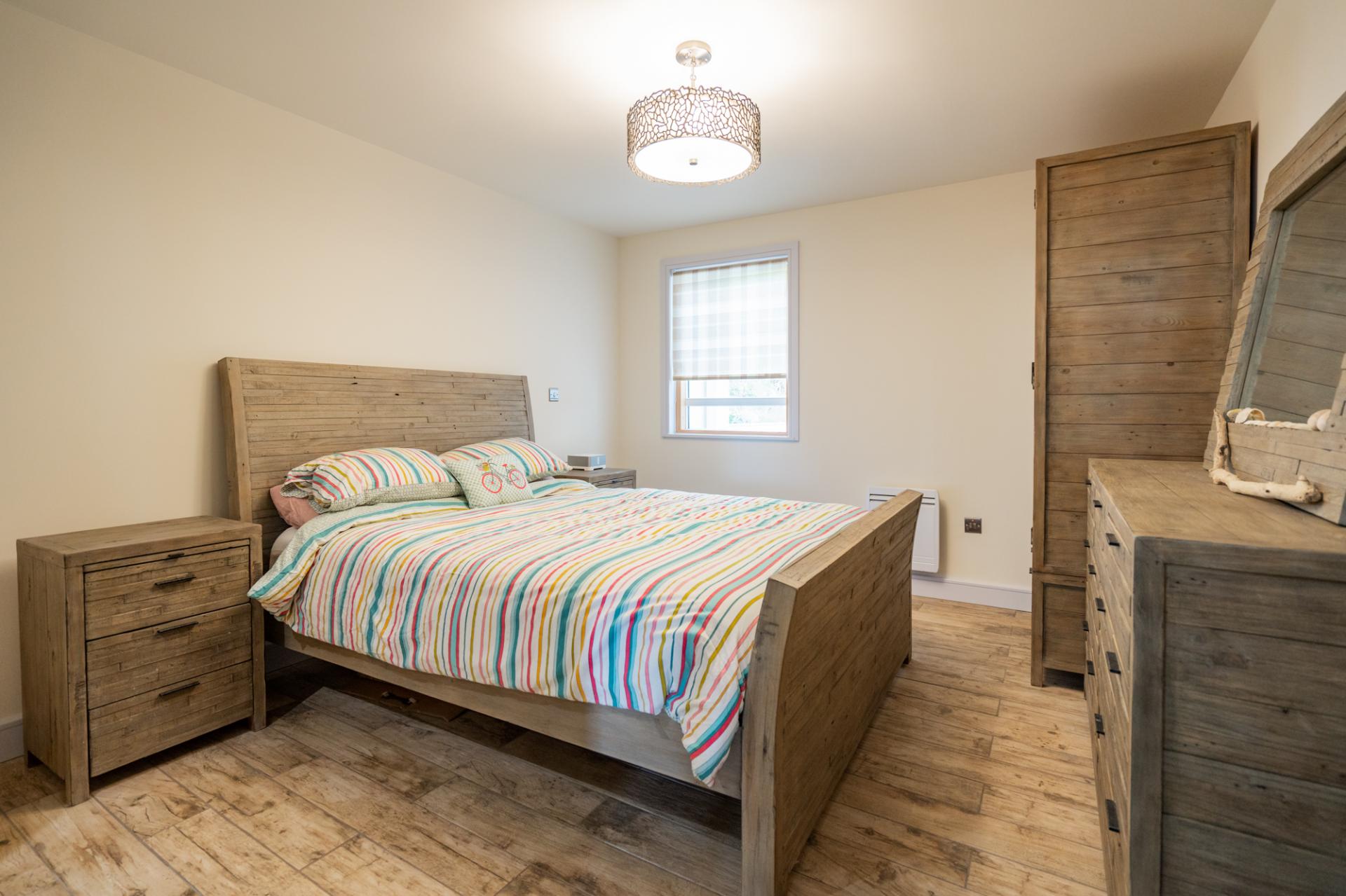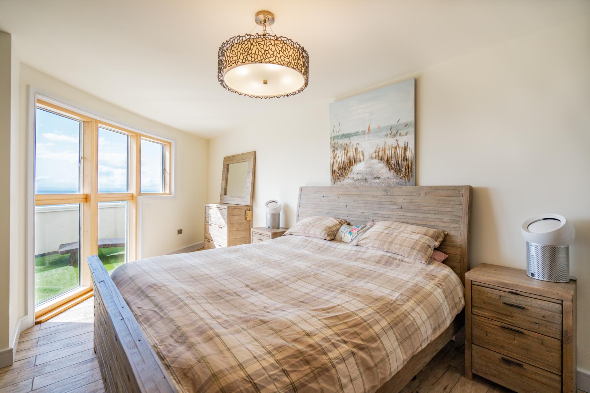A beautifully bright and airy room thanks to the large window to the rear which frames the mesmerizing ocean views. This generous room also enjoys superb wood effect tiles and a modern en-suite housing a Duravit WC, Calypso wash basin with storage underneath, large walk-in shower, fitted bath with handheld shower head, heated towel rail, shaving point, spotlighting, extractor, tiled flooring, and tiled walls.