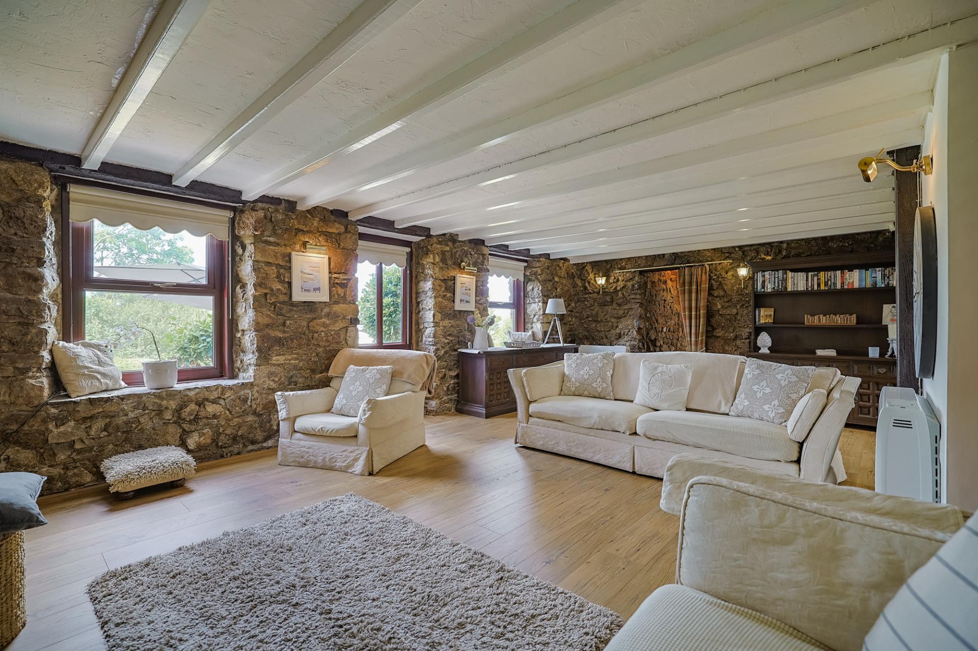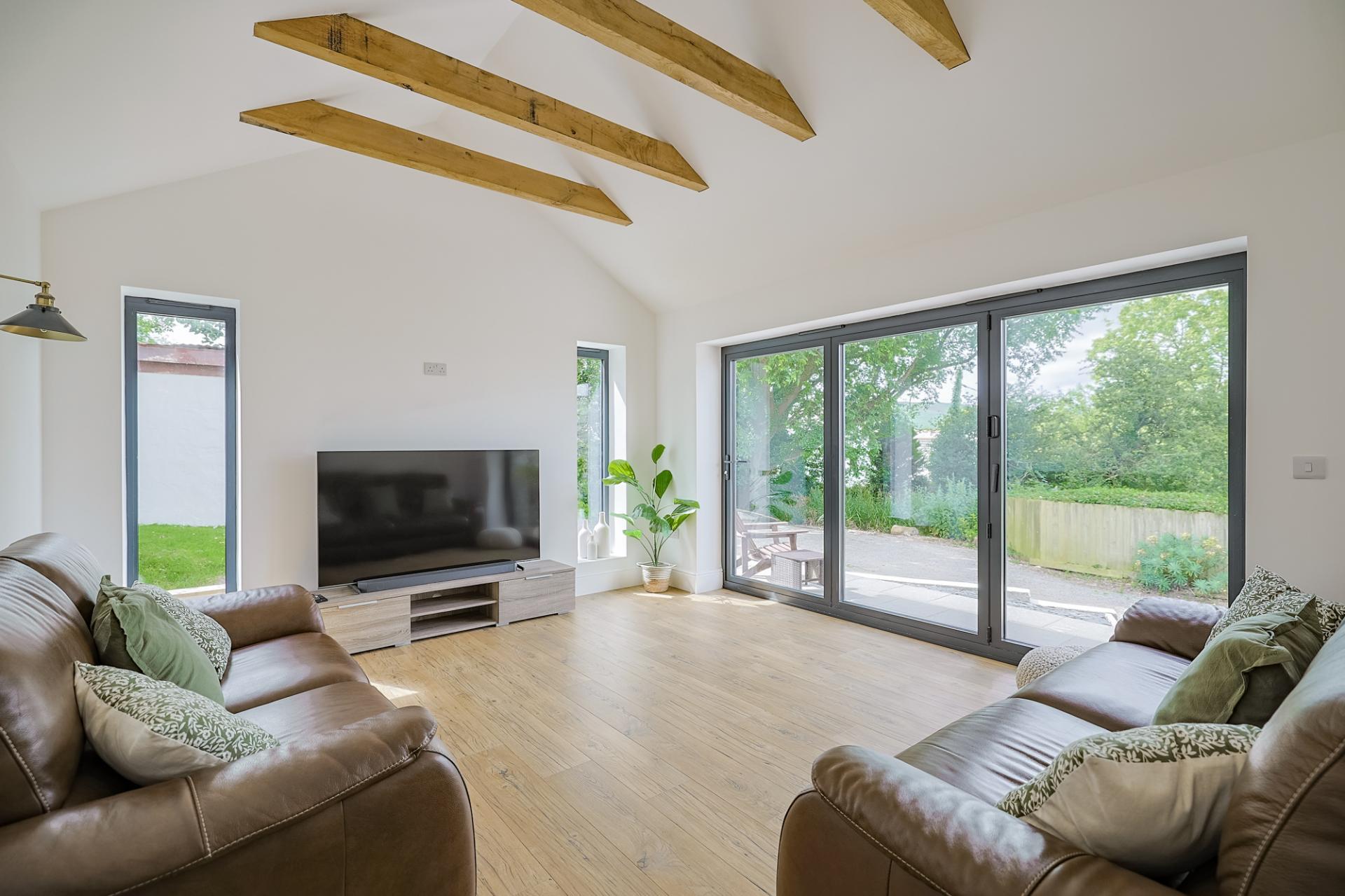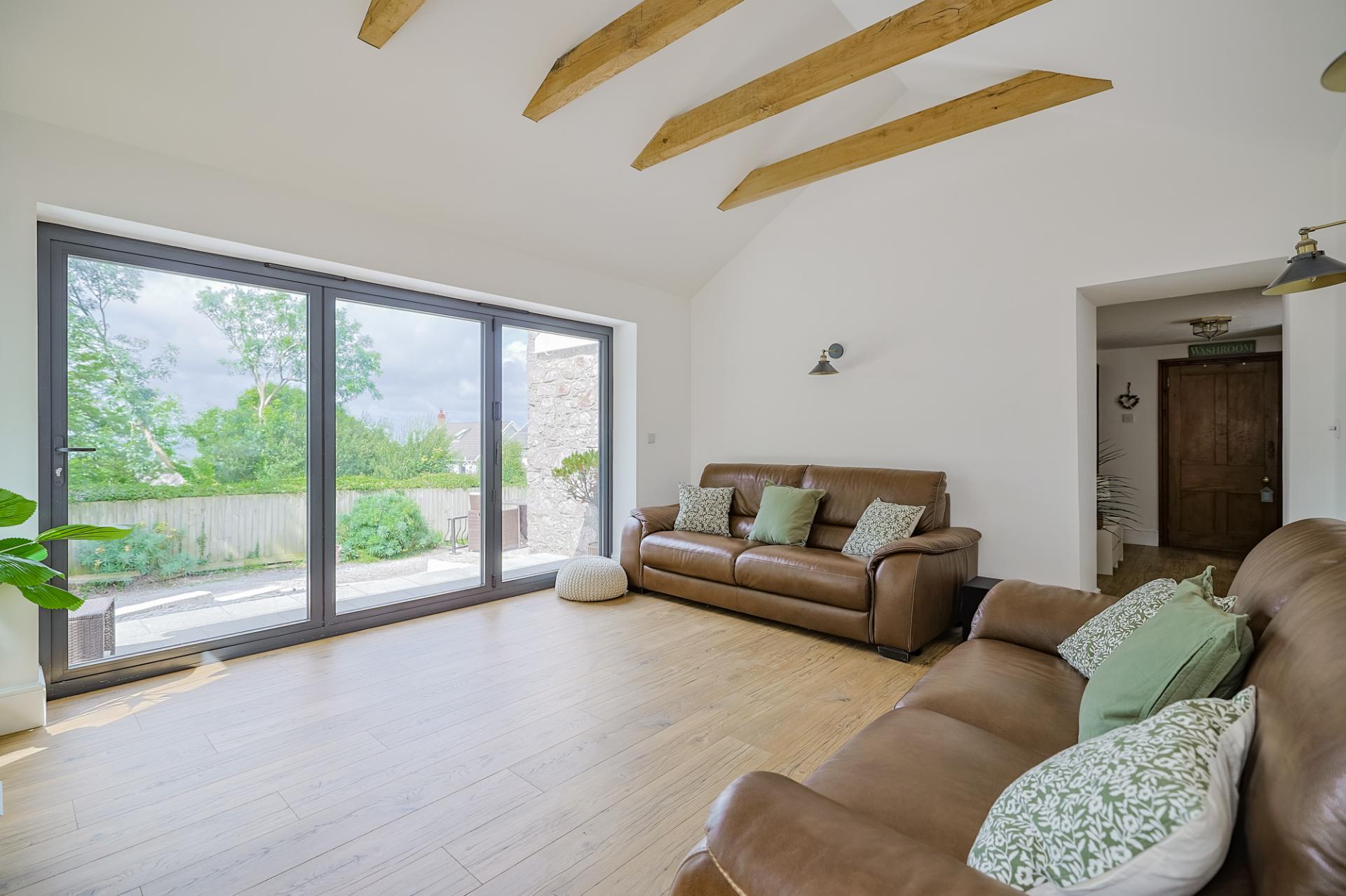 The sunroom is a truly beautiful and tranquil space. Natural light beams in through two feature side windows and bi-fold doors to the front, offering stunning views of the garden and distant sea. With new flooring underfoot and vaulted ceilings featuring exposed beams above, it’s the perfect place to unwind and relax after a long day.