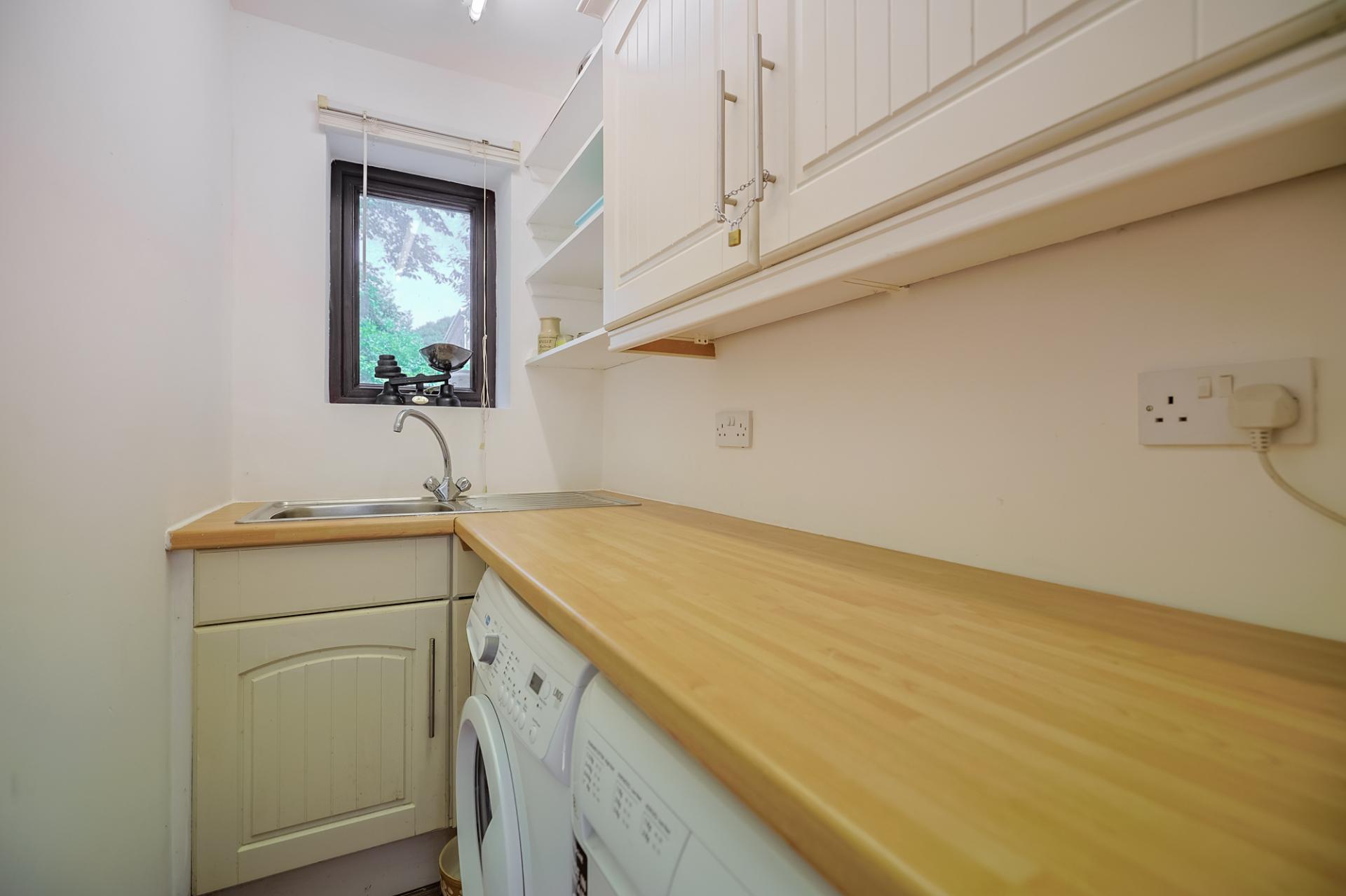 Just off the kitchen is a practical utility room. This useful space features additional wall and base units, a single stainless steel sink, a window to the side, tiled flooring, and space for two under-counter appliances as well as one freestanding.