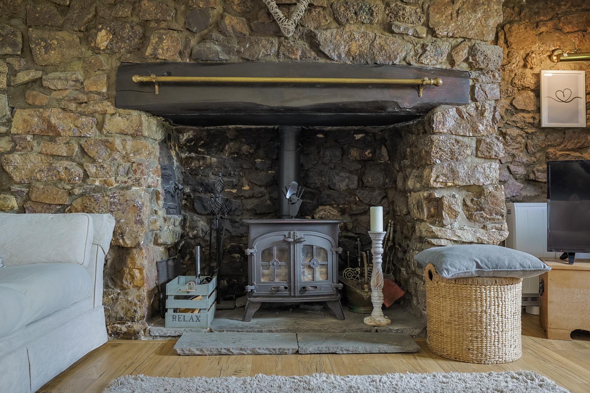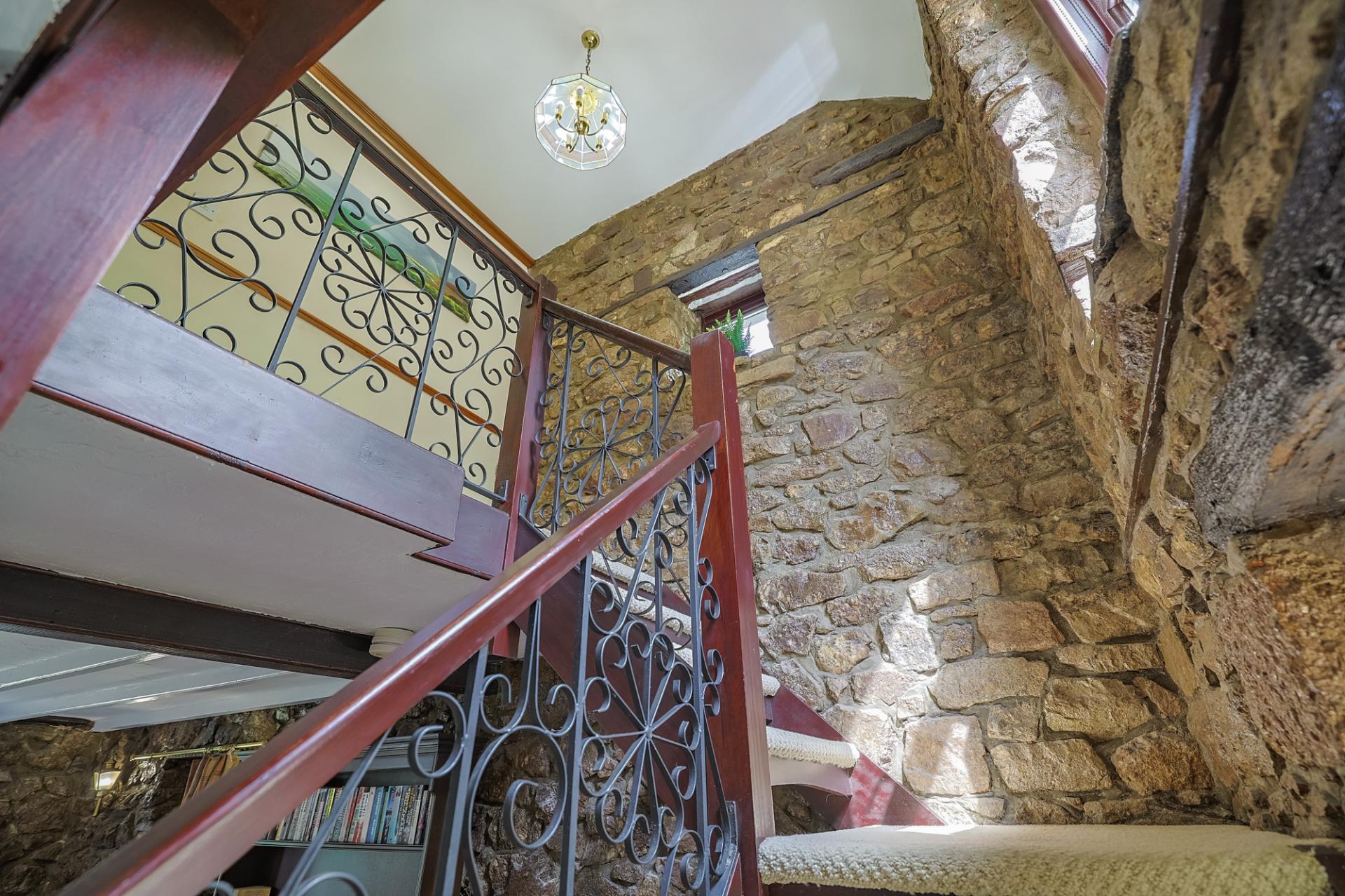 Also located to the front of the home, bedroom two enjoys beautiful sea views. This double room continues the theme of character with exposed stone walls, carpeting, and built-in wardrobes with practical storage.