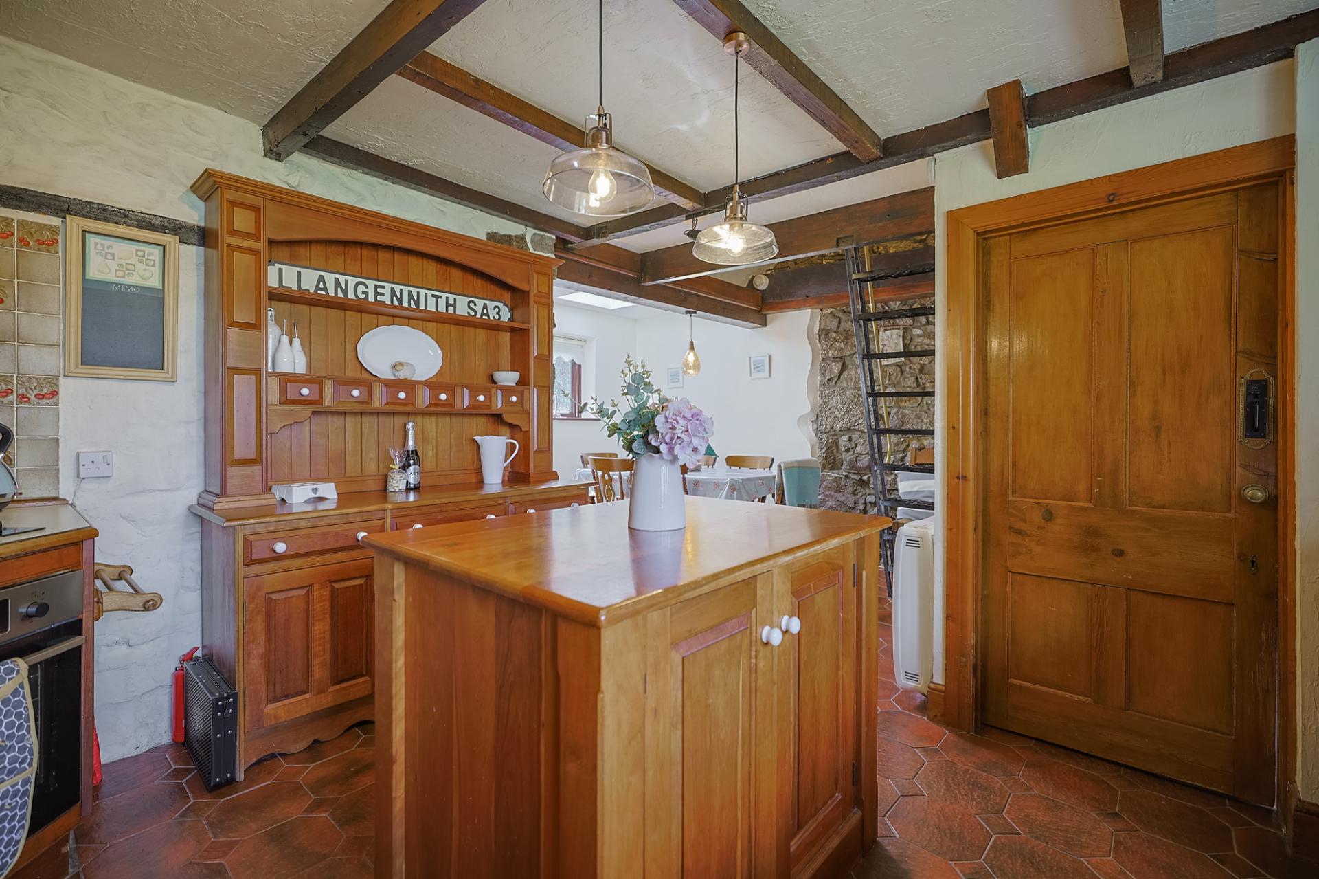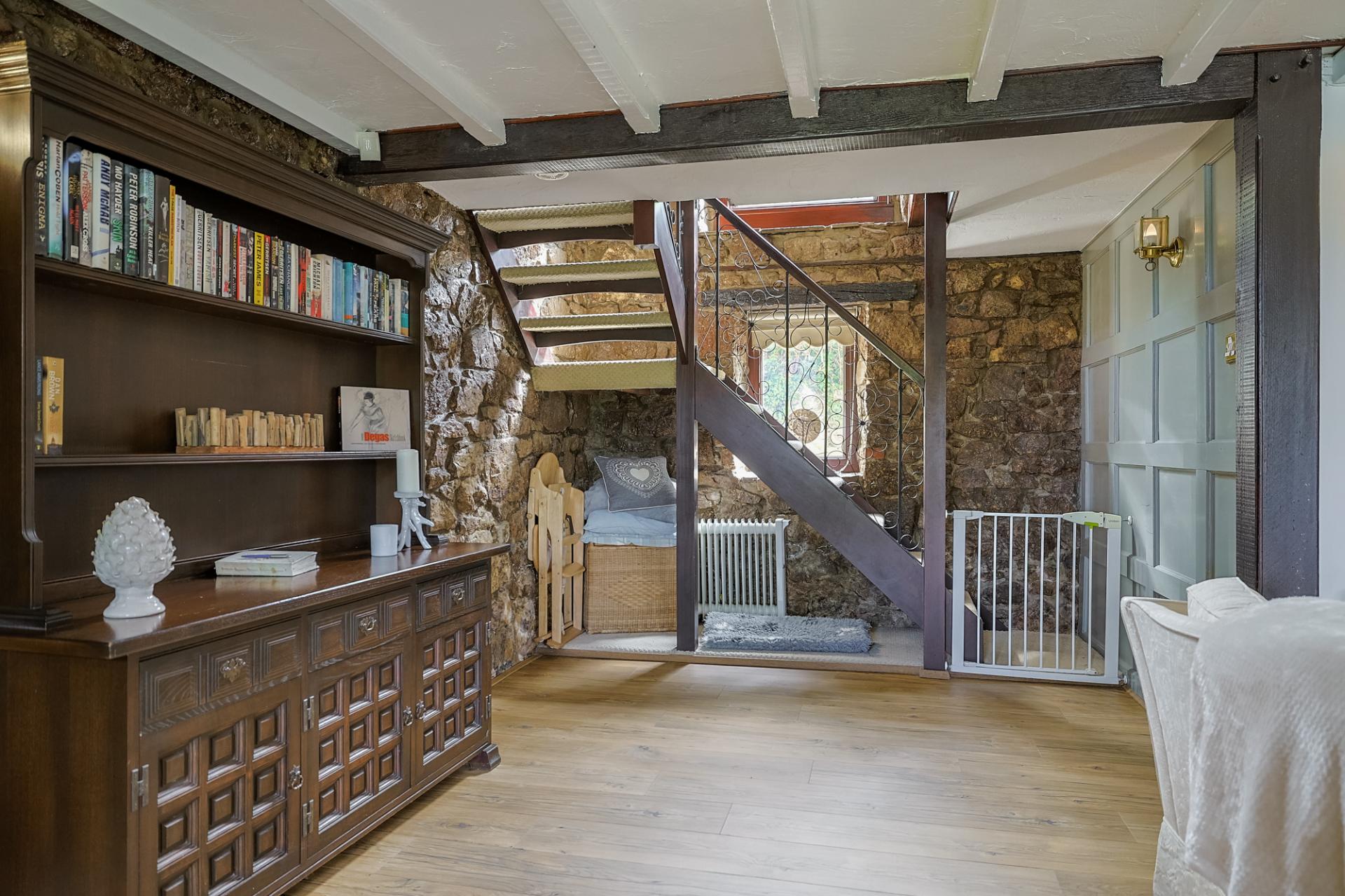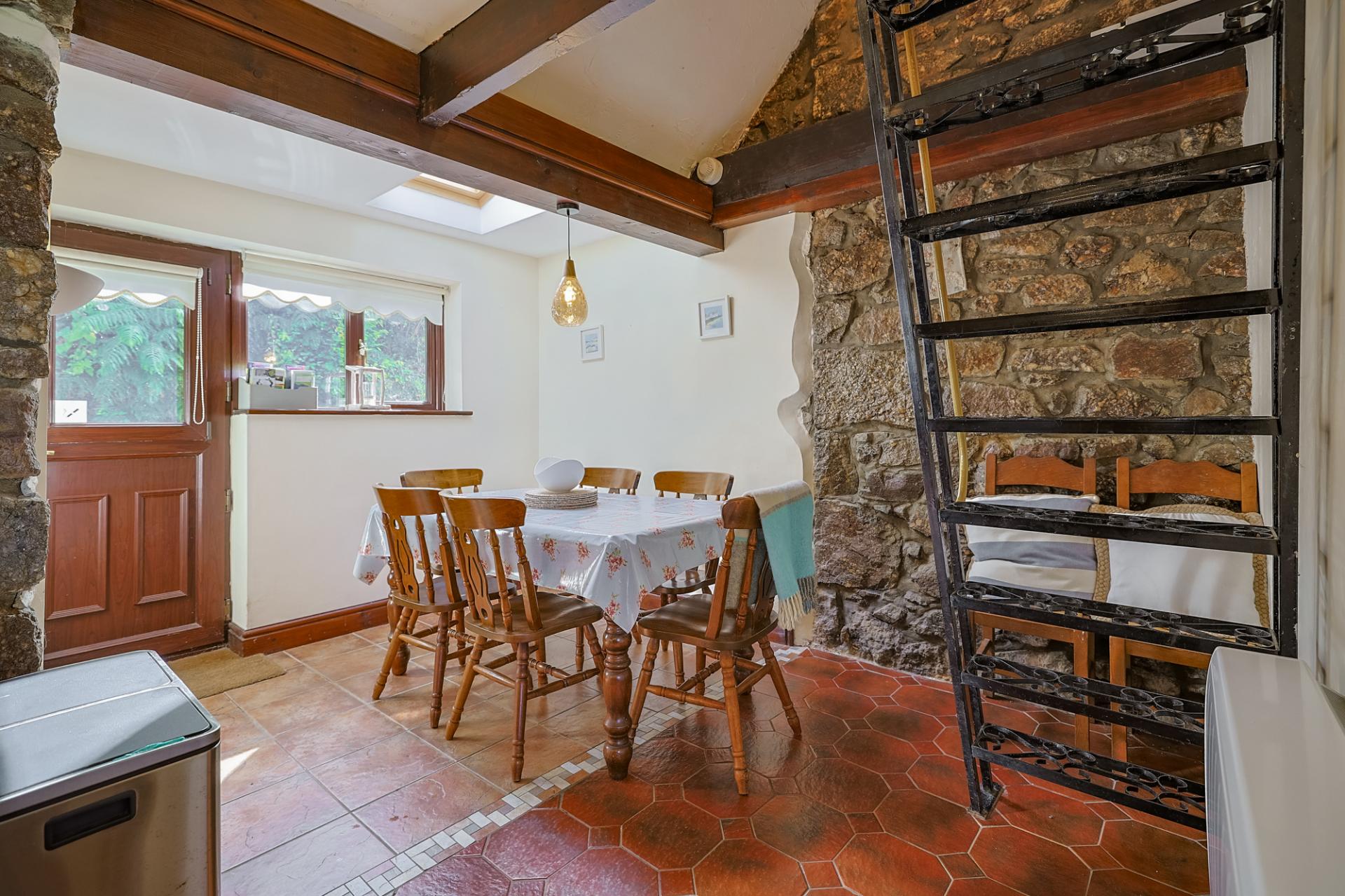 This is a delightful cottage kitchen, full of charm and functionality. Natural light floods the space from dual-aspect windows and an overhead Velux, enhancing the rustic feel created by the exposed beams and tiled flooring. The kitchen is fitted with a range of wall and base units, a double stainless steel sink with drainage and a swan-neck tap, a Zanussi oven/grill and 4-ring electric hob, and an elevated extractor fan. A centre island adds practicality, while there is ample space to house a generous dining table. From here, there’s access to the rear garden, the utility room, and a ladder stairway leading to a versatile attic room.