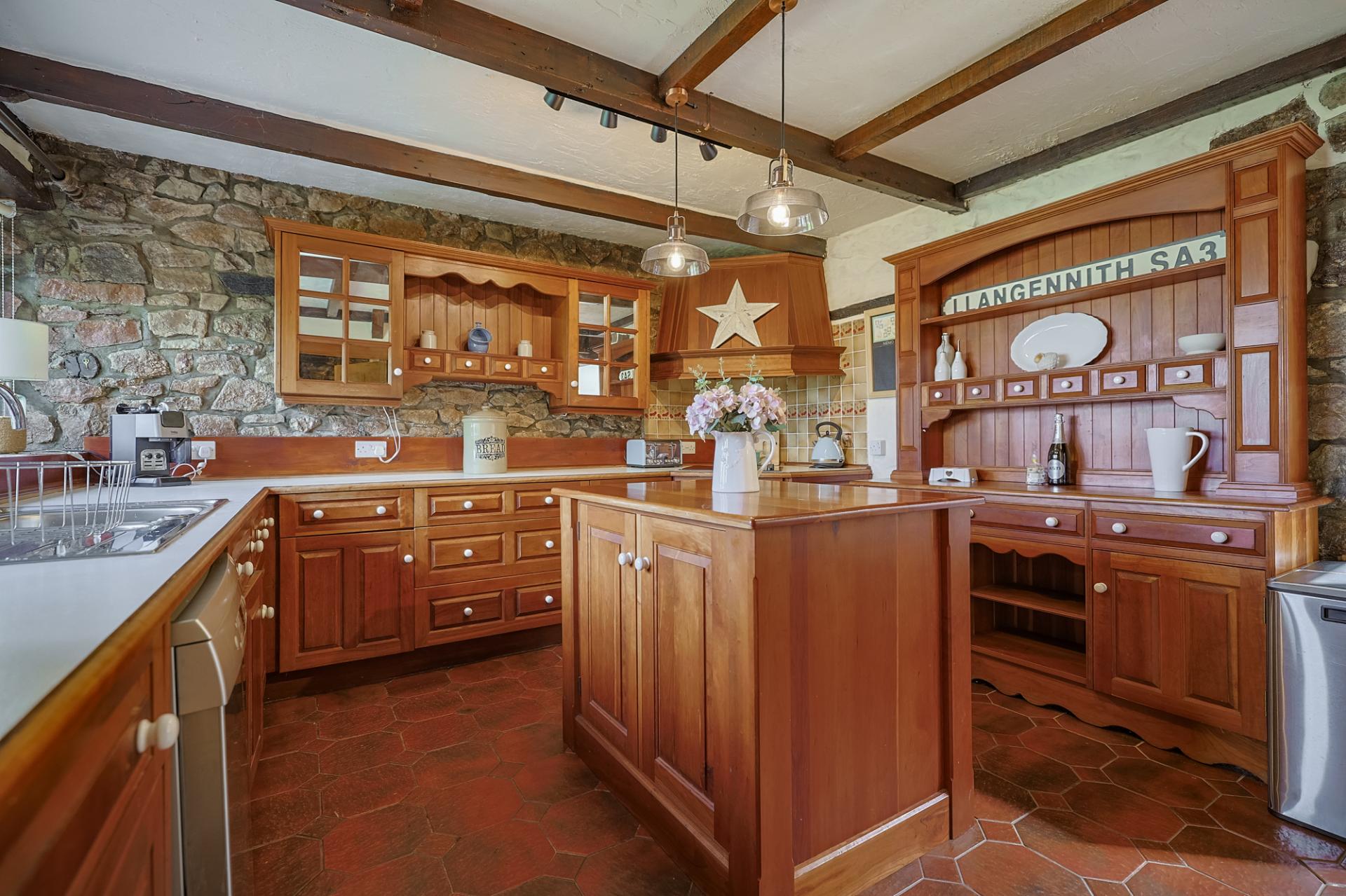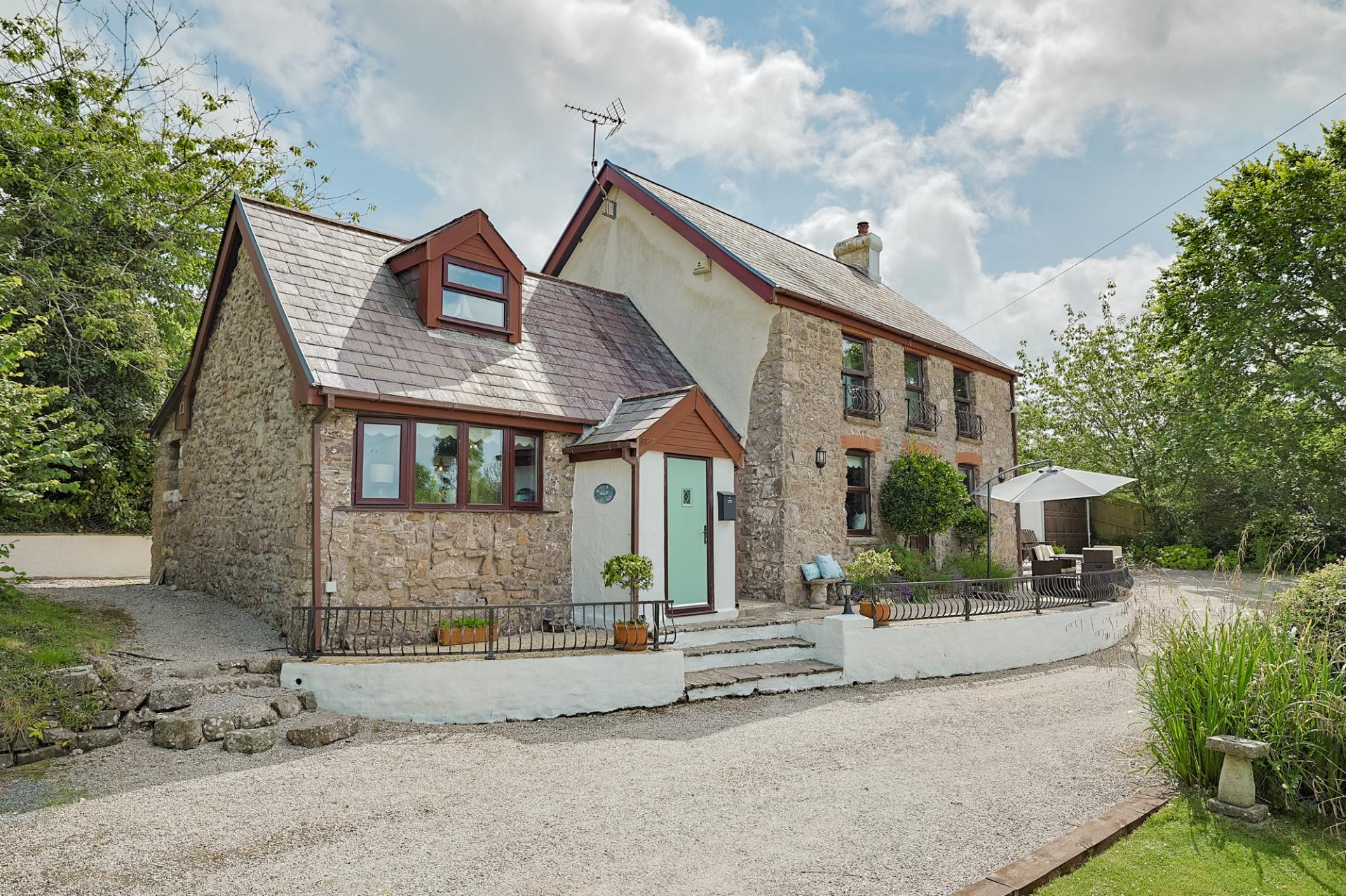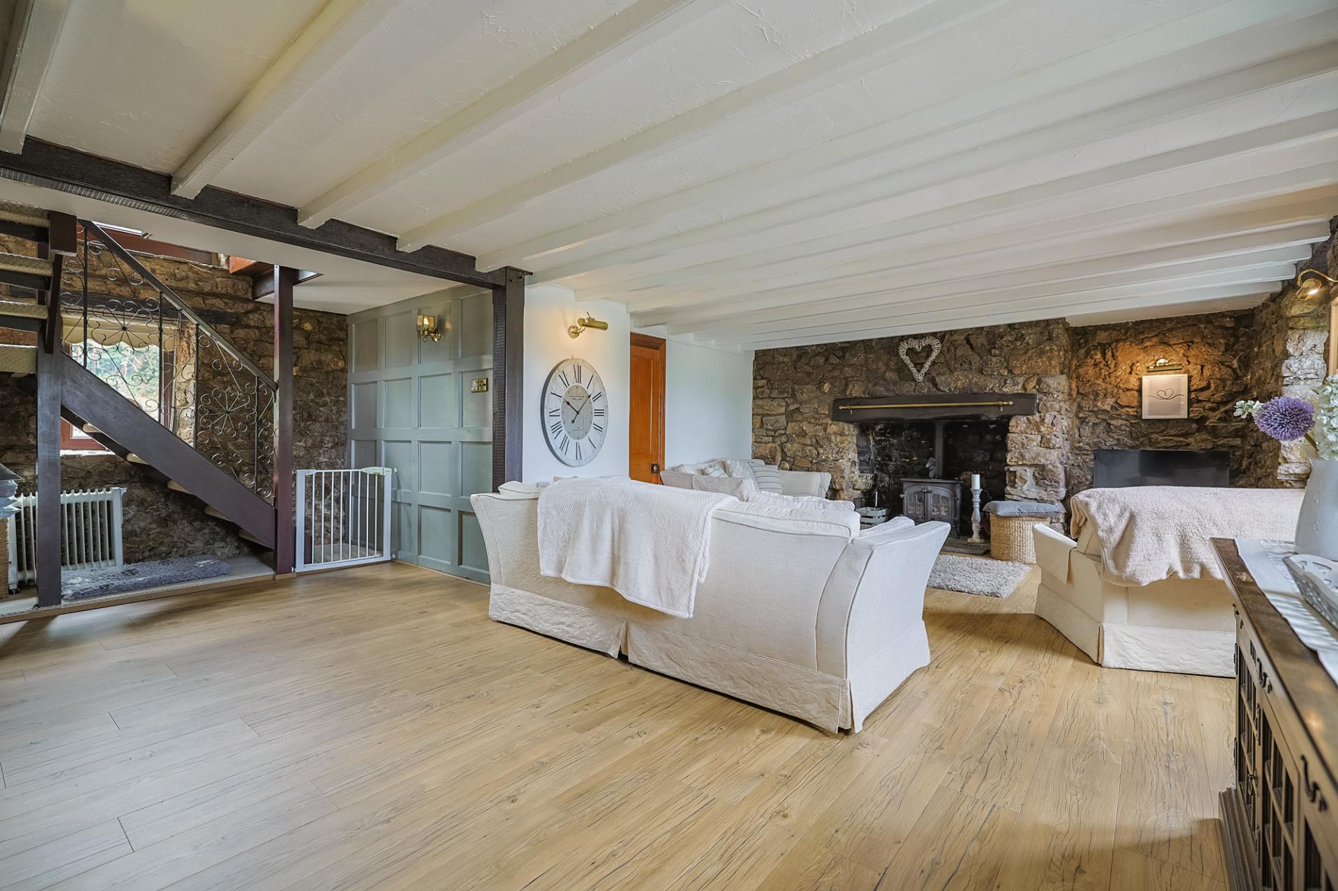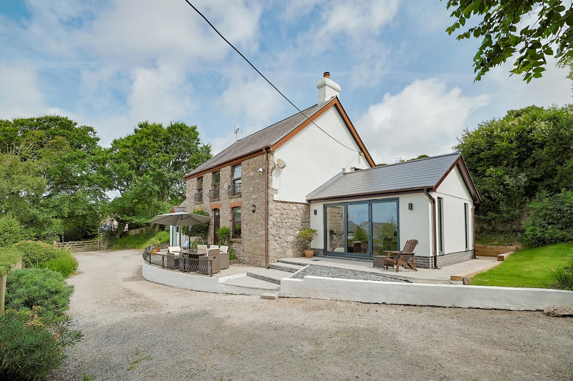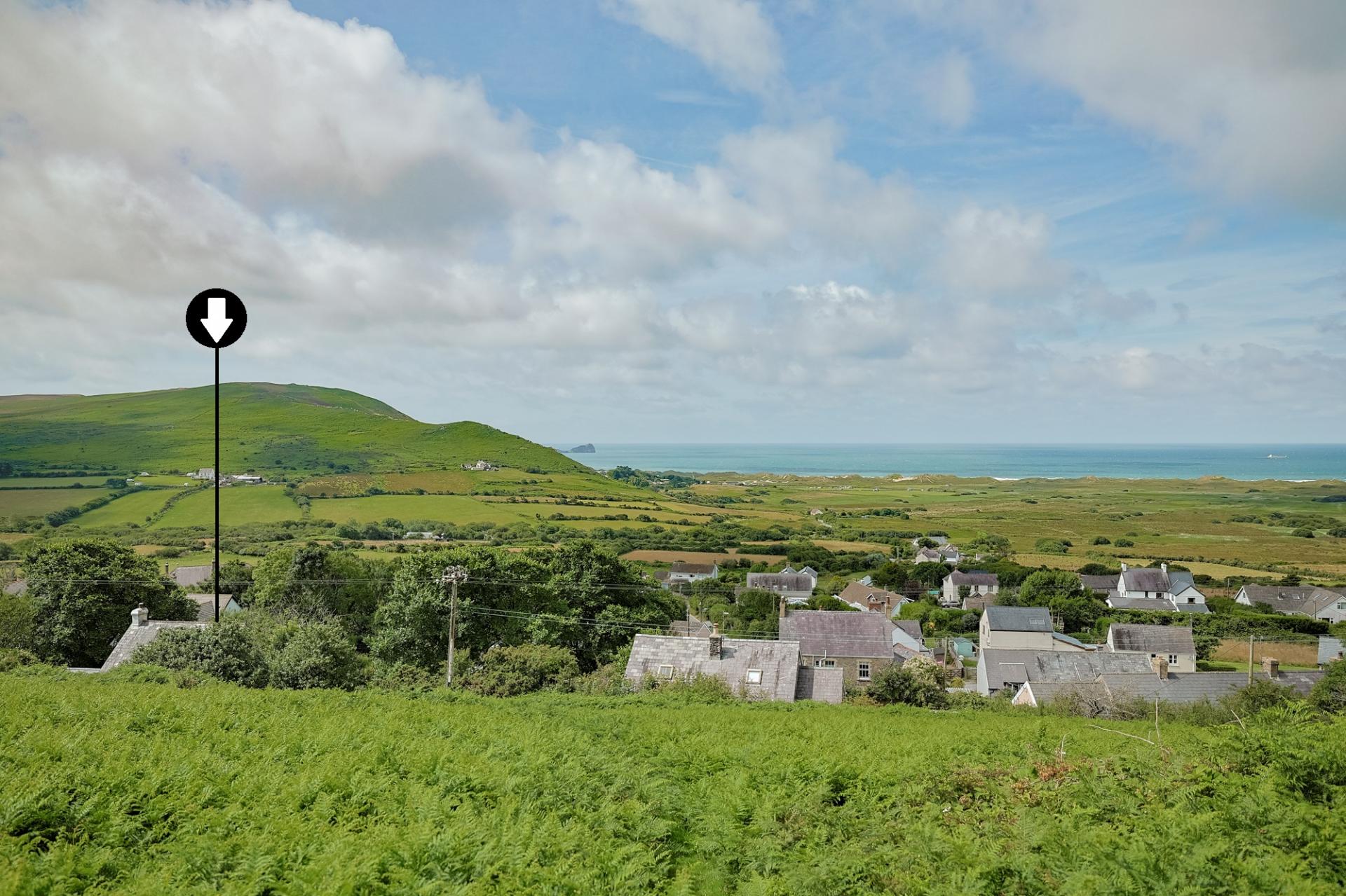 After journeying along the scenic North Gower Road, you arrive at the picture-postcard village of Llangennith. As you crest the hill, you're greeted with a spectacular vista – it's simply breathtaking. Meandering through the charming village and passing the well-loved local pub, you reach a 5-bar wooden gate that invites you into the grounds of Bayview Cottage. A generous chip-stone driveway sweeps in front of the home, offering ample parking and guiding you into this enchanting property. Three steps lead up to the entrance hallway, setting the scene for the character and warmth found within.