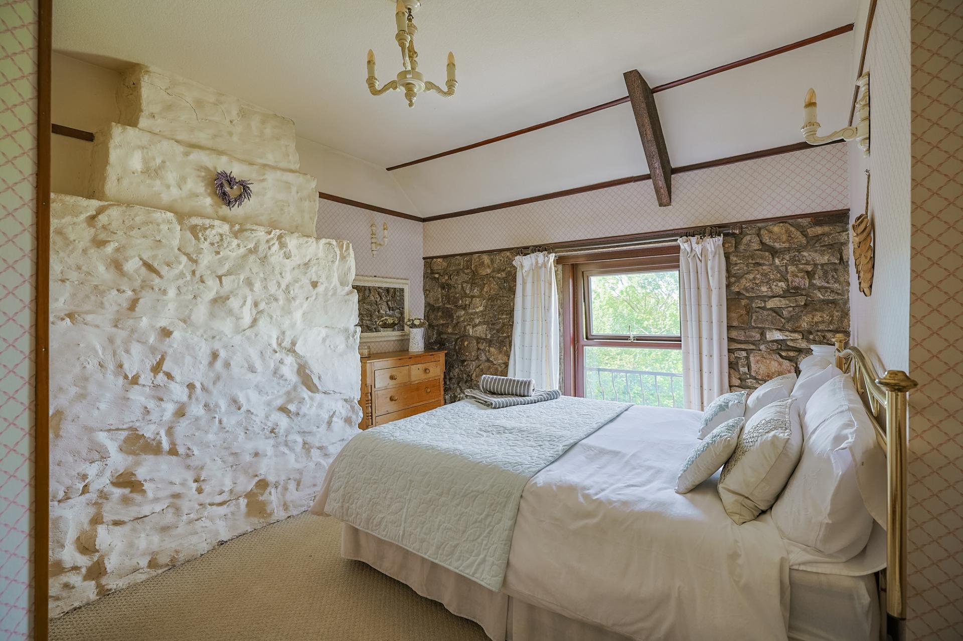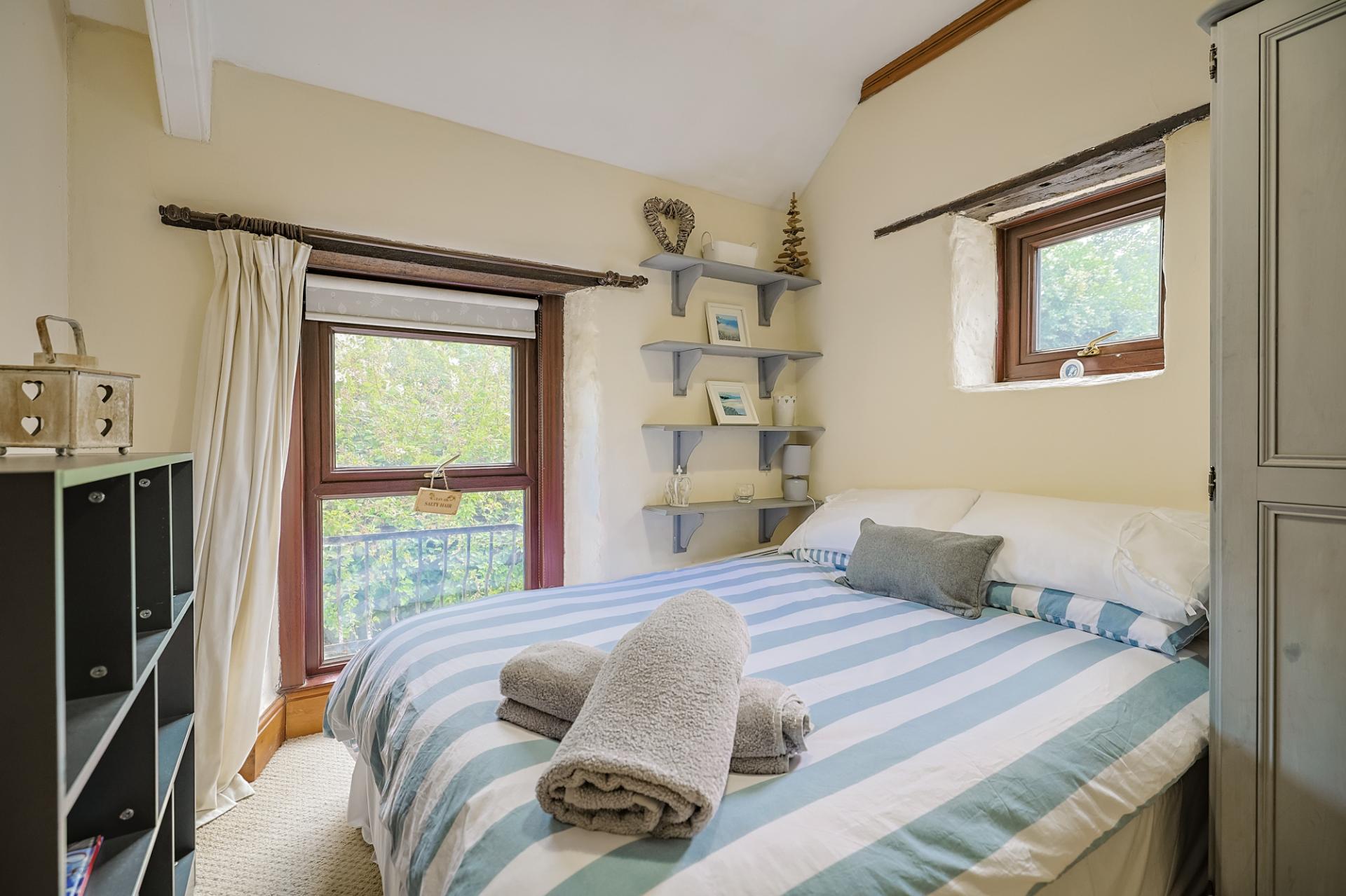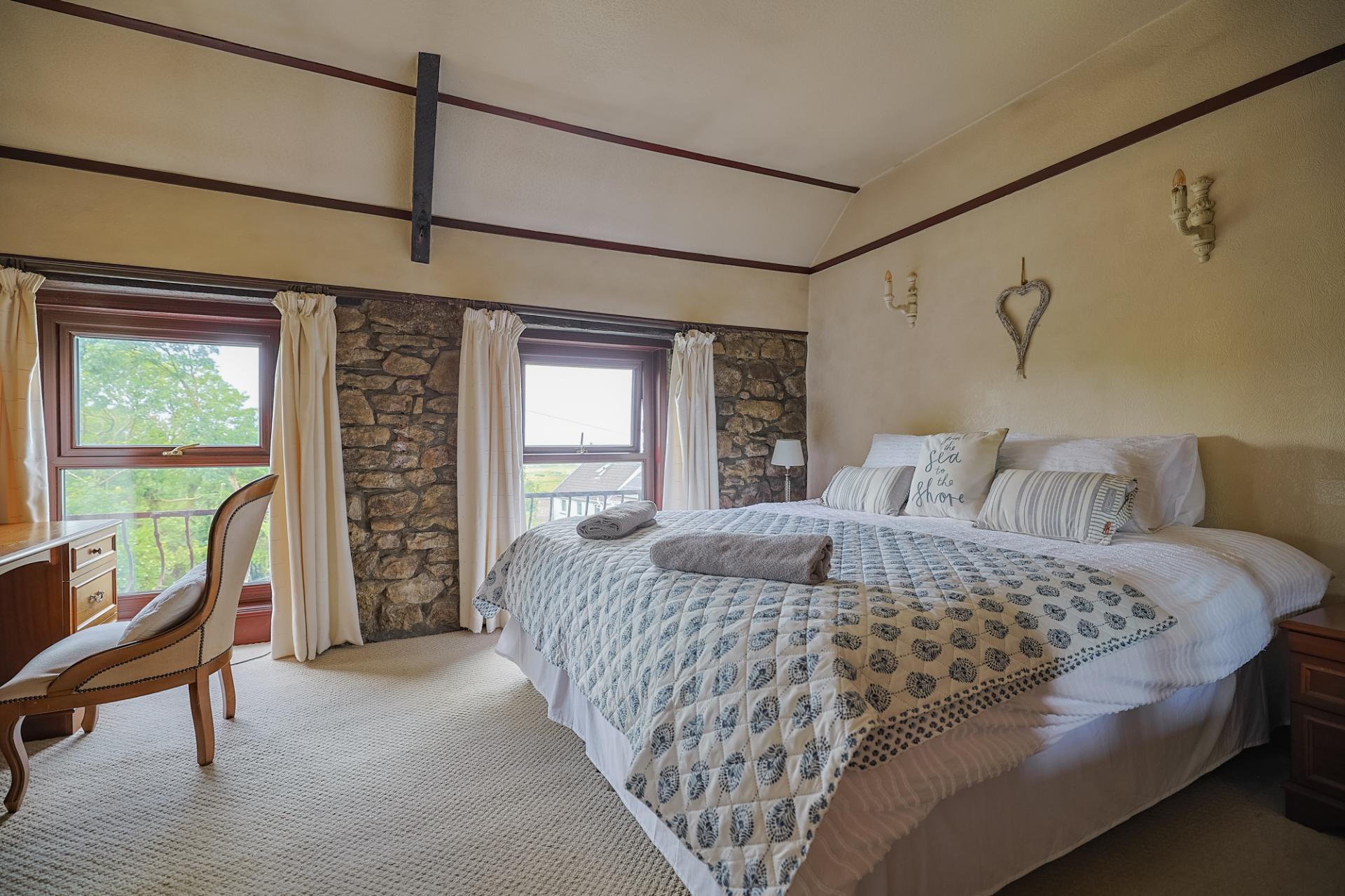 First on your right is bedroom one – a spacious double room that exudes cottage charm. Two front-facing windows perfectly frame the sea views in the distance, and the space is finished with carpeted flooring, built-in wardrobes with hanging rails and shelving, and feature exposed stone walls.
