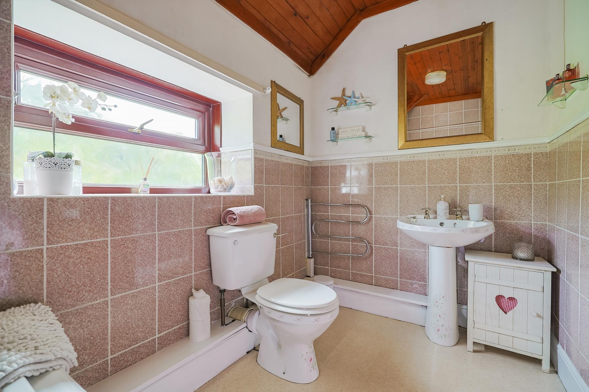 This useful ground-floor shower room features a WC, Bosch wash basin, and a shower. Here you also have partially tiled walls, tiled flooring and a frosted rear window.