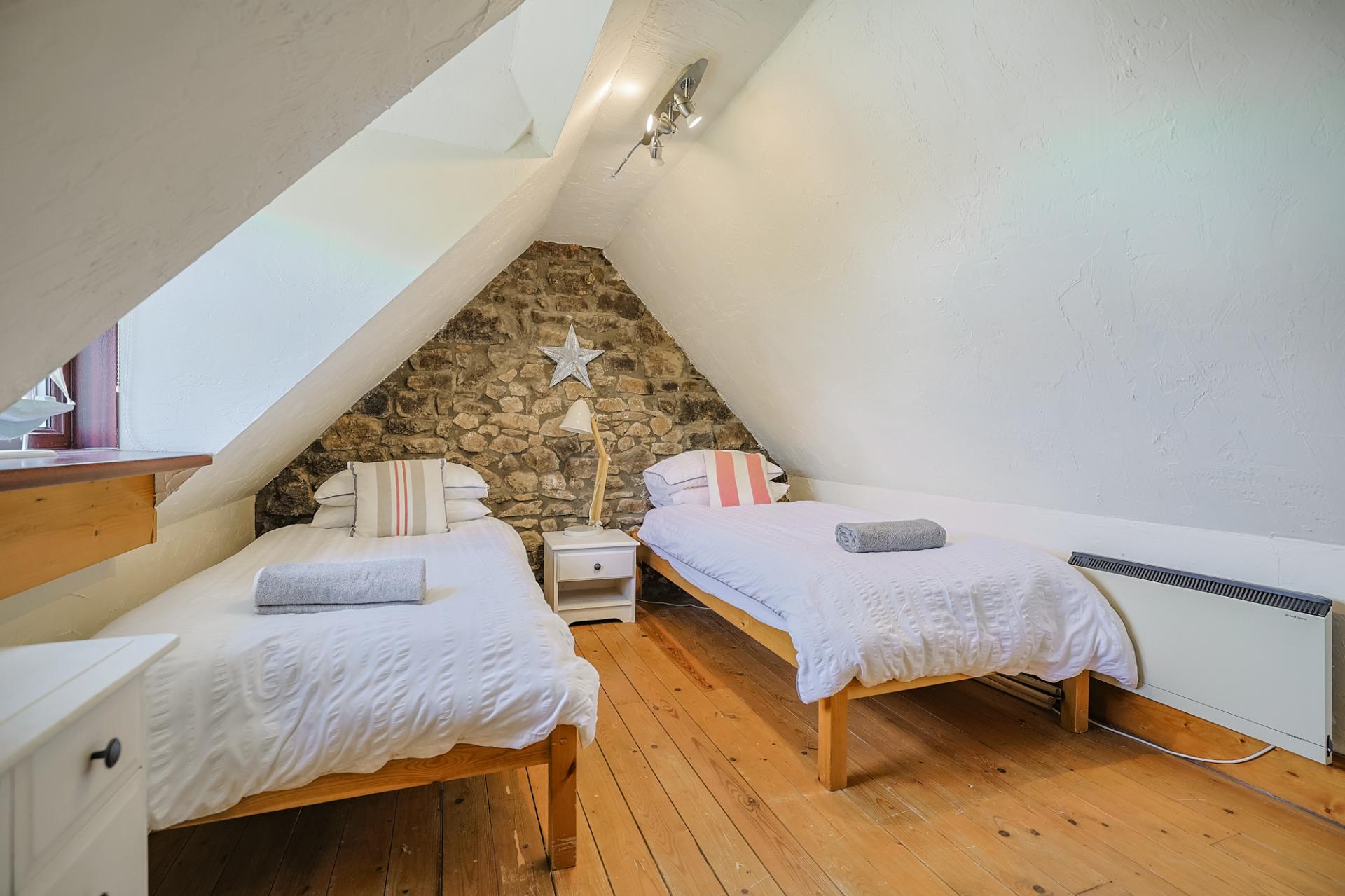 Returning to the kitchen/dining room, ascend the charming ladder-style stairway found in the dining area to reach the versatile attic room. This is a unique and private space – a room that enjoys sea views through its front-facing window. Vaulted ceilings and an exposed stone wall add to the appeal, along with wooden flooring and an additional space with a hanging rail.