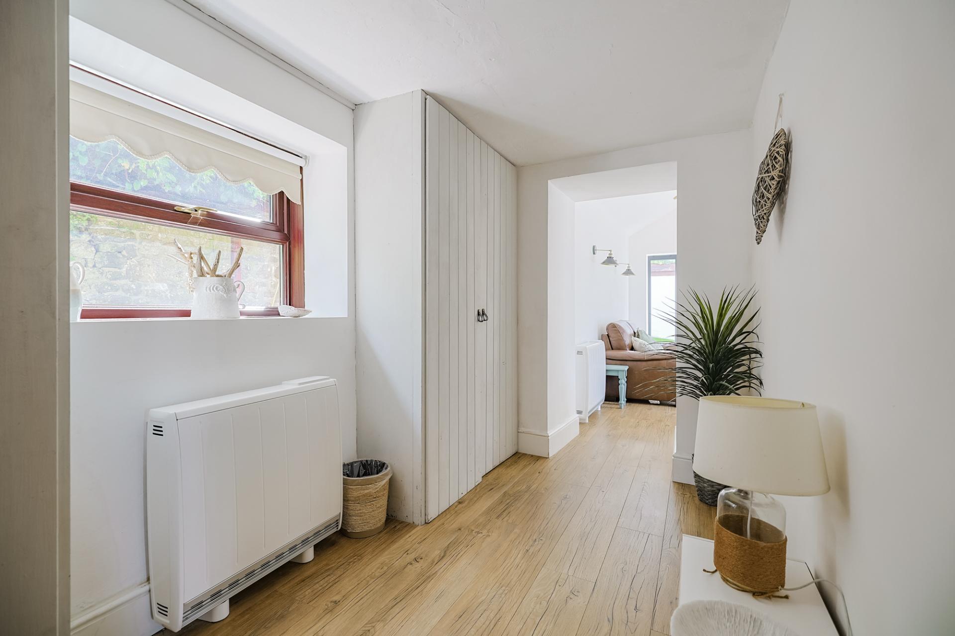 The inner hallway continues the theme of charm and practicality with its new flooring and twin double-door storage cupboards. A window to the rear brings in light, and there is access to the shower room and the sunroom beyond.