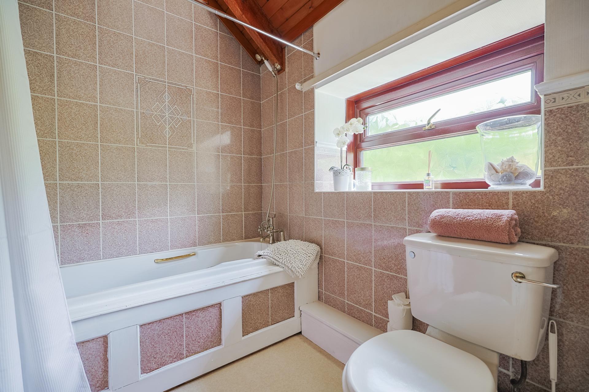 The family bathroom offers a WC, wash basin, and a fitted bath with shower over. With vinyl flooring, partially tiled walls, and a frosted window to the rear.