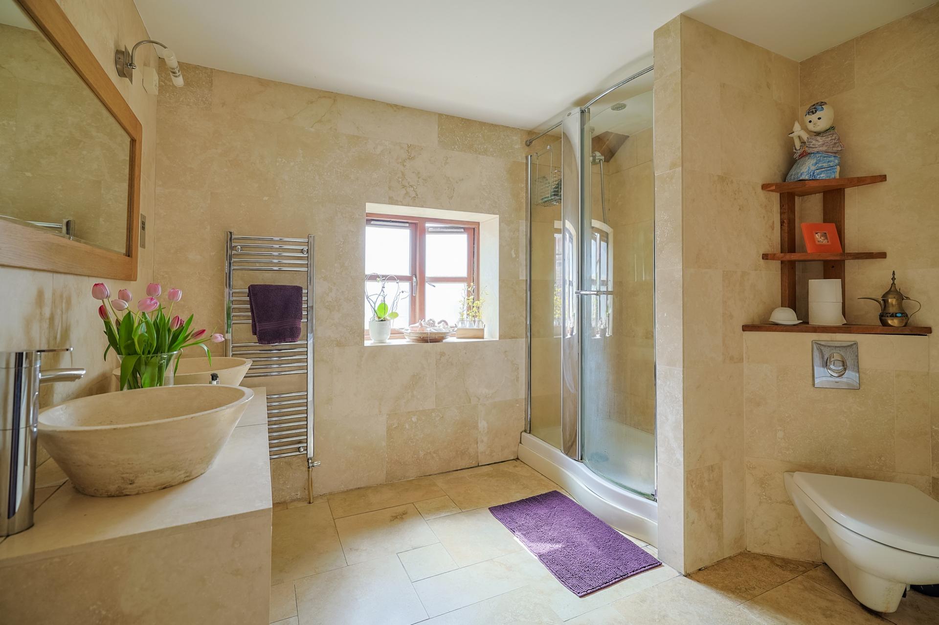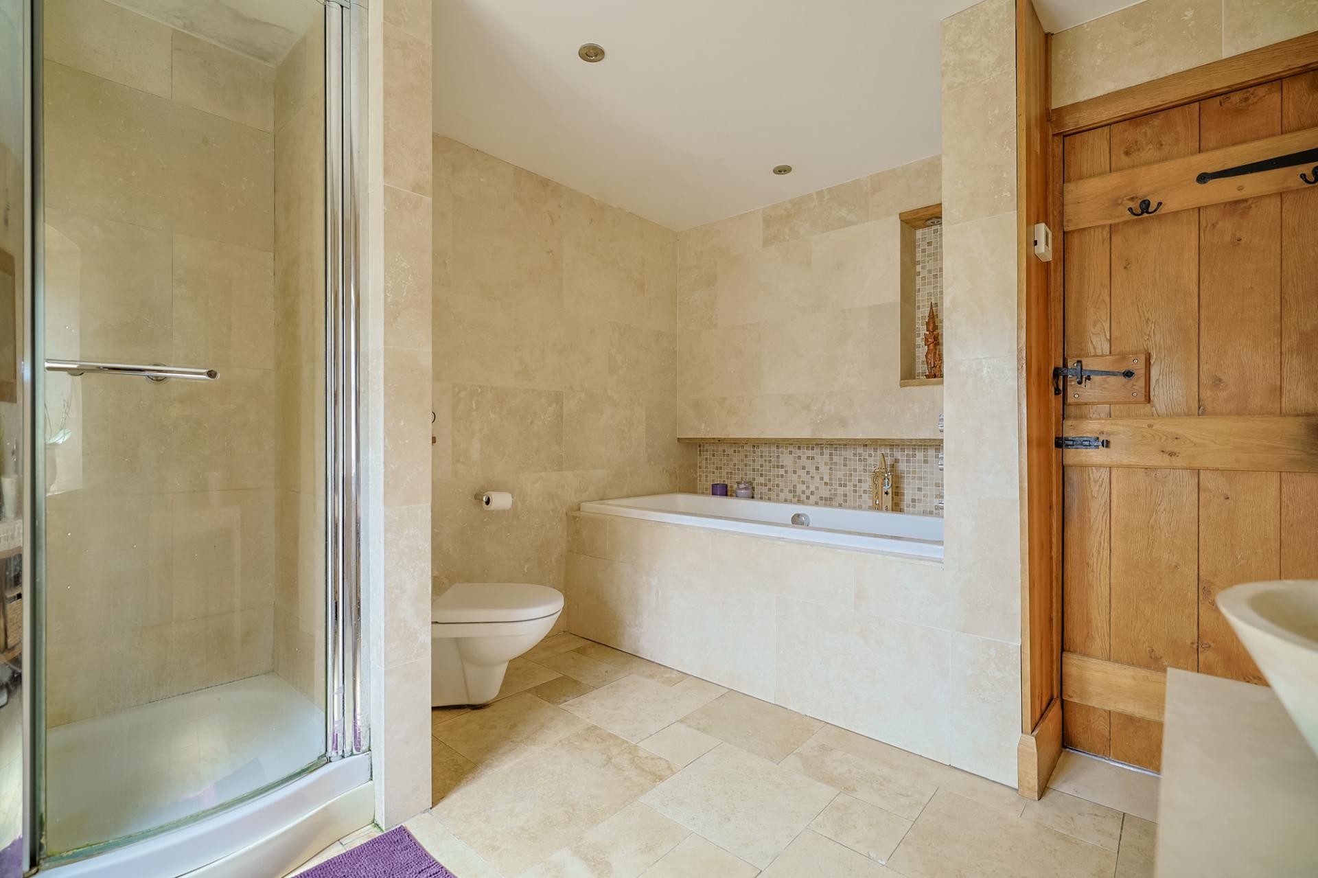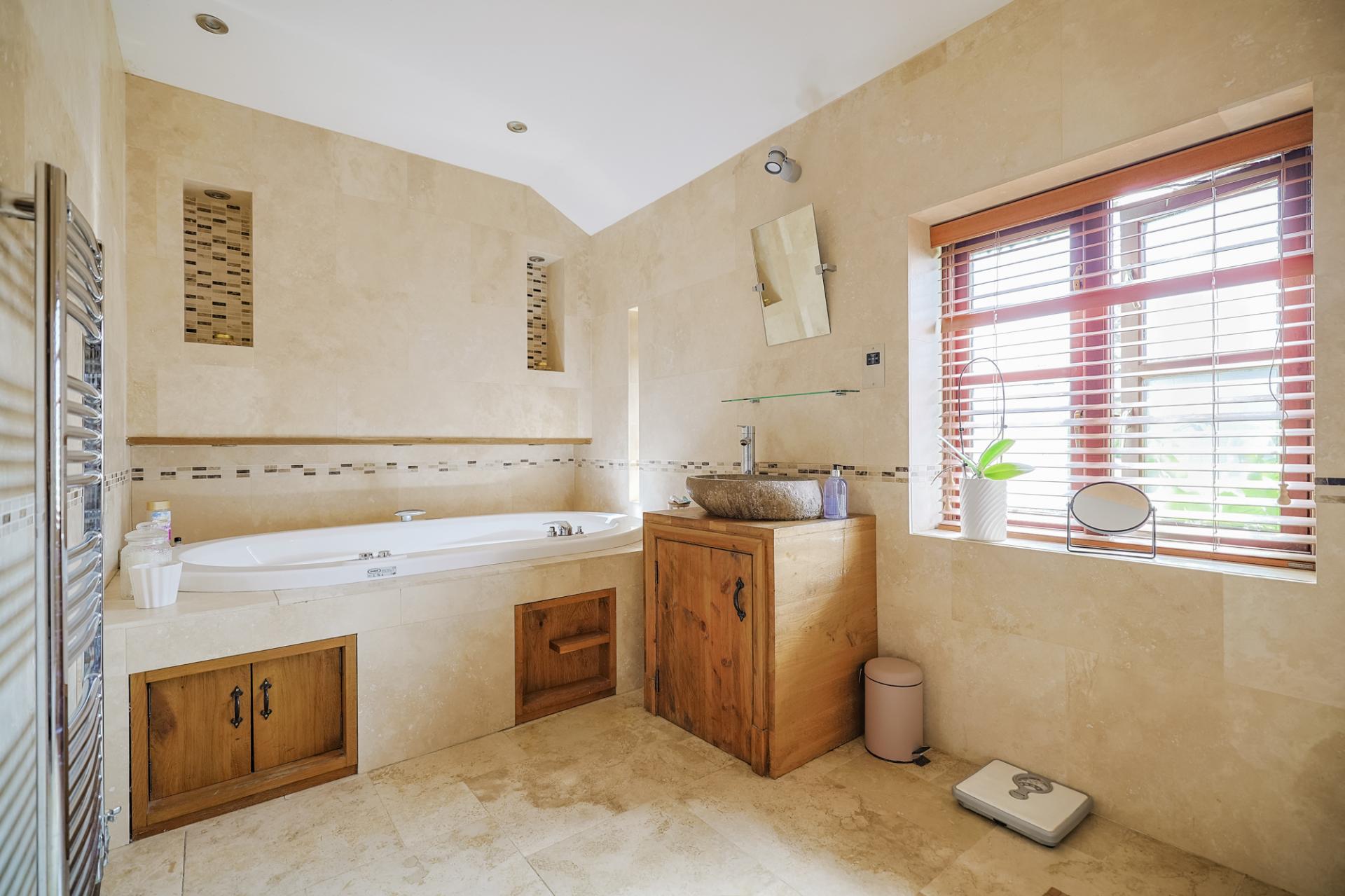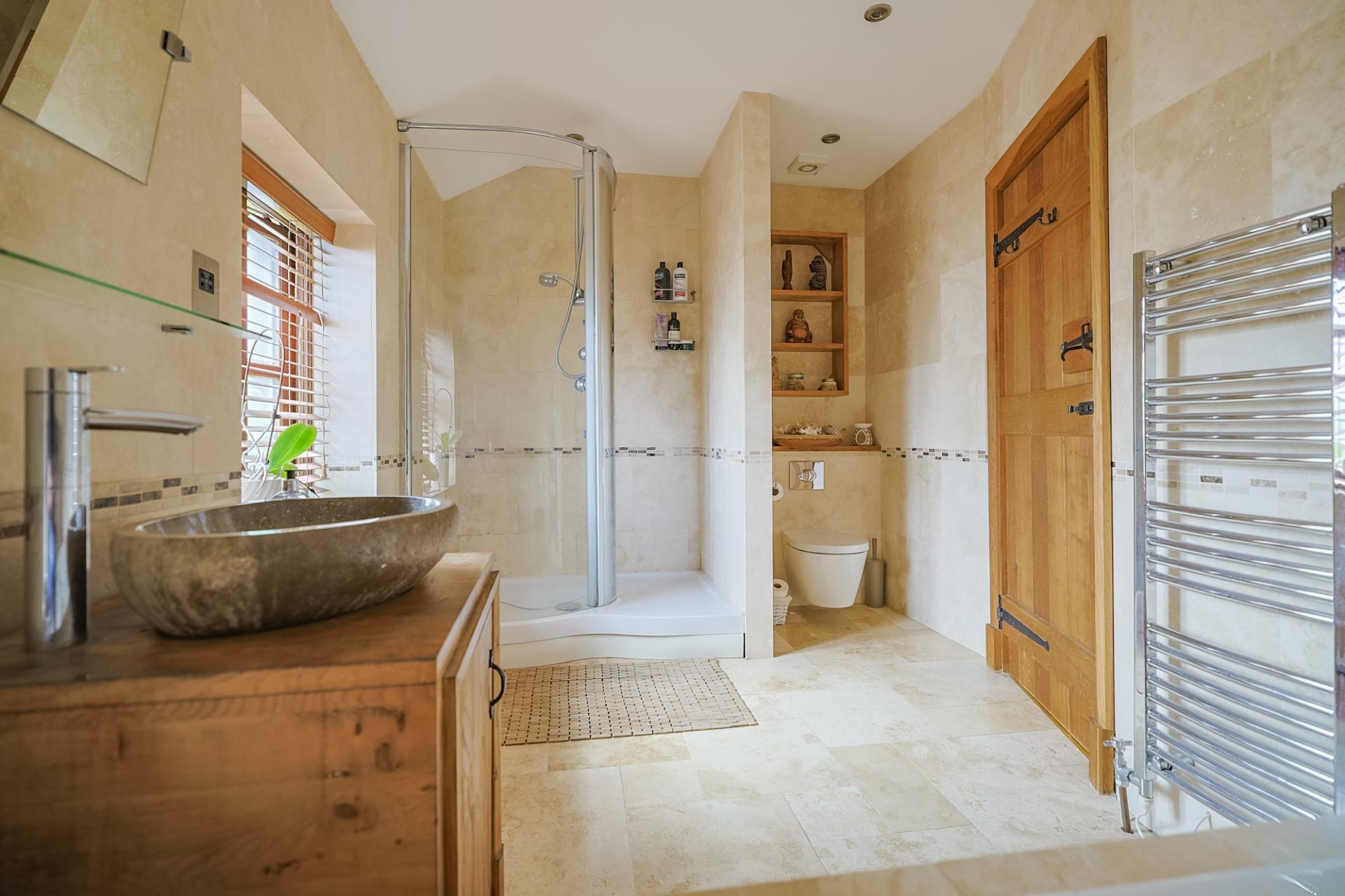 The stylish family bathroom is fully equipped with a WC, twin basins with shelving beneath, a Laufen bath, walk-in shower, inset shelf, twin shaving points, heated towel rail, spotlighting, tiled walls and floor, and a frosted window.