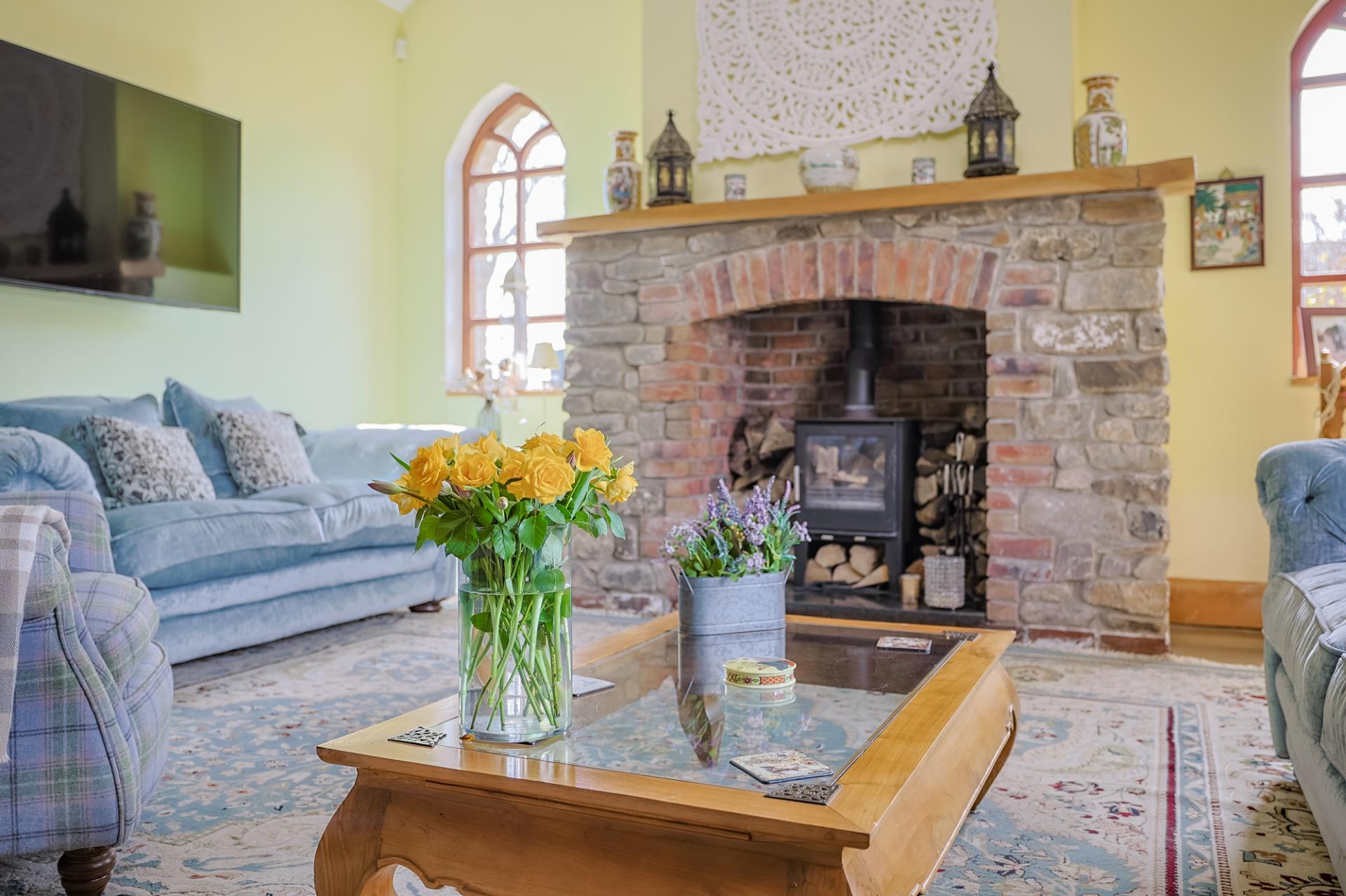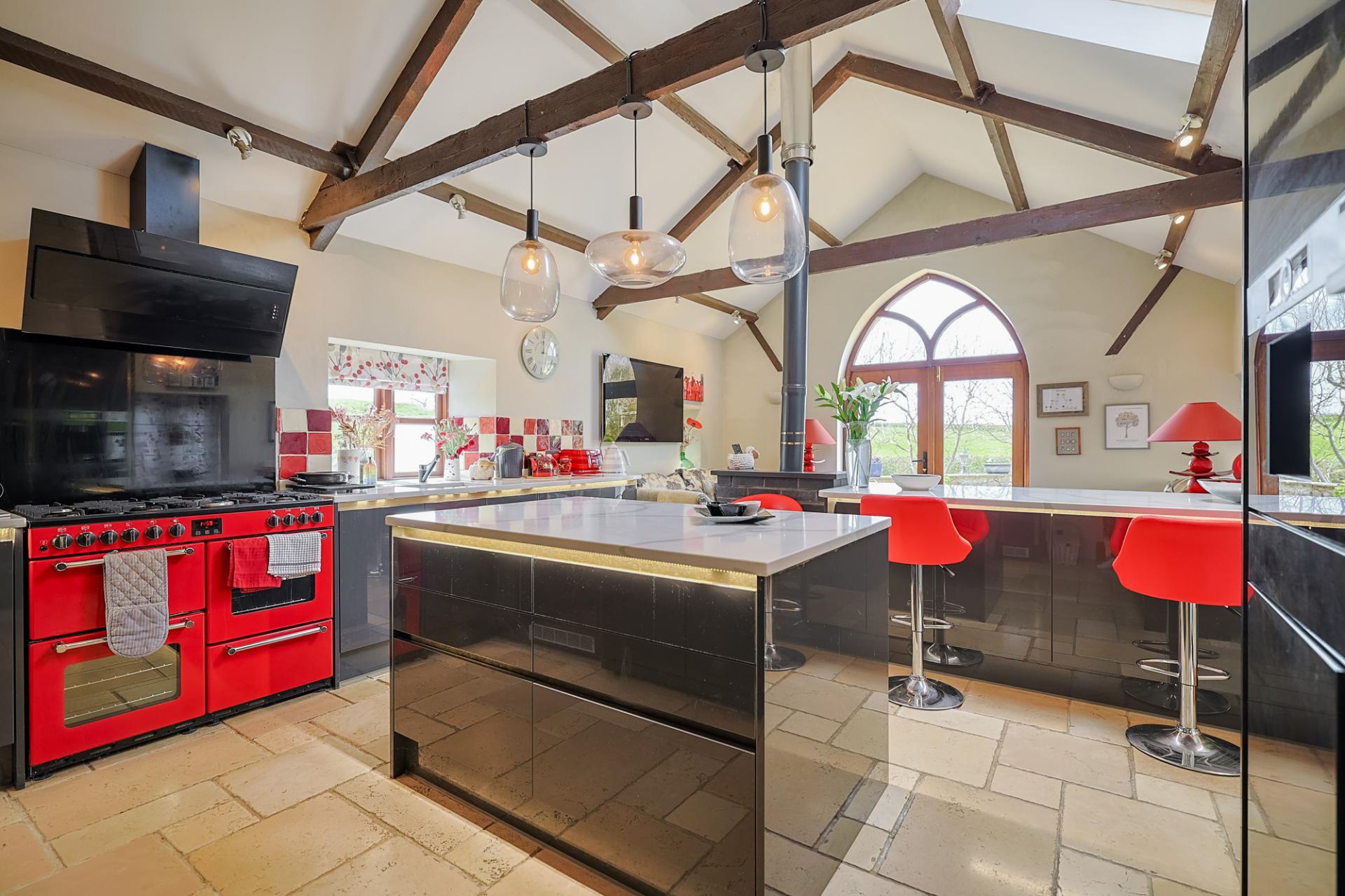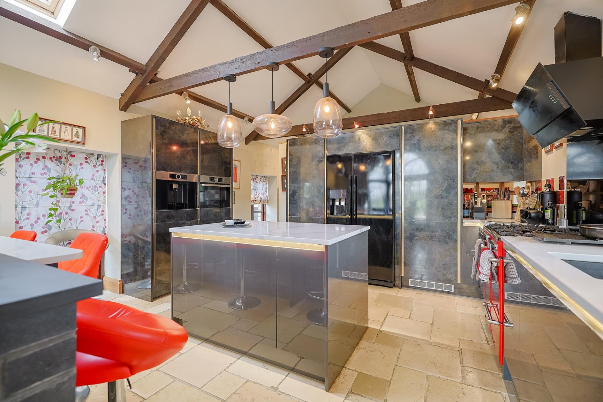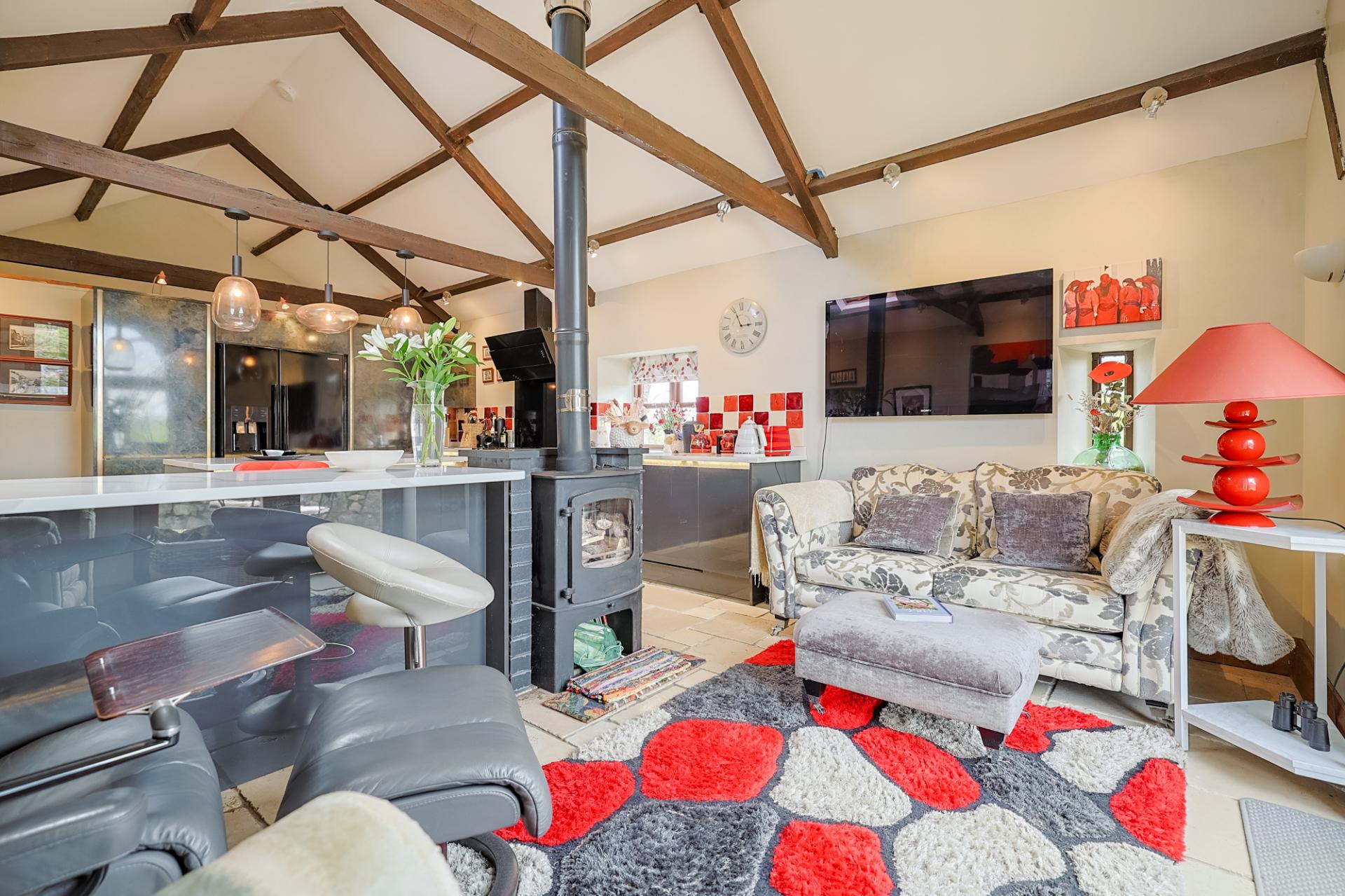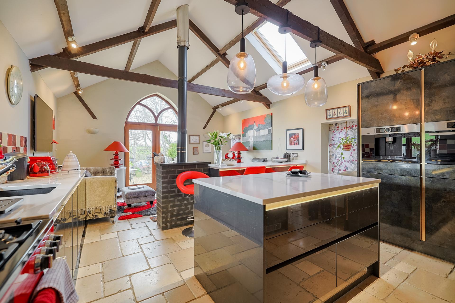 Journeying through the utility area, you enter a spectacular open-plan kitchen/breakfast/family room, the true heart of the home. Light floods the space via triple-aspect windows, two sets of double patio doors, and a Velux window. The windows to the front all framing views over the countryside and church. Vaulted ceilings with exposed beams add a sense of grandeur, while tiled floors provide practical charm. The kitchen is fitted with a range of tall and base units topped with Quartz worktops. Premium integrated appliances include a Belling double oven/grill, 7-ring gas hob with elevated extractor fan, Bosch coffee machine and microwave, AEG dishwasher, tall fridge and freezer, and space for an American-style fridge/freezer. A central island with Quartz worktop and feature lighting provides additional seating and storage. A cosy family area and a wood burner complete this inviting space.