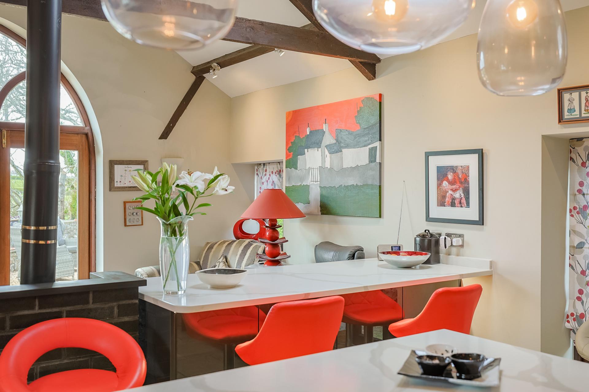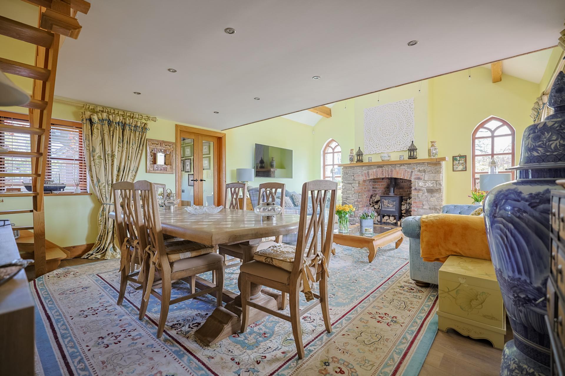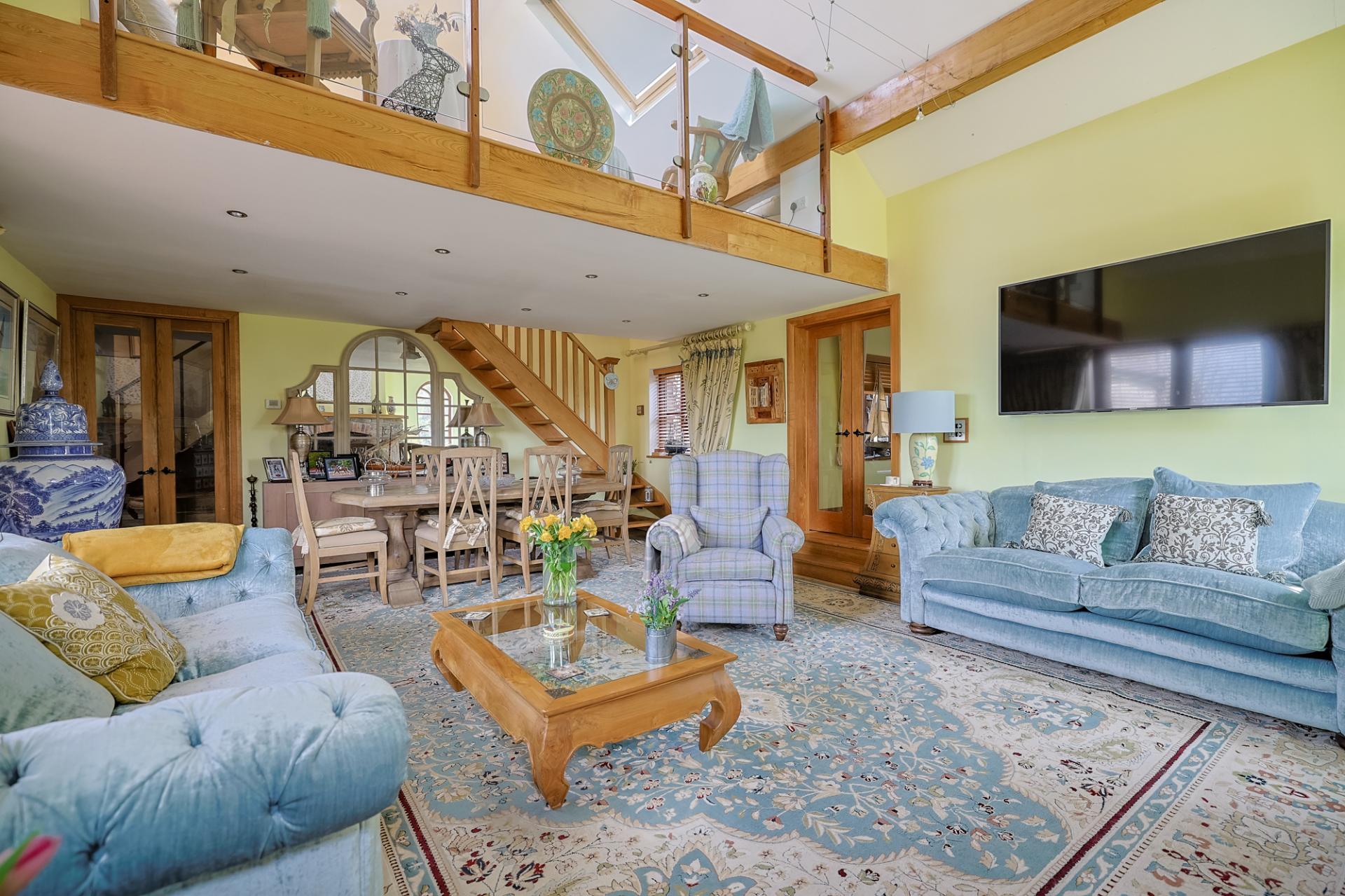 An outstanding space, the lounge impresses with its vaulted ceiling, exposed beams, and exceptional brightness thanks to triple-aspect windows. A stunning fireplace with a stone surround and oak mantle houses a cosy wood burner, an inviting centrepiece. The room features stylish LVT flooring, spotlighting, and access to the inner hallway as well as an oak stairway leading to the mezzanine study.