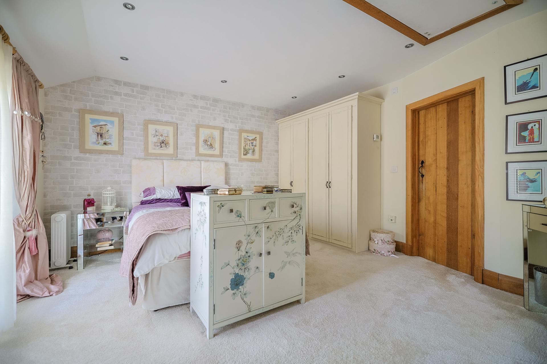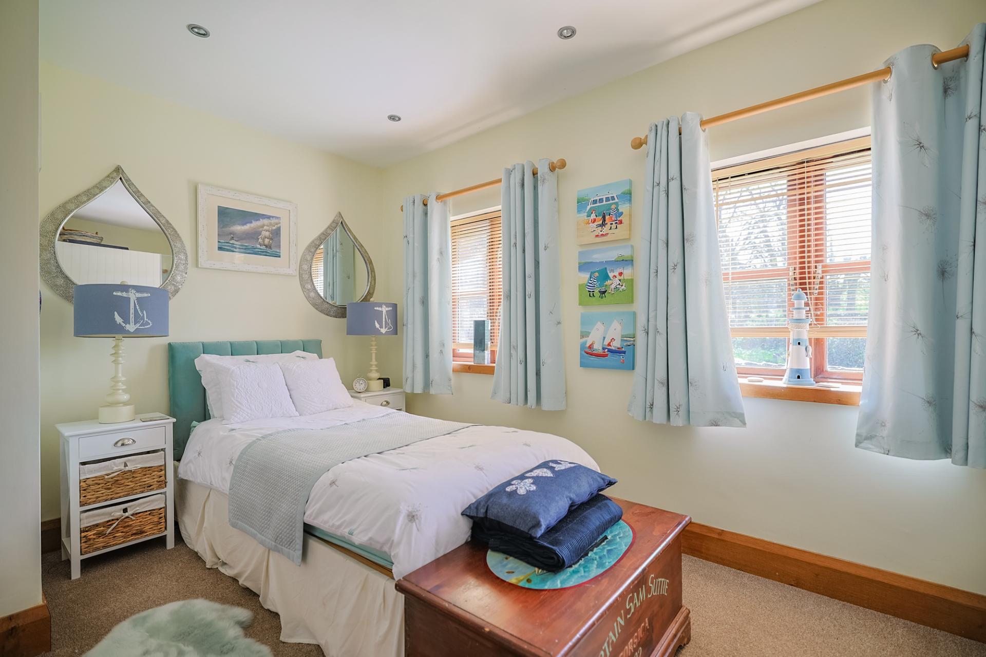 To the rear of the home, Bedroom Four is a bright single room with twin rear-facing windows that perfectly frame the view of St Davids Llanddewi Church. Finished with carpet and spotlighting.