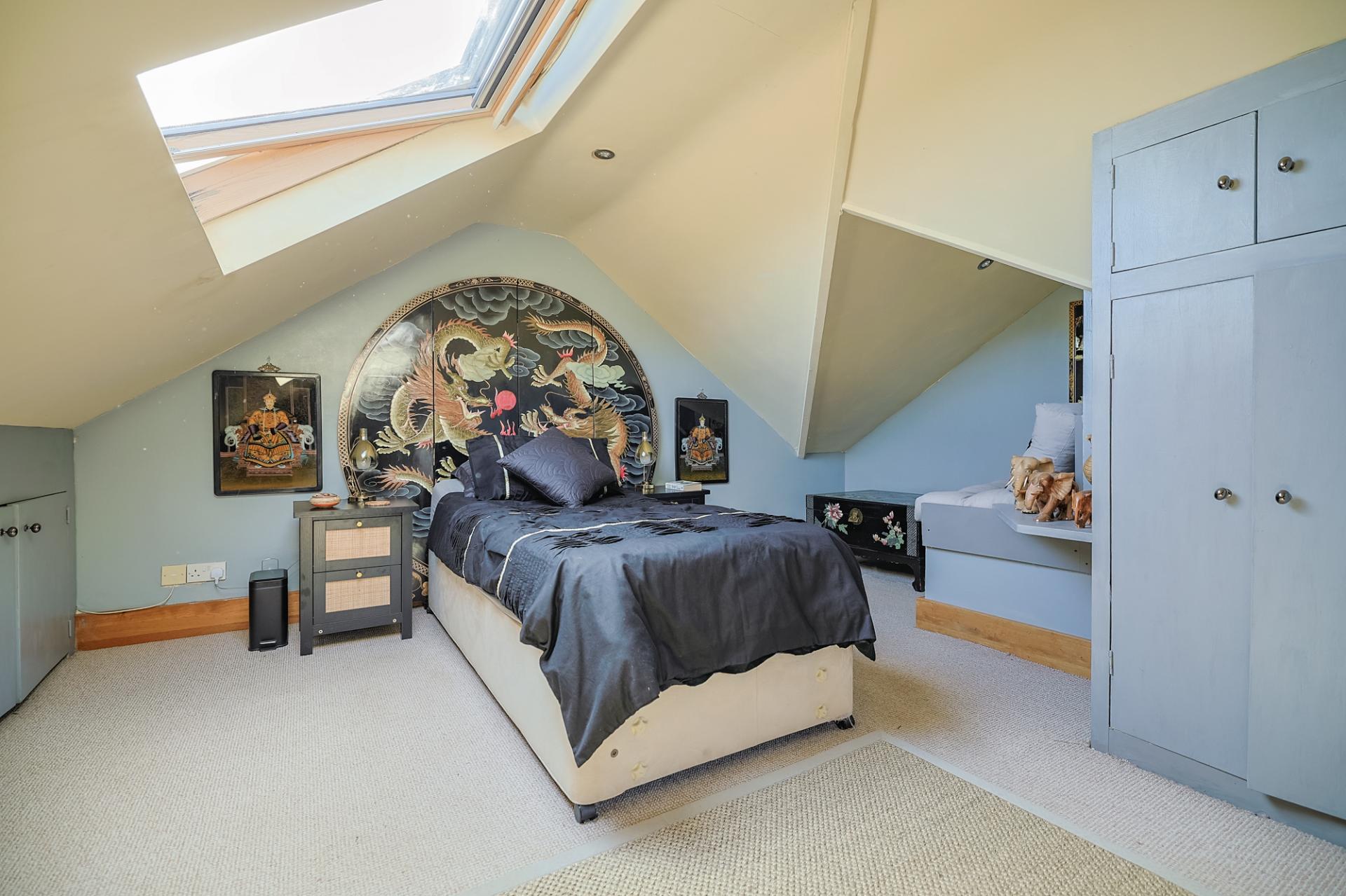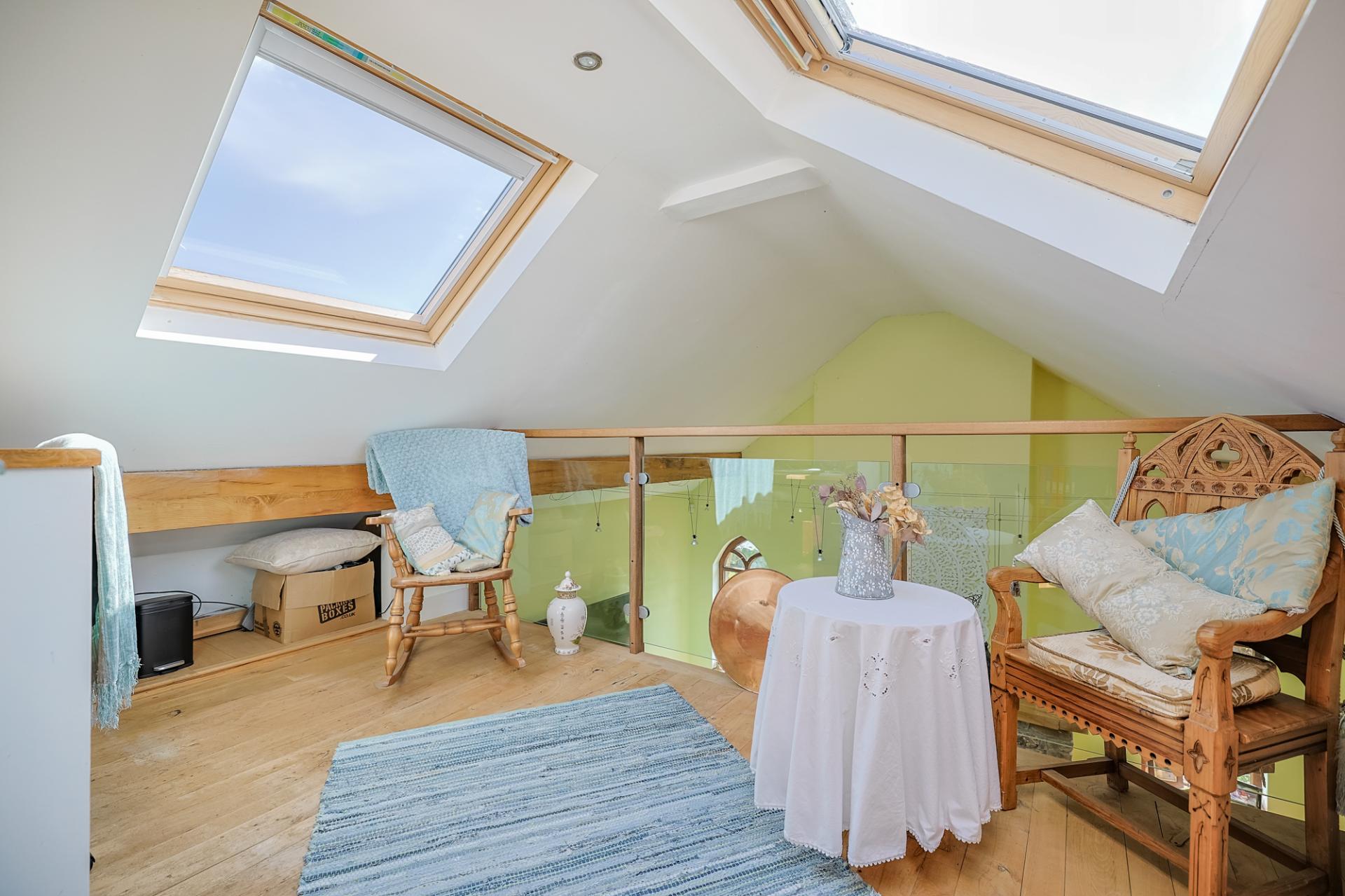 The oak staircase ascends to a charming mezzanine study overlooking the lounge below through a glass balustrade. With oak flooring, spotlighting, a vaulted ceiling, and two Velux windows, this is a superb space for working or reading in peaceful surroundings.