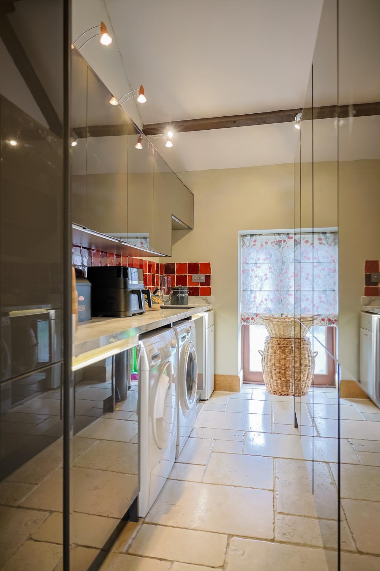 The utility space is well-equipped with tall, wall and base units, a Blanco sunken sink, space for two undercounter appliances and one slimline appliance, and has double patio doors at either end offering direct garden access.