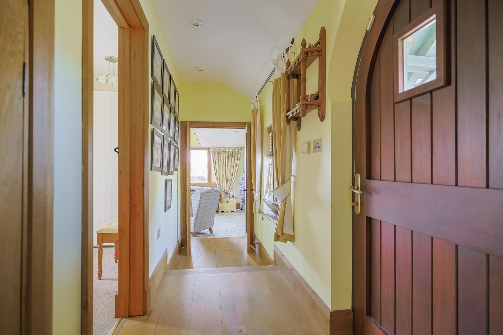 The inner hallway links the lounge with the book room/bedroom two, the family bathroom, utility, and stairway to bedroom three. Here you will find oak flooring, a vaulted ceiling, a bright window, and access to a mezzanine storage cupboard, all enhancing the home’s sense of space and character.