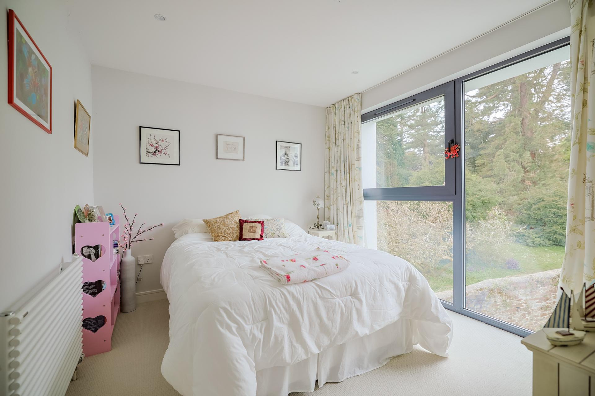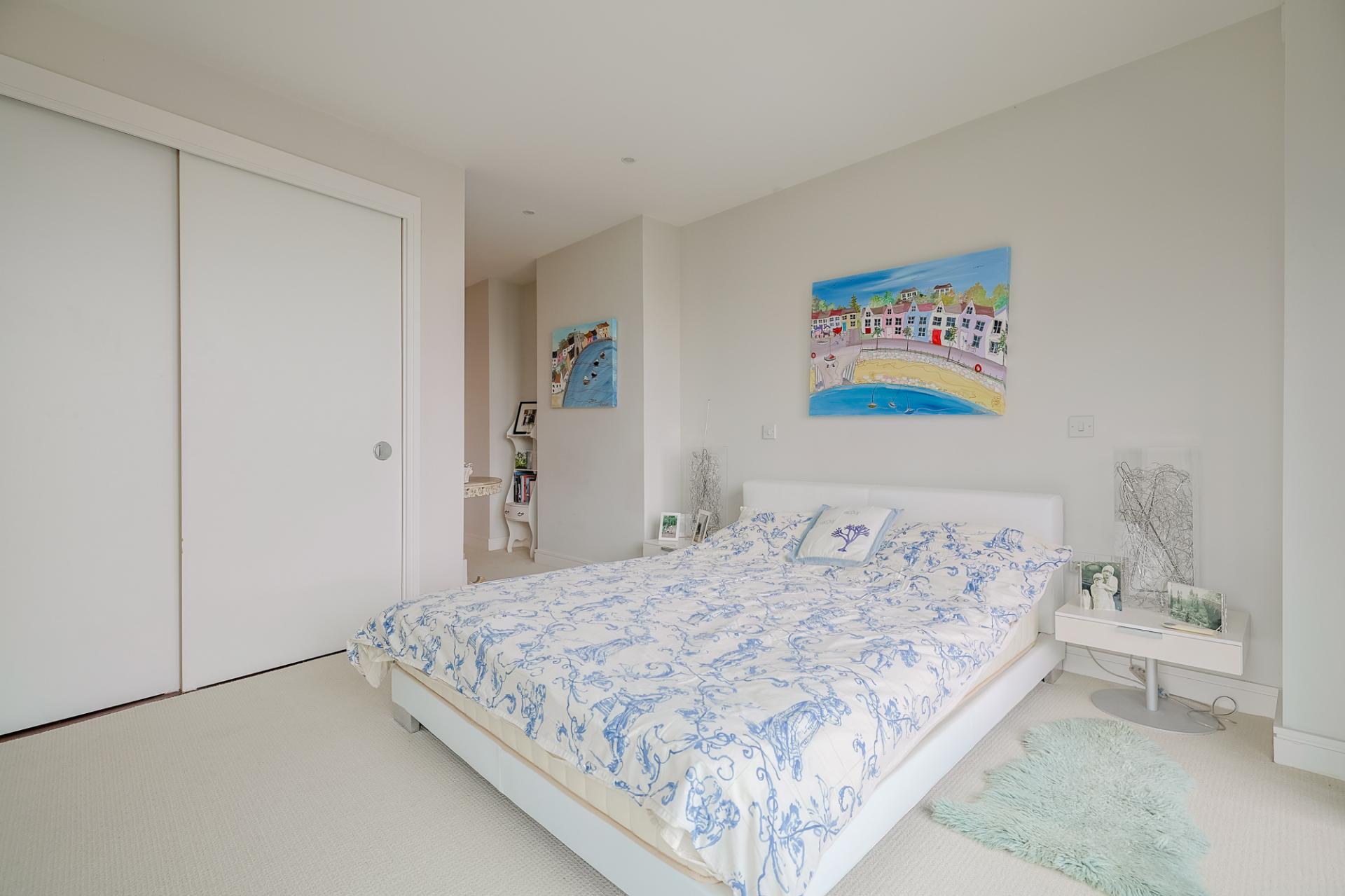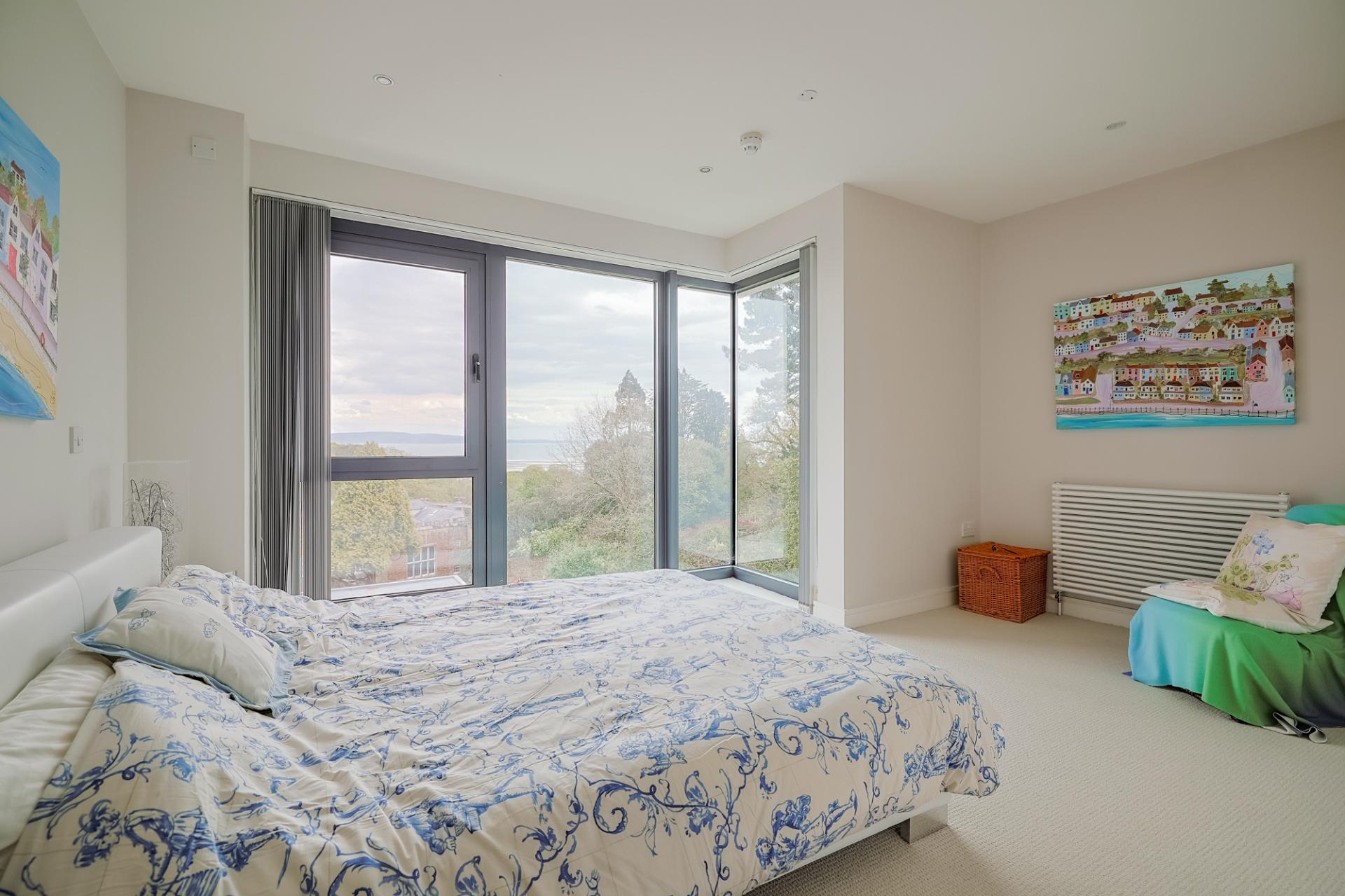 A large, light-filled double bedroom with floor-to-ceiling corner window showcasing spectacular views. Complete with triple built-in wardrobes and a luxurious en-suite furnished with a WC, twin wash basin, fitted bath with hand-held shower head, large walk-in shower, heated towel rail, tiled flooring, part tiled walls, extractor fan, and spotlighting.