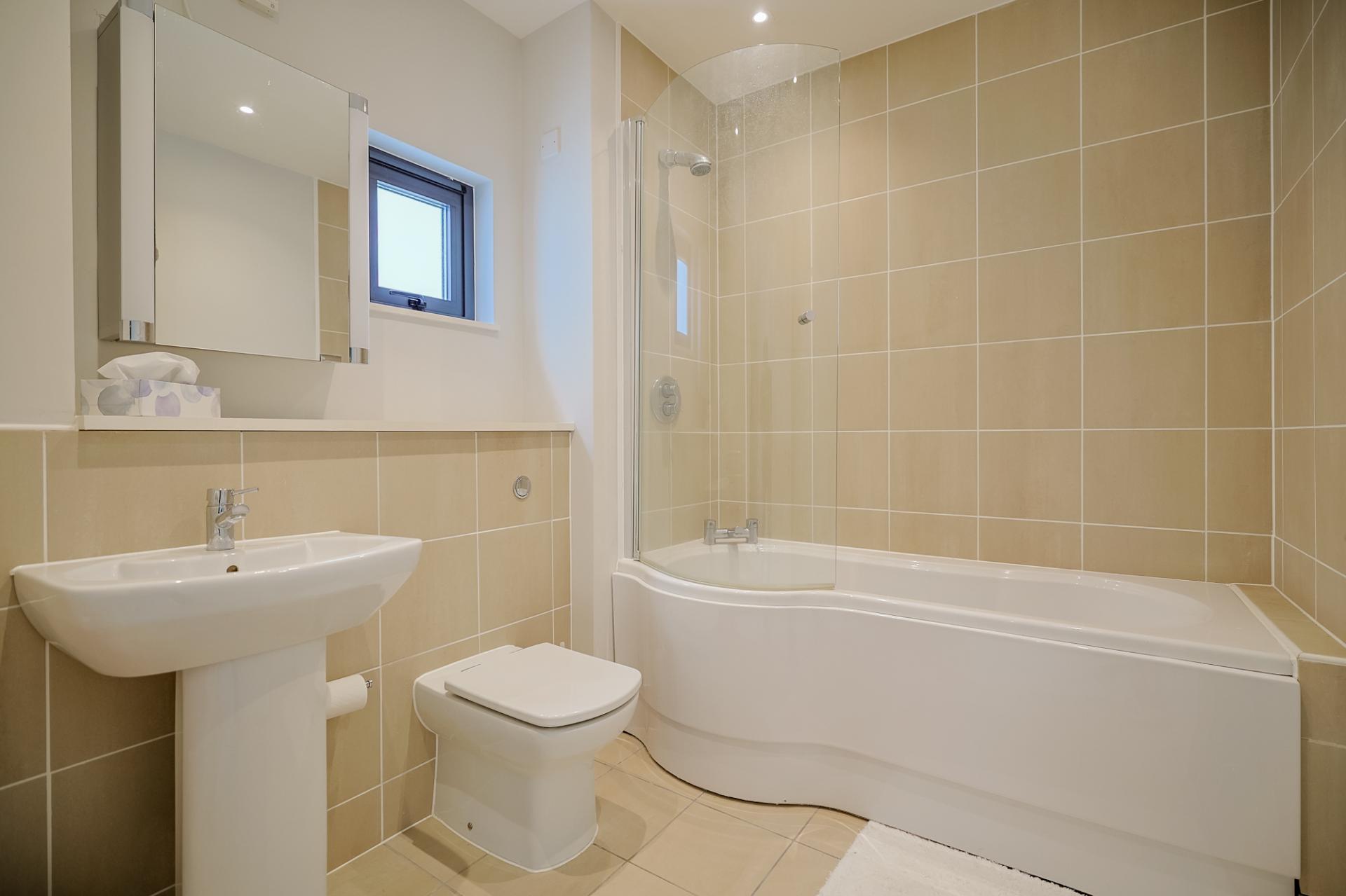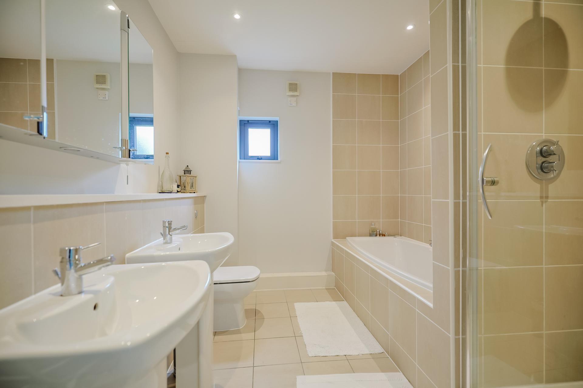 Modern and well-equipped with a WC, wash basin, fitted bath with shower unit, heated towel rail, tiled flooring, part tiled walls, extractor fan, spotlighting, and a window to the side.