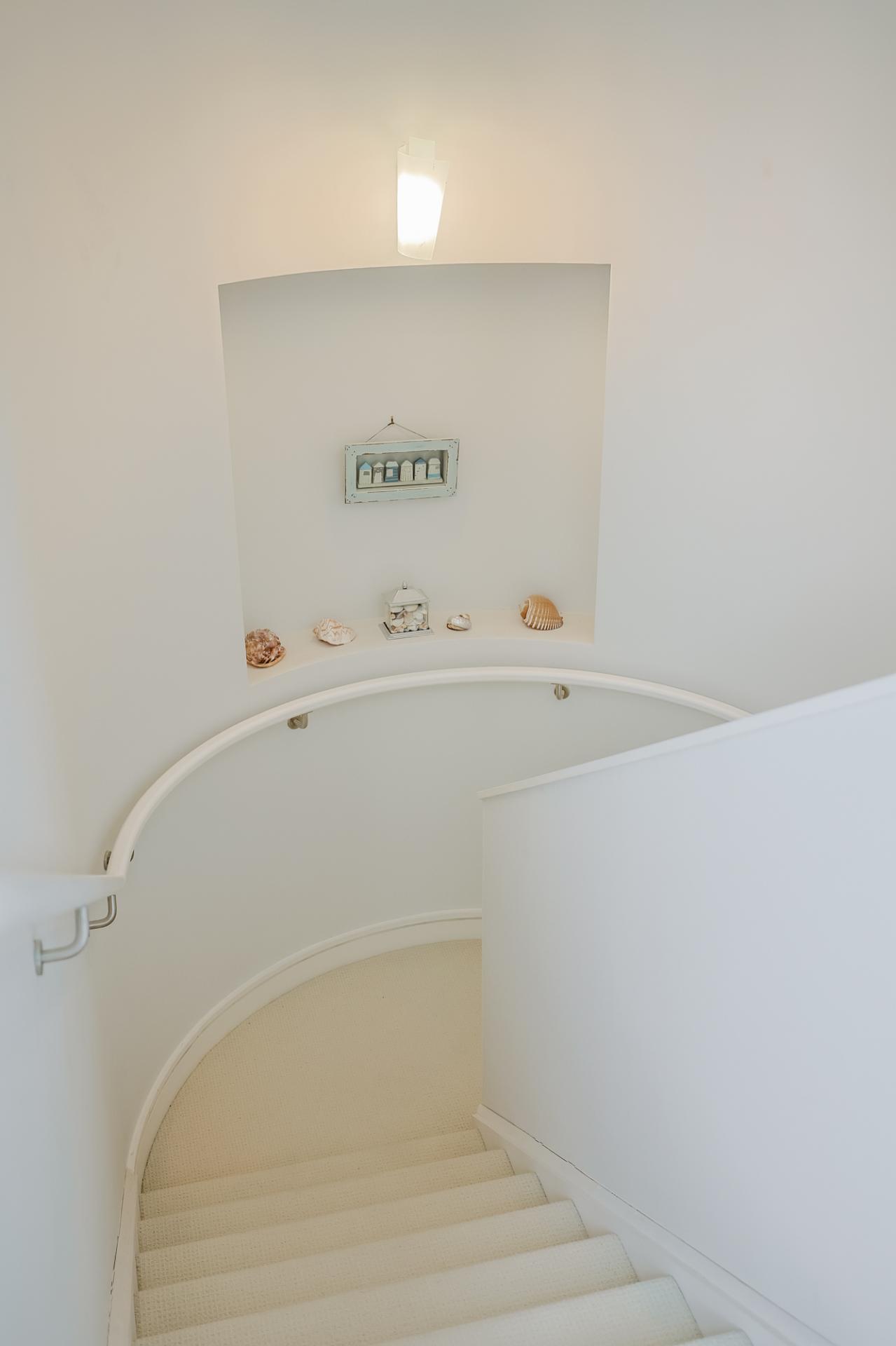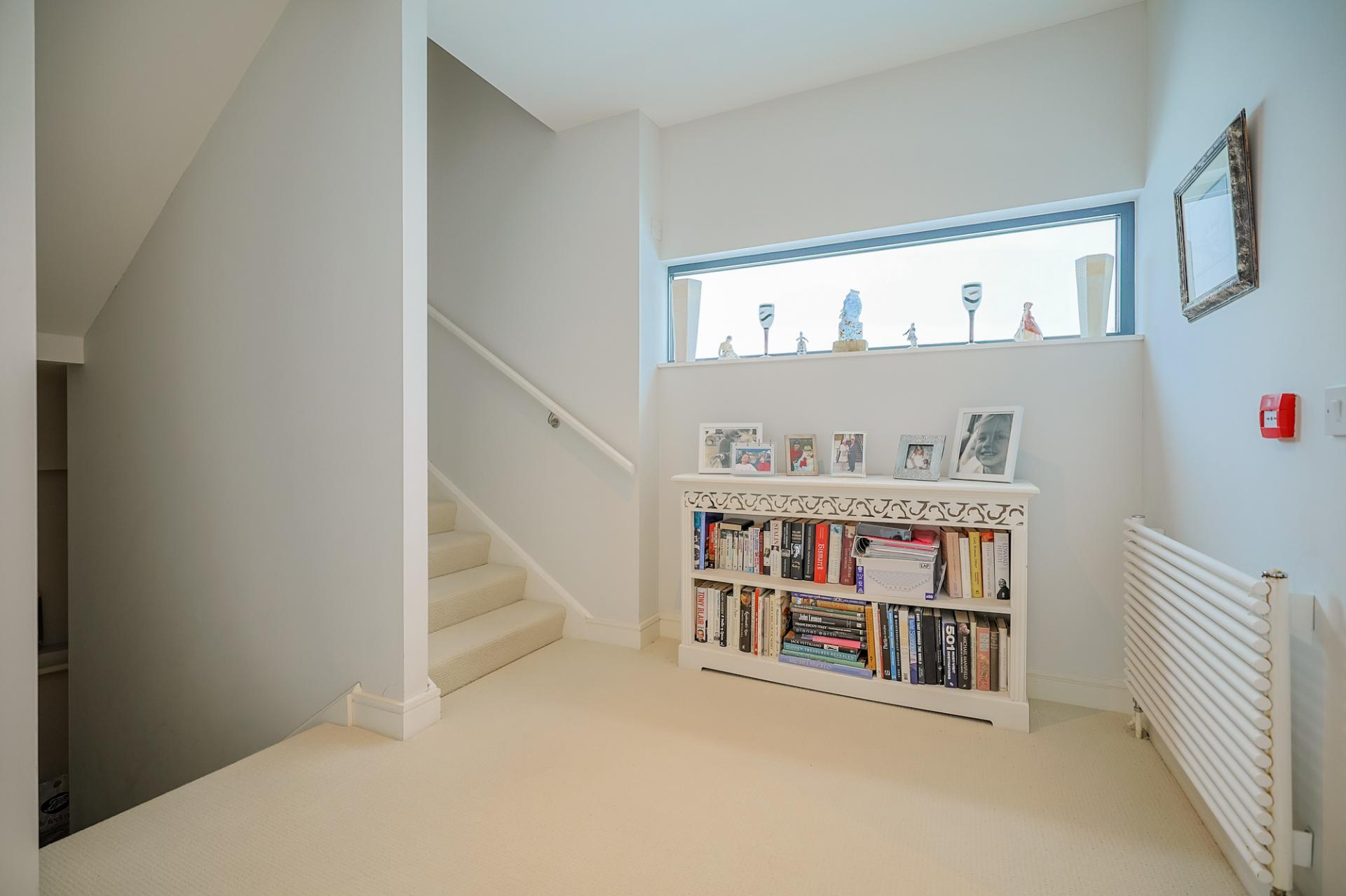 Ascending the carpeted staircase to the second floor, you are greeted by another bright and spacious landing, beautifully illuminated by two feature windows. A designer radiator adds a contemporary touch, while the audio intercom system continues the home’s theme of modern convenience. From this central landing, you’ll find access to all four bedrooms, the family bathroom, and the staircase leading to the spectacular rooftop terrace.