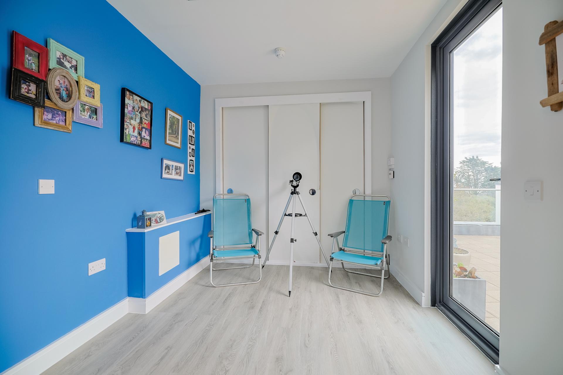 Now, let us ascend the carpeted staircase to the uppermost level of this exceptional home, where you’ll discover a spacious and versatile area laid with stylish LVT flooring. A triple-door storage cupboard provides practical convenience, while two sets of doors invite you out onto the breath-taking rooftop terrace. From this elevated vantage point, enjoy sweeping, ever-changing views across Clyne Gardens, Mumbles and Swansea Bay, a truly unforgettable panorama.