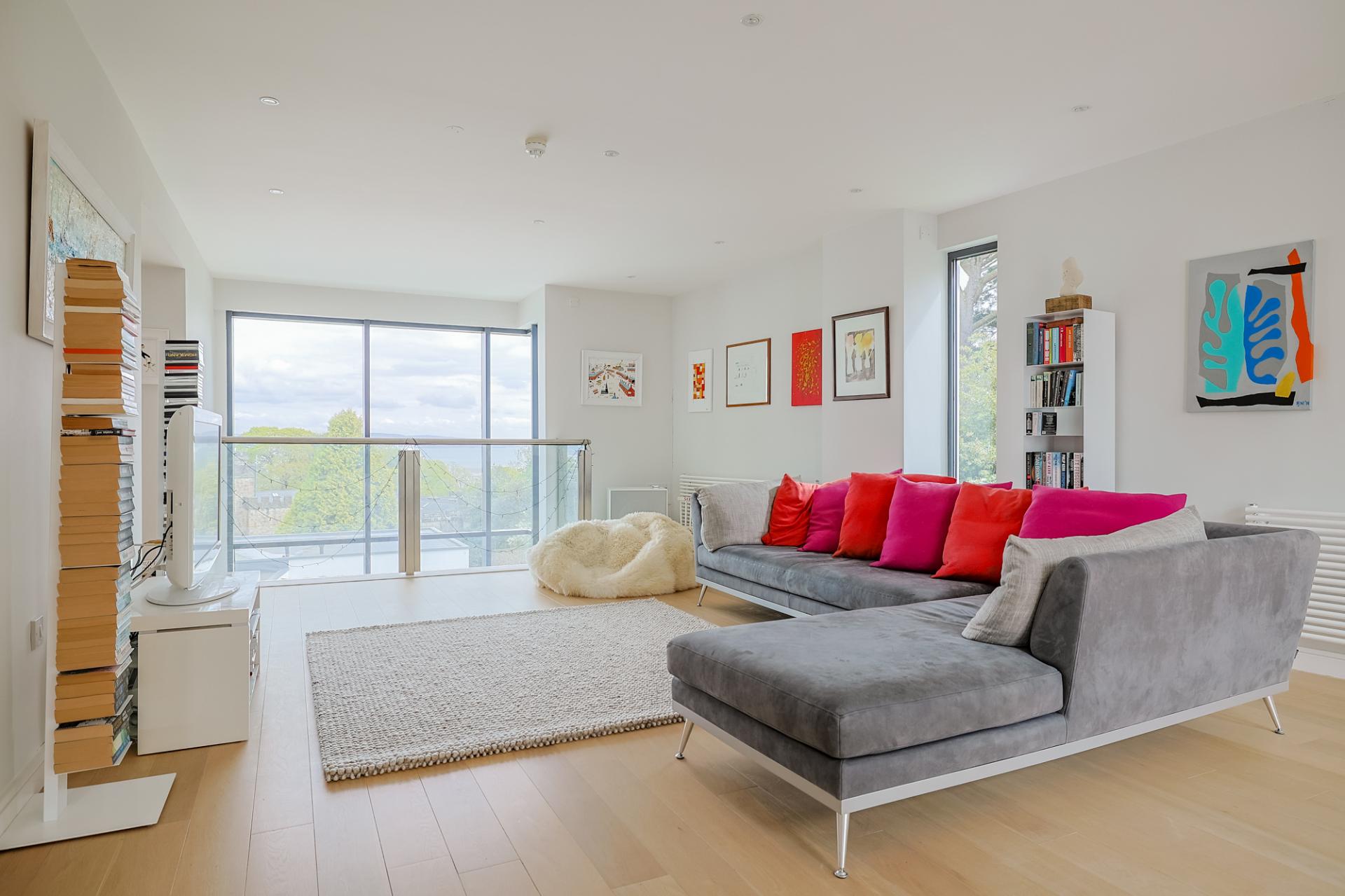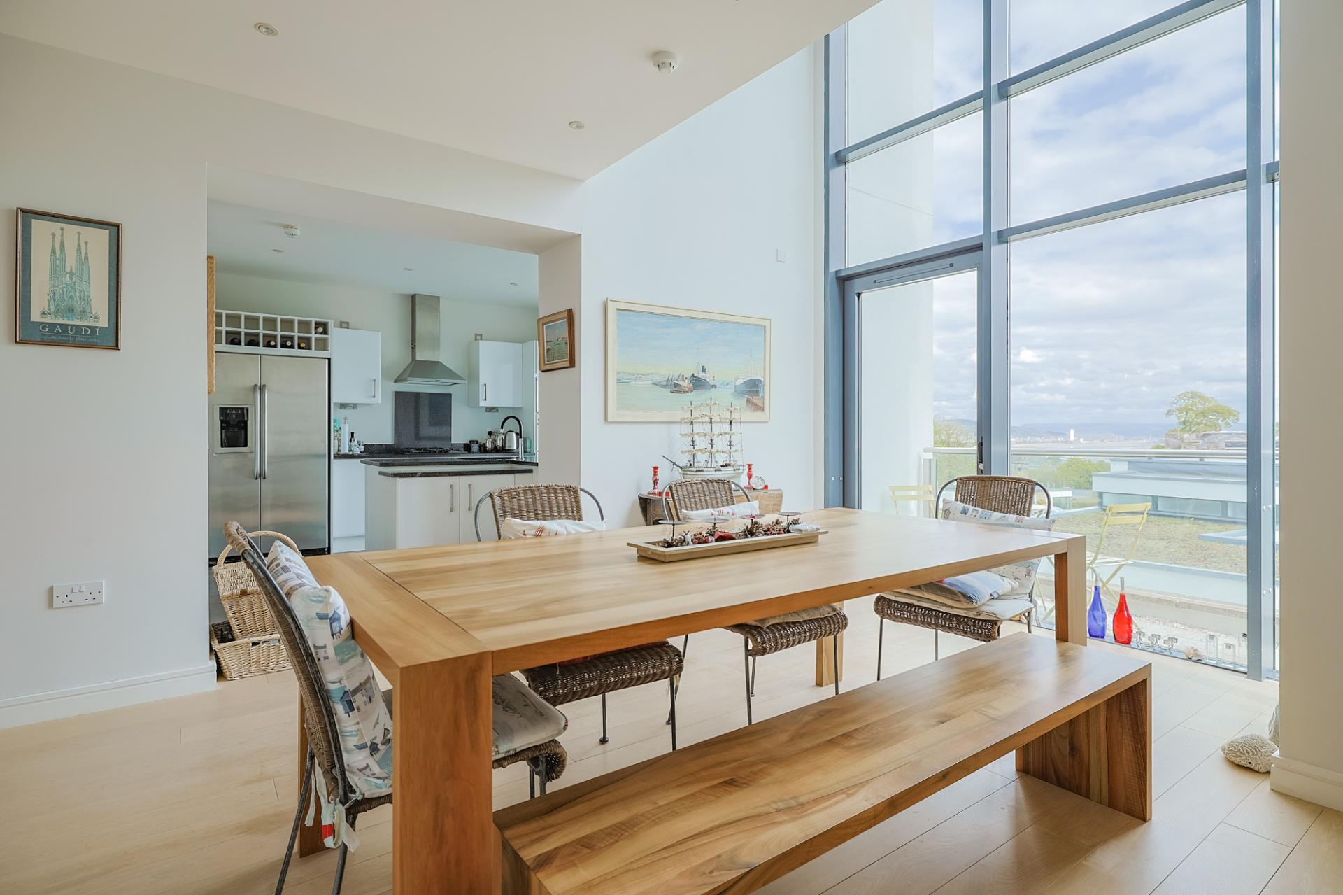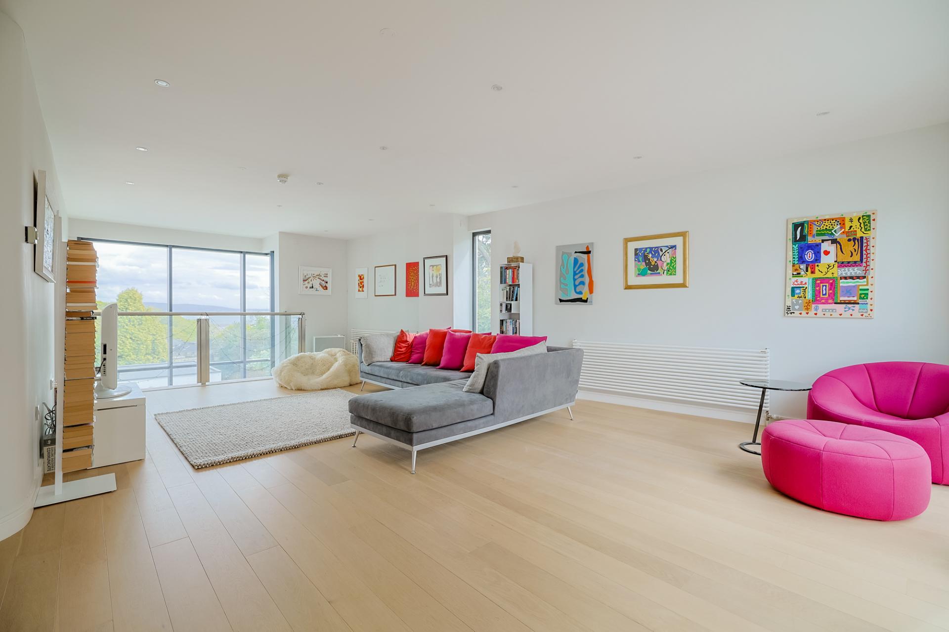 An incredible, light-filled space with double-height feature window and a patio door leading to an elevated glass-balustrade terrace, perfectly positioned to take in the views. The area benefits from underfloor heating, spotlighting, and luxurious oak flooring throughout.