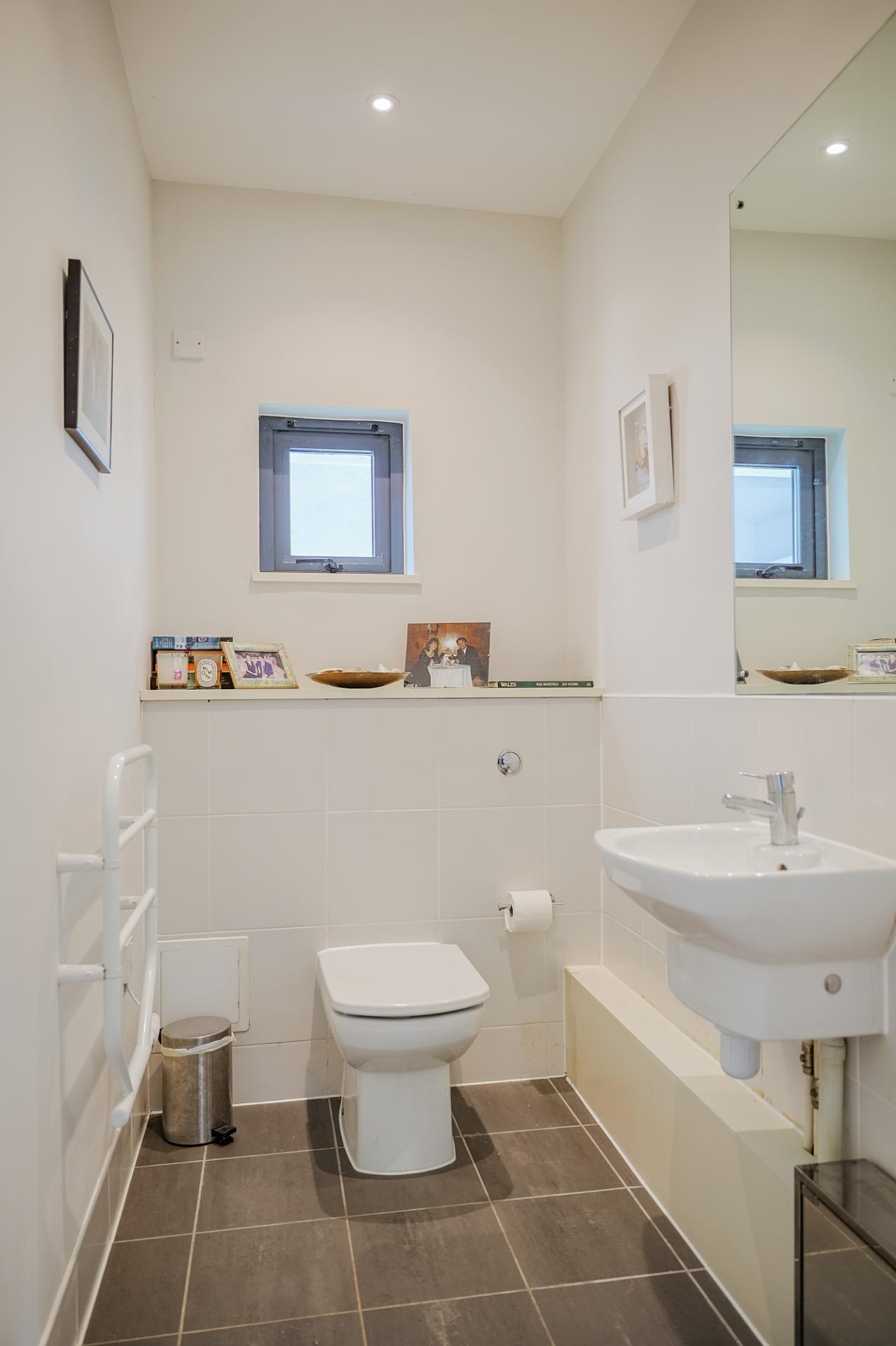 Bright and spacious, featuring a stylish radiator, lovely feature window, and an additional cloakroom with WC, wash basin, heated towel rail, generous storage, tiled flooring, part tiled walls, and a window to the side.