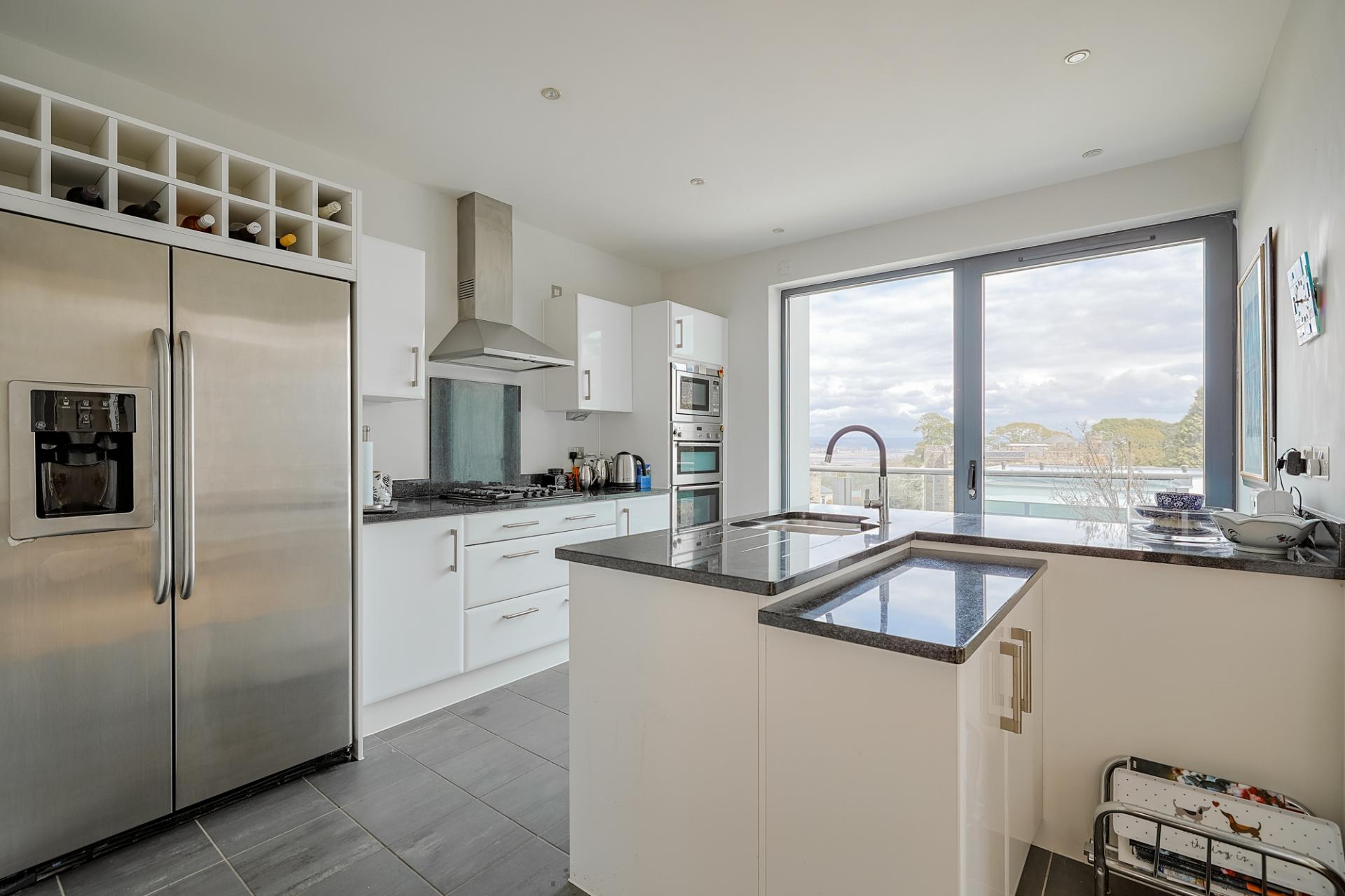 The sleek kitchen is fitted with granite worktops and an array of high-spec NEFF integrated appliances, including an oven, grill, microwave, gas hob, and extractor. There's ample room for a large American-style fridge/freezer, as well as a central island with double stainless-steel sunken sink, NEFF dishwasher, waste disposal, and additional storage. From here you have direct access out to an additional elevated patio area with glass balustrade where you can enjoy the ever-changing outlooks via a glass patio door.