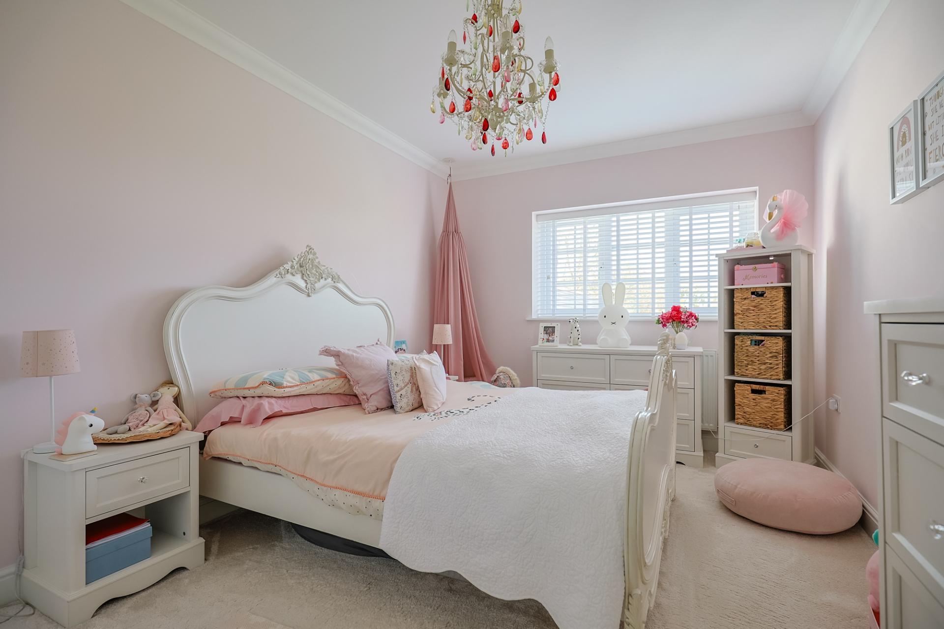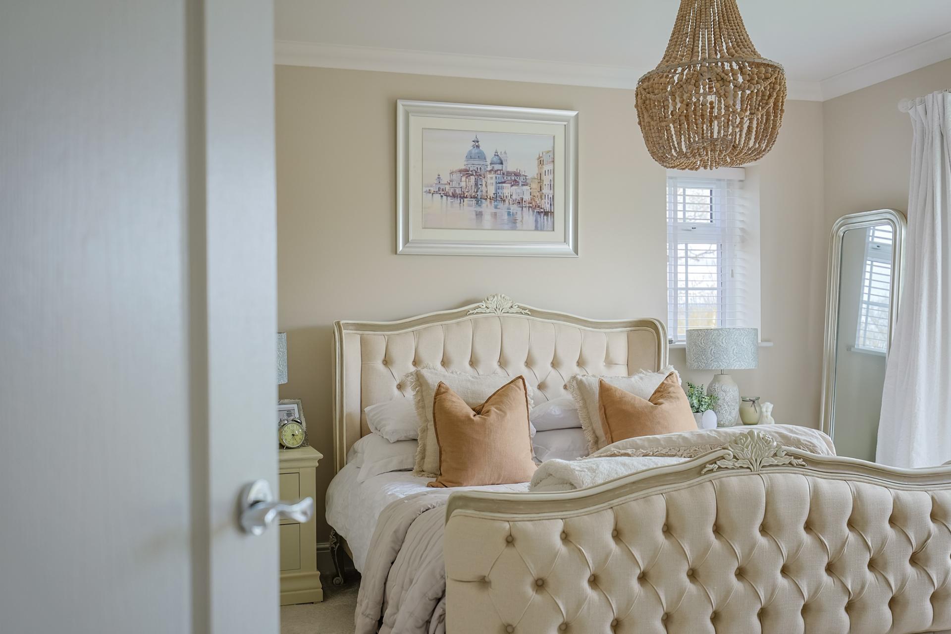 A spectacular and spacious room featuring a window to the side and a Juliet balcony with flanking windows to the front, allowing for stunning rural views and an abundance of natural light. This suite enjoys carpeting, coving, and a dedicated dressing area with an array of fitted Hammond wardrobes, hanging rails, shelving, and drawers. The private en-suite houses a WC, Waverley wash basin, feature bath, heated towel rail, mirrored TV, tiled flooring, coving, and a frosted window to the side.